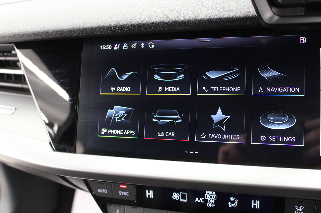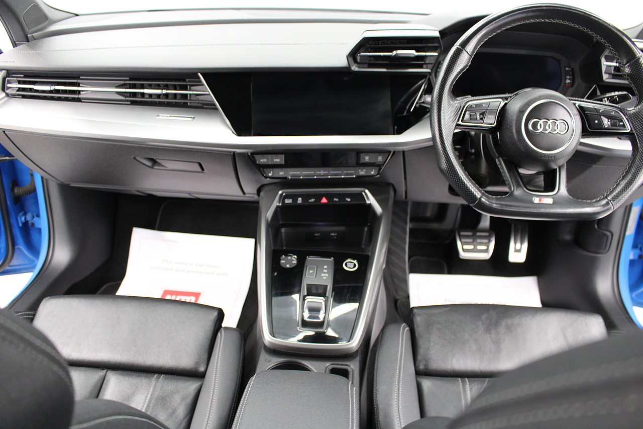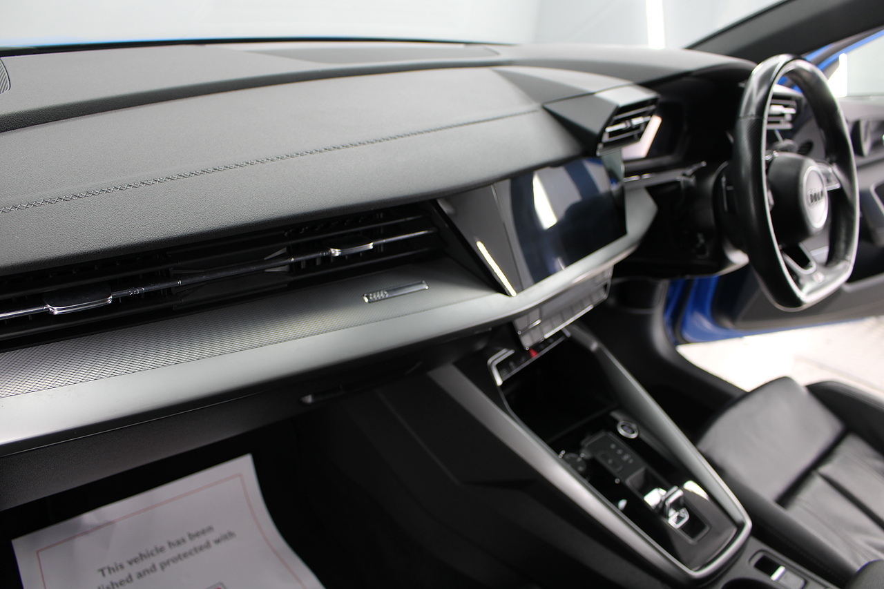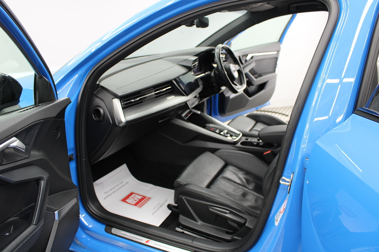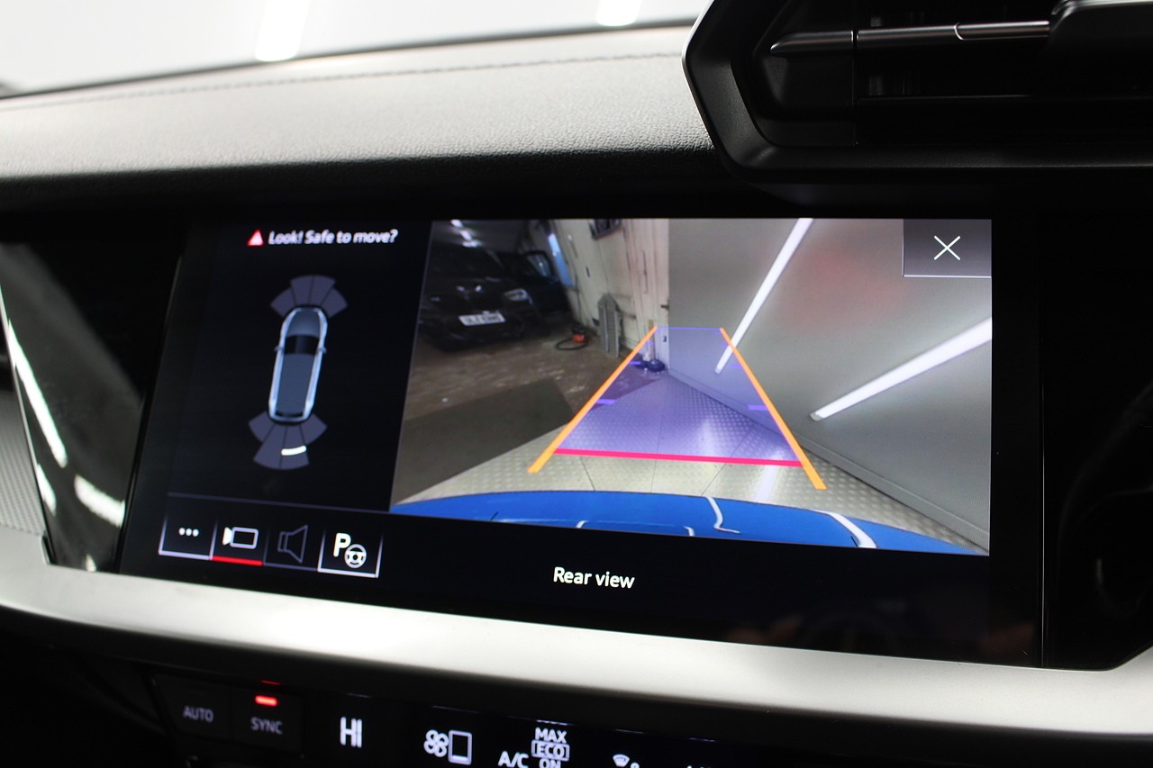 The specifications of this A3 are, black leather interior trim, pop up media screen, satellite navigation, DAB radio, apple car play, android auto, parking sensors with rear camera, electric door mirrors, steering wheel mounted controls, Bluetooth pairing ability, sports steering wheel, cruise control, front sports seats and ISOFIX child seat bases.