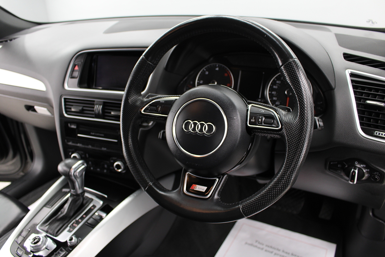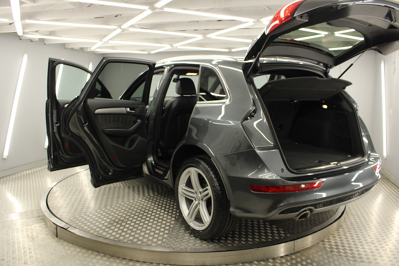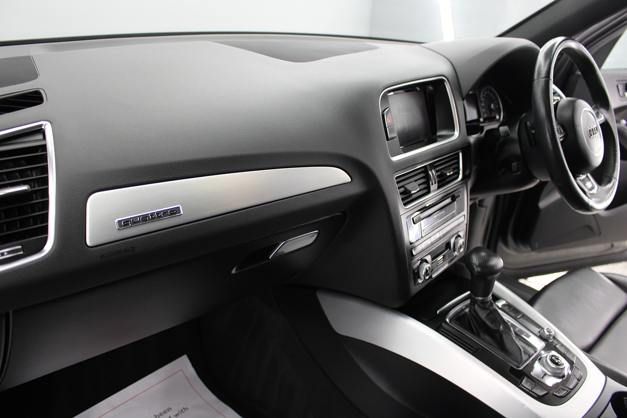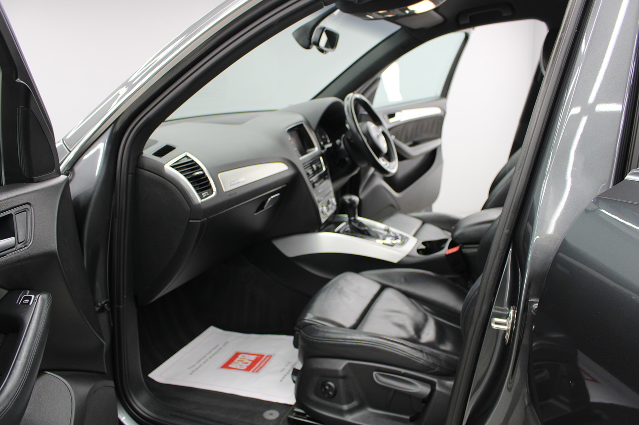 This Q5 does comes trimmed in black leather with heated front seats, dual zone climate control, cruise control, premium sound system, DAB radio and satellite navigation, Bluetooth connectivity, steering wheel mounted controls, headlight and rain sensors, rear and forward parking aid, power operated tailgate, 12v power adapter and ISOFIX anchorage points.