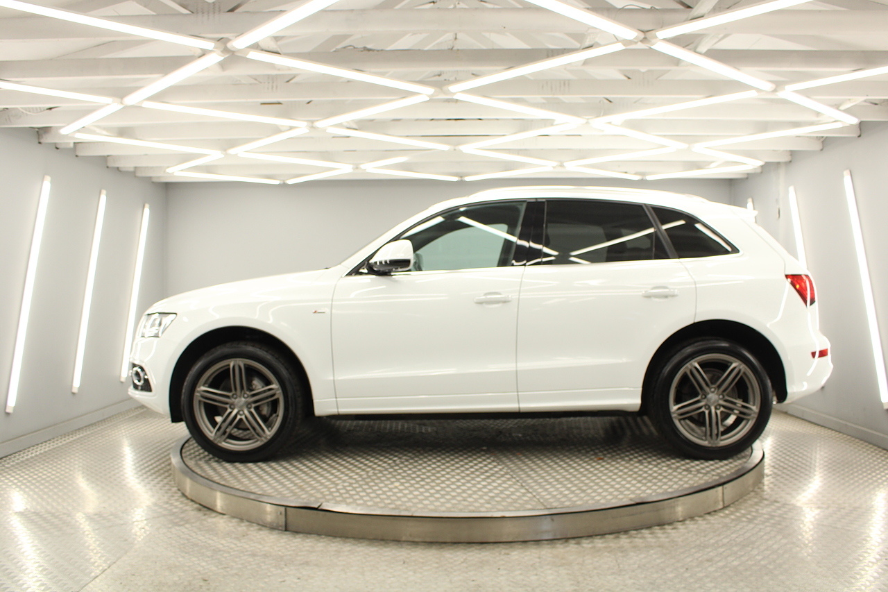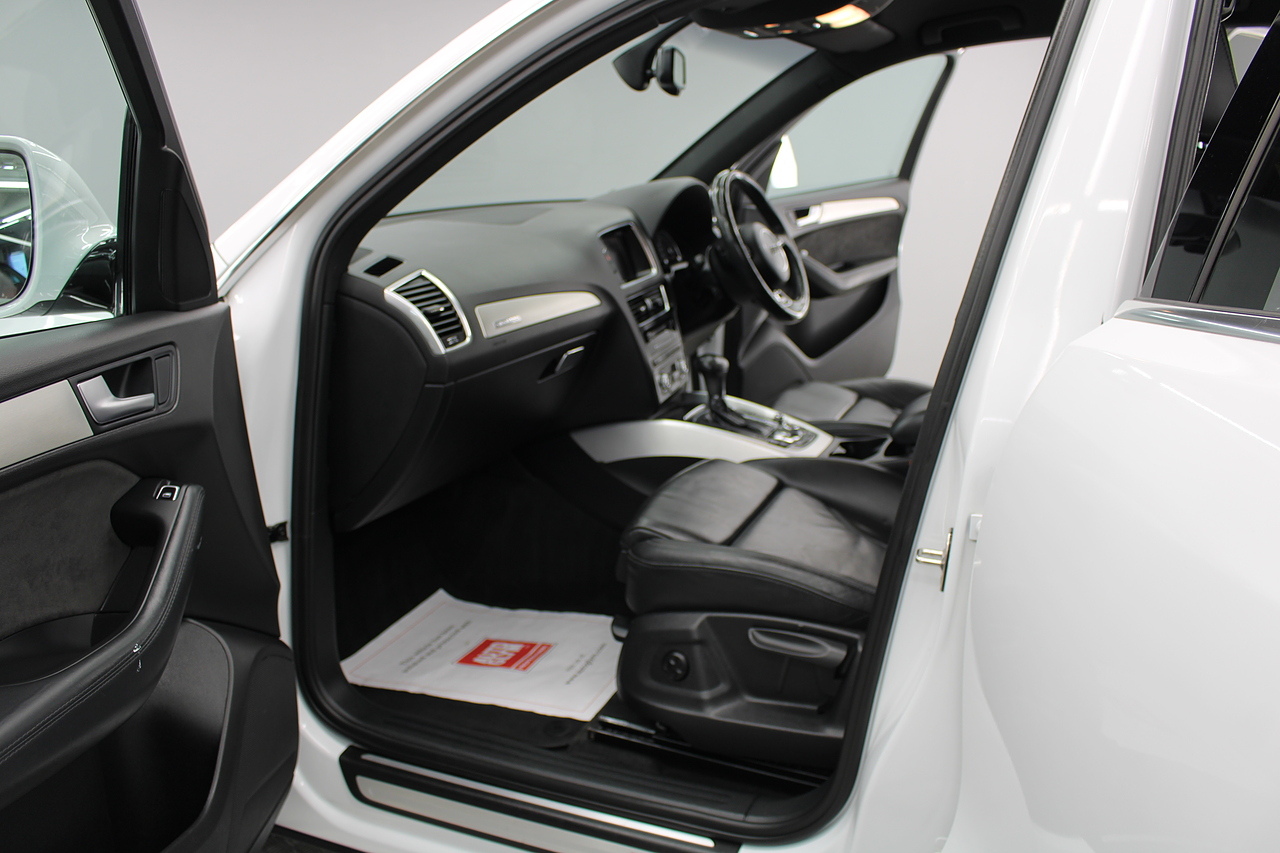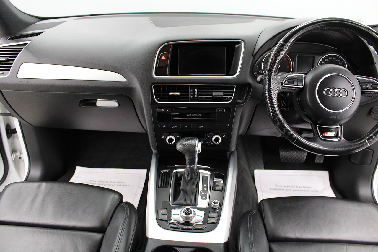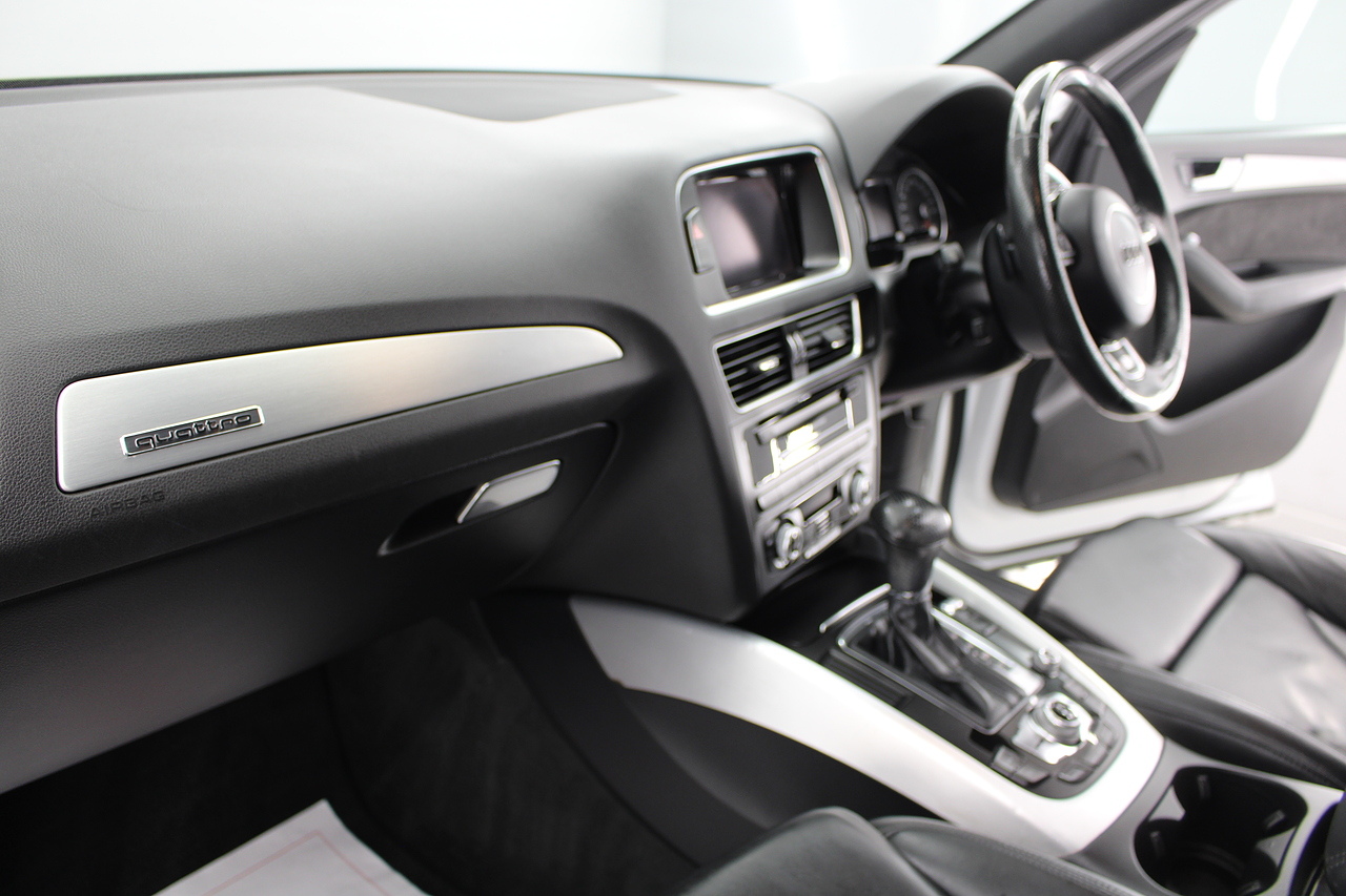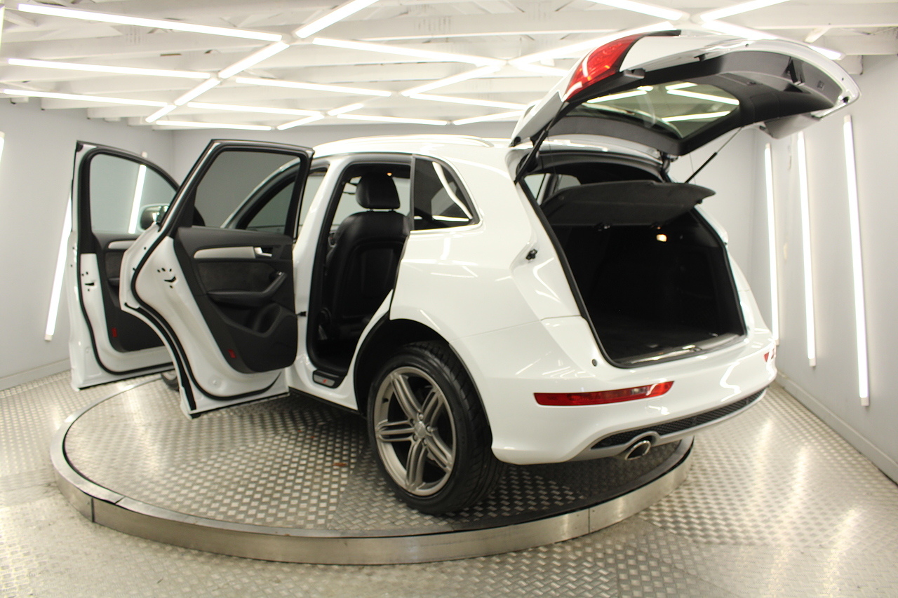 This Q5 does comes trimmed in black leather with heated front seats, dual zone climate control, cruise control, premium sound system, DAB radio and satellite navigation, Bluetooth connectivity, steering wheel mounted controls, headlight and rain sensors, rear and forward parking aid, power operated tailgate, 12v power adapter and ISOFIX anchorage points.