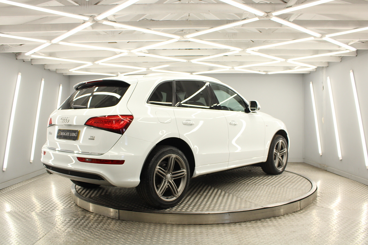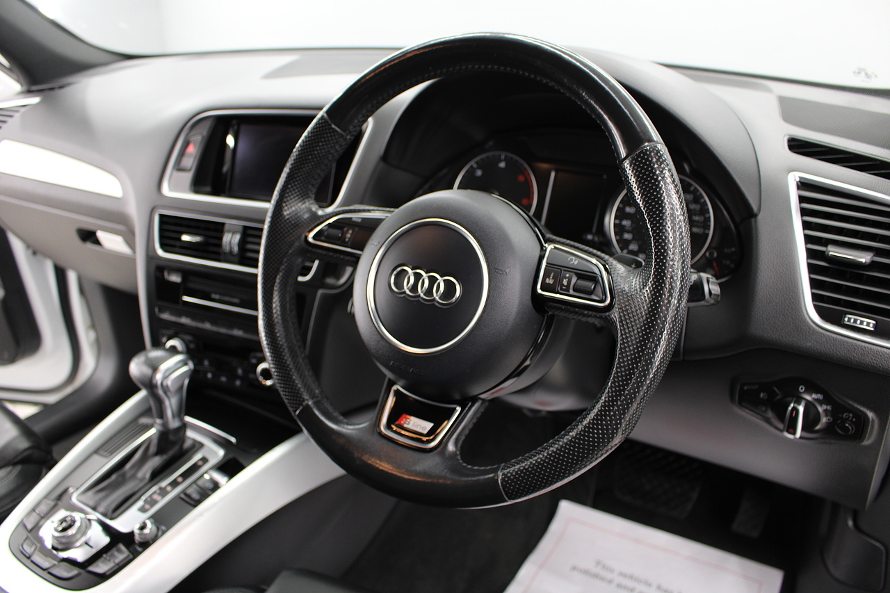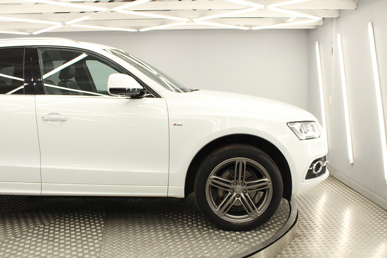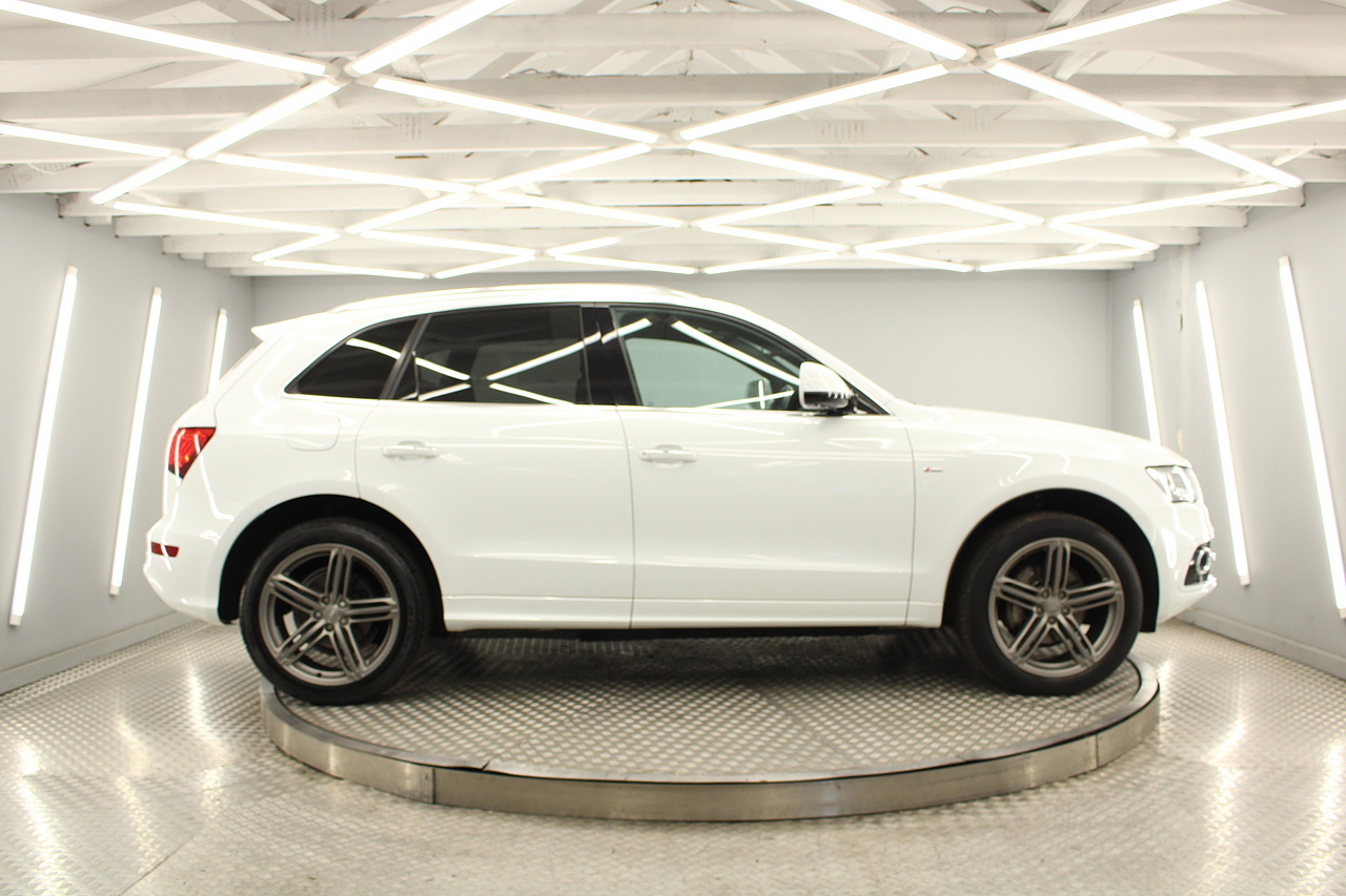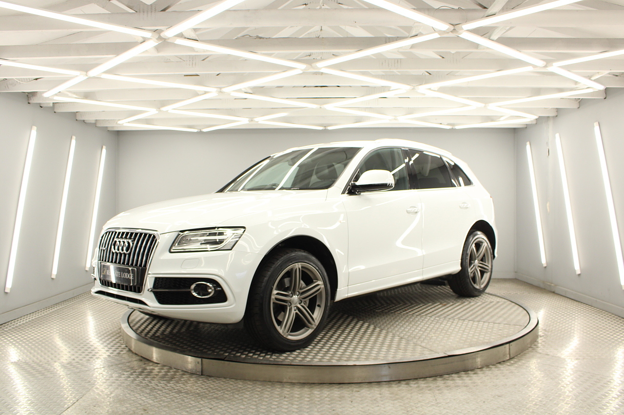 This Q5 does comes trimmed in black leather with heated front seats, dual zone climate control, cruise control, premium sound system, DAB radio and satellite navigation, Bluetooth connectivity, steering wheel mounted controls, headlight and rain sensors, rear and forward parking aid, power operated tailgate, 12v power adapter and ISOFIX anchorage points.