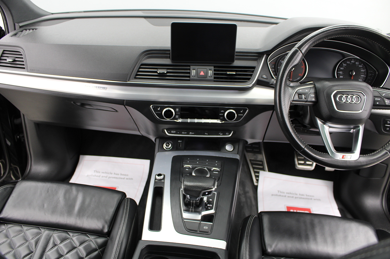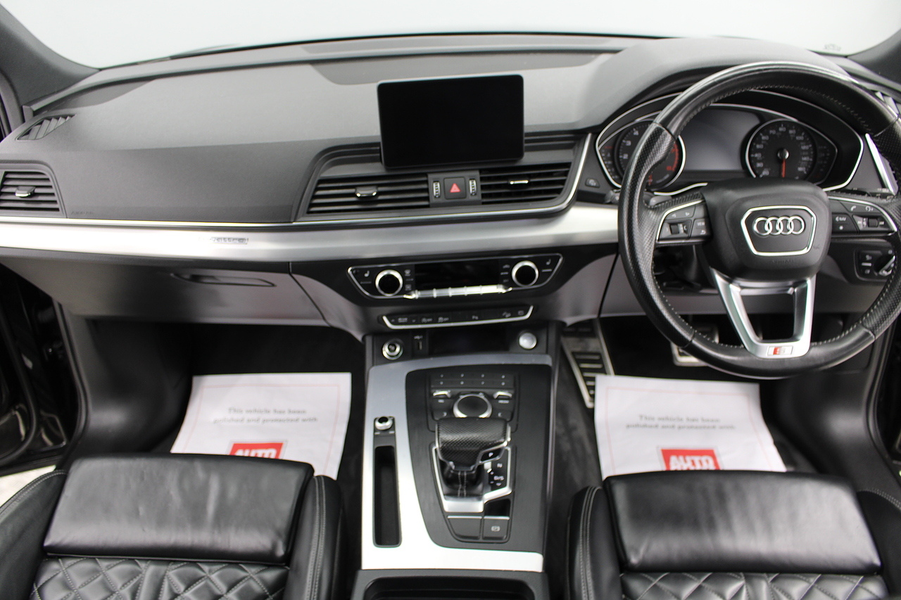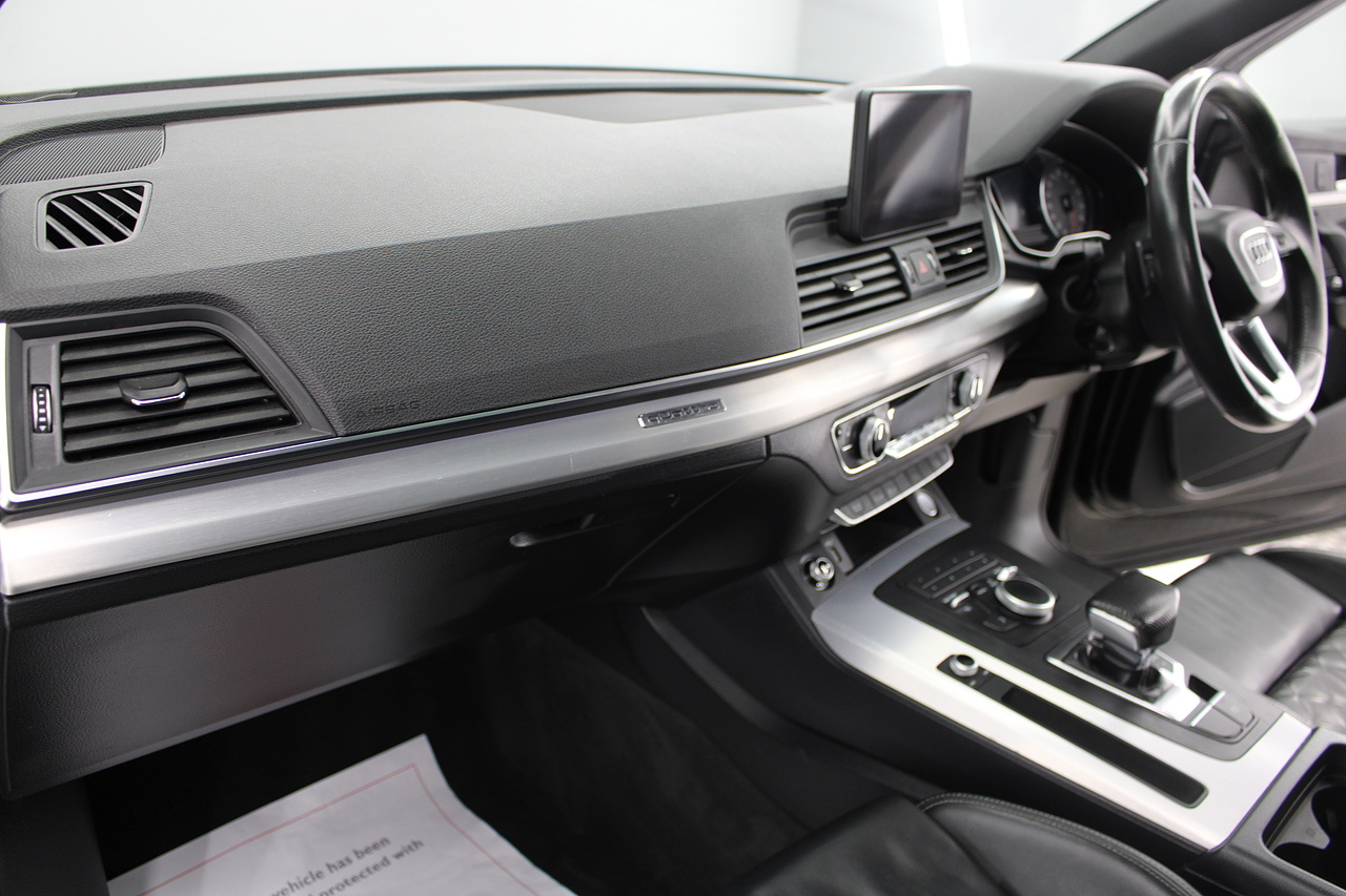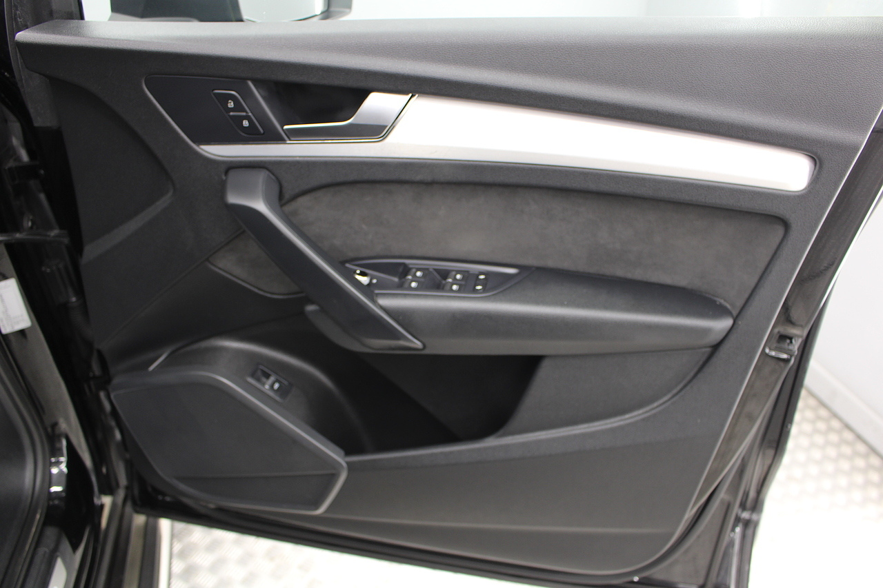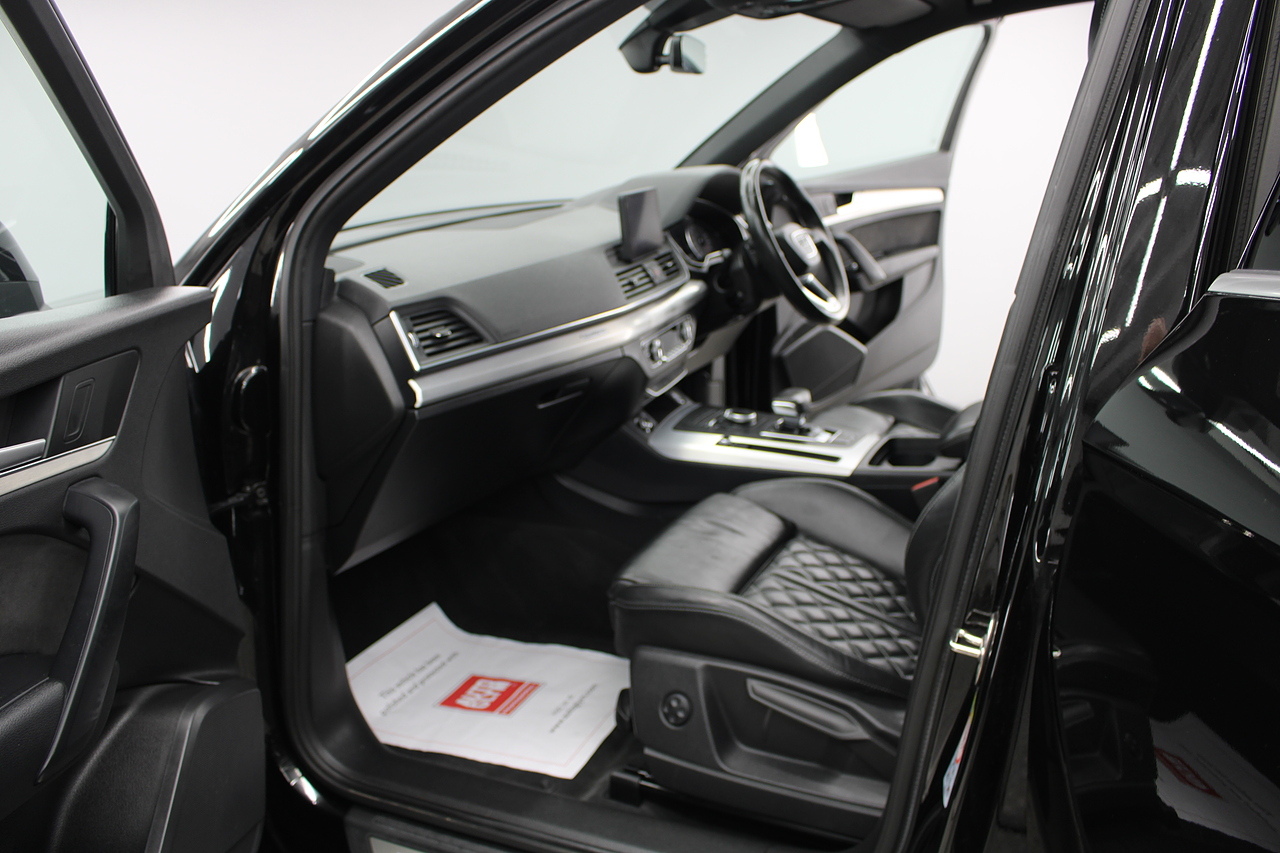 This Q5 does comes trimmed in black quilted leather with heated front seats, dual zone climate control, cruise control, premium sound system, DAB radio and satellite navigation, Bluetooth connectivity, steering wheel mounted controls, headlight and rain sensors, rear and forward parking aid, power operated tailgate, 12v power adapter and ISOFIX anchorage points.
