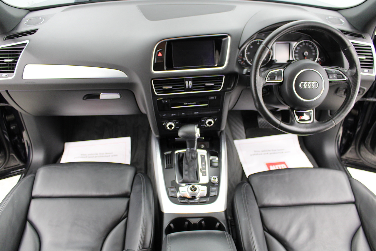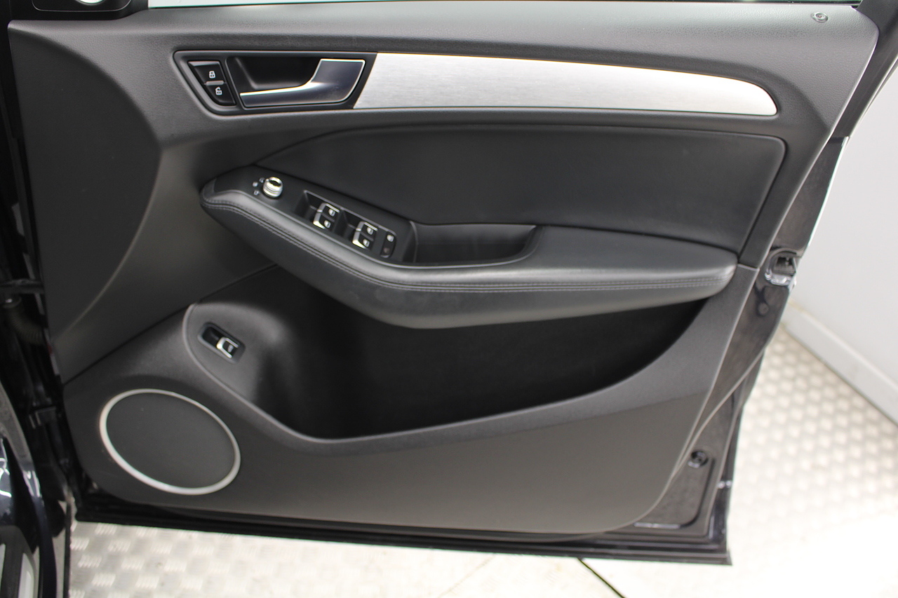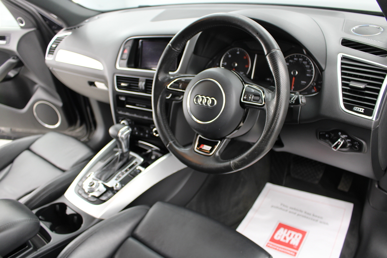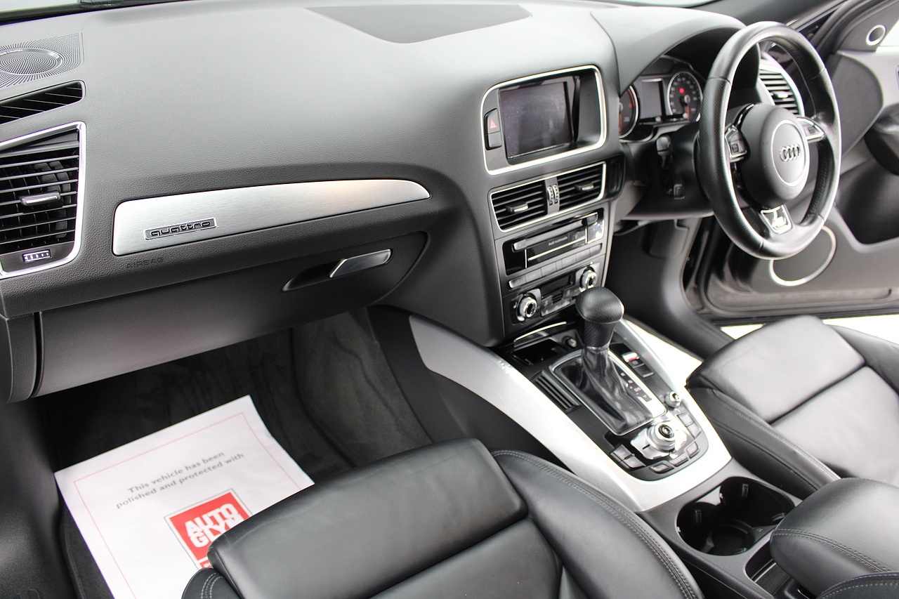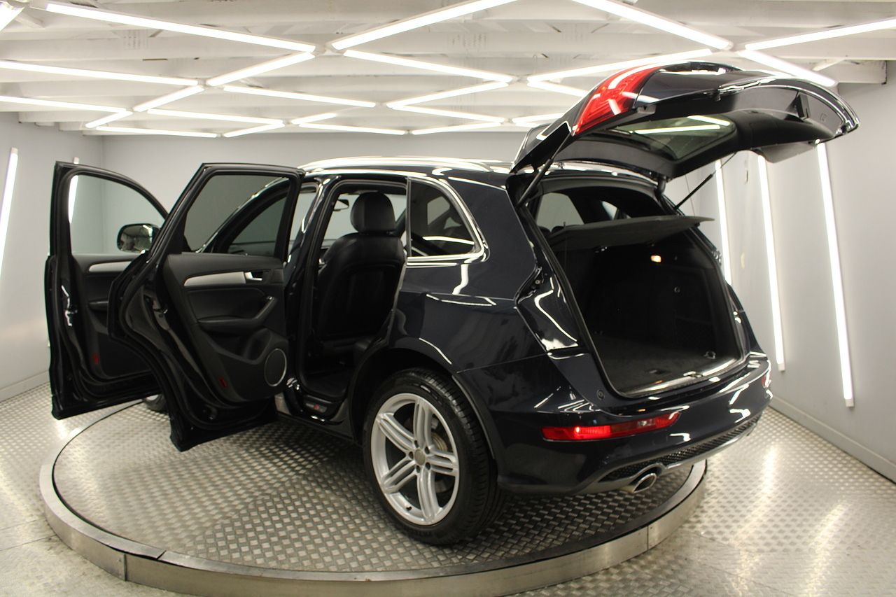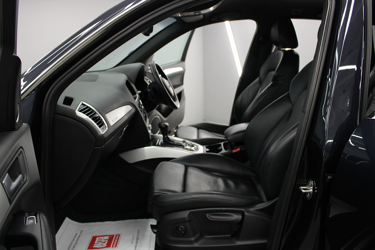 This Q5 does comes trimmed in black leather with heated front seats, dual zone climate control, cruise control, premium bang and olufsen sound system, DAB radio and satellite navigation, Bluetooth connectivity, steering wheel mounted controls, headlight and rain sensors, rear and forward parking aid, power operated tailgate, 12v power adapter and ISOFIX anchorage points.