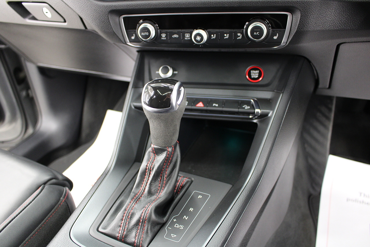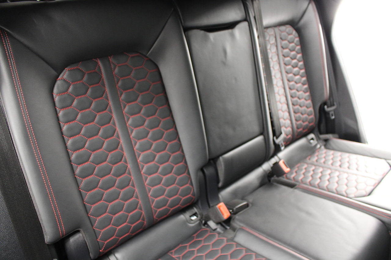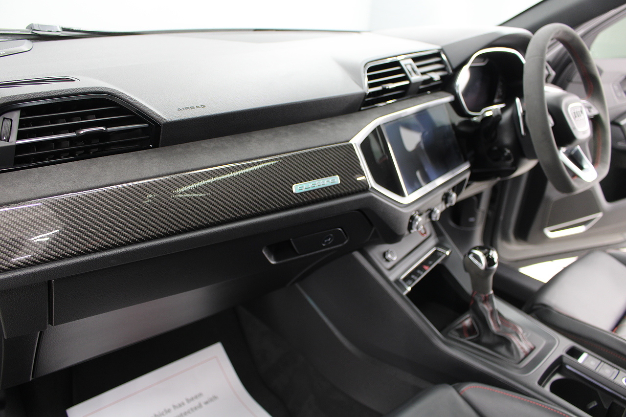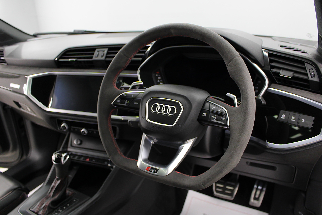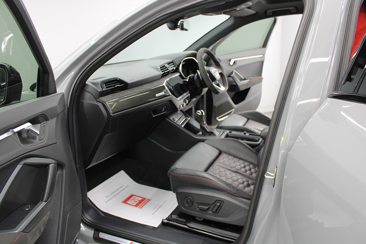 This RS Q3 comes trimmed in the beautiful heated black leather with red honeycomb stitching, further specification includes carbon inlays, alcantara steering wheel, virtual cockpit display, DAB radio with Audi MMI input, Bluetooth connectivity, apple car play, android auto and of course Satellite Navigation, steering wheel mounted controls, dual zone climate control, LED headlights, parking sensors with rear camera, cruise control and ISOFIX anchorage points. This ultimate incarnation of the Audi Q3 it is comfortably the quickest version on sale.