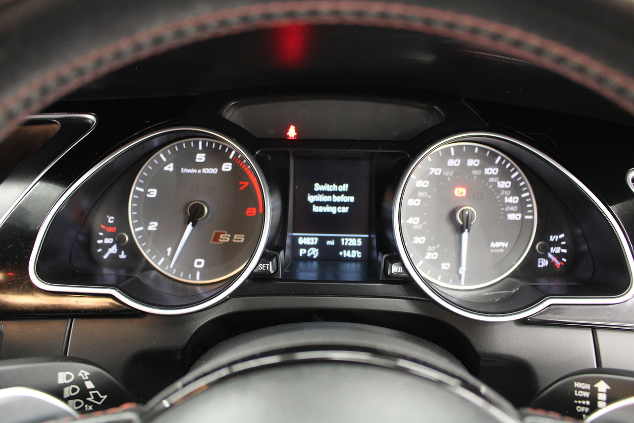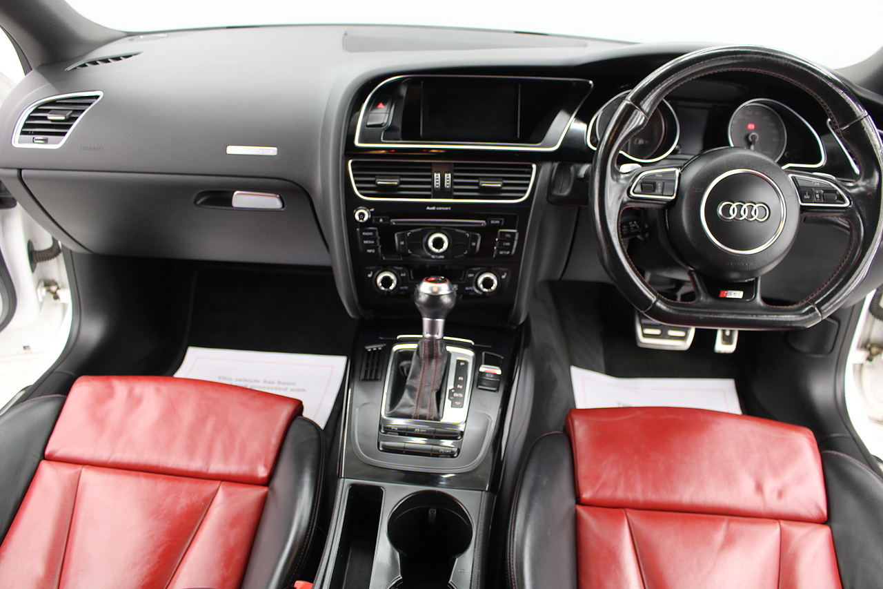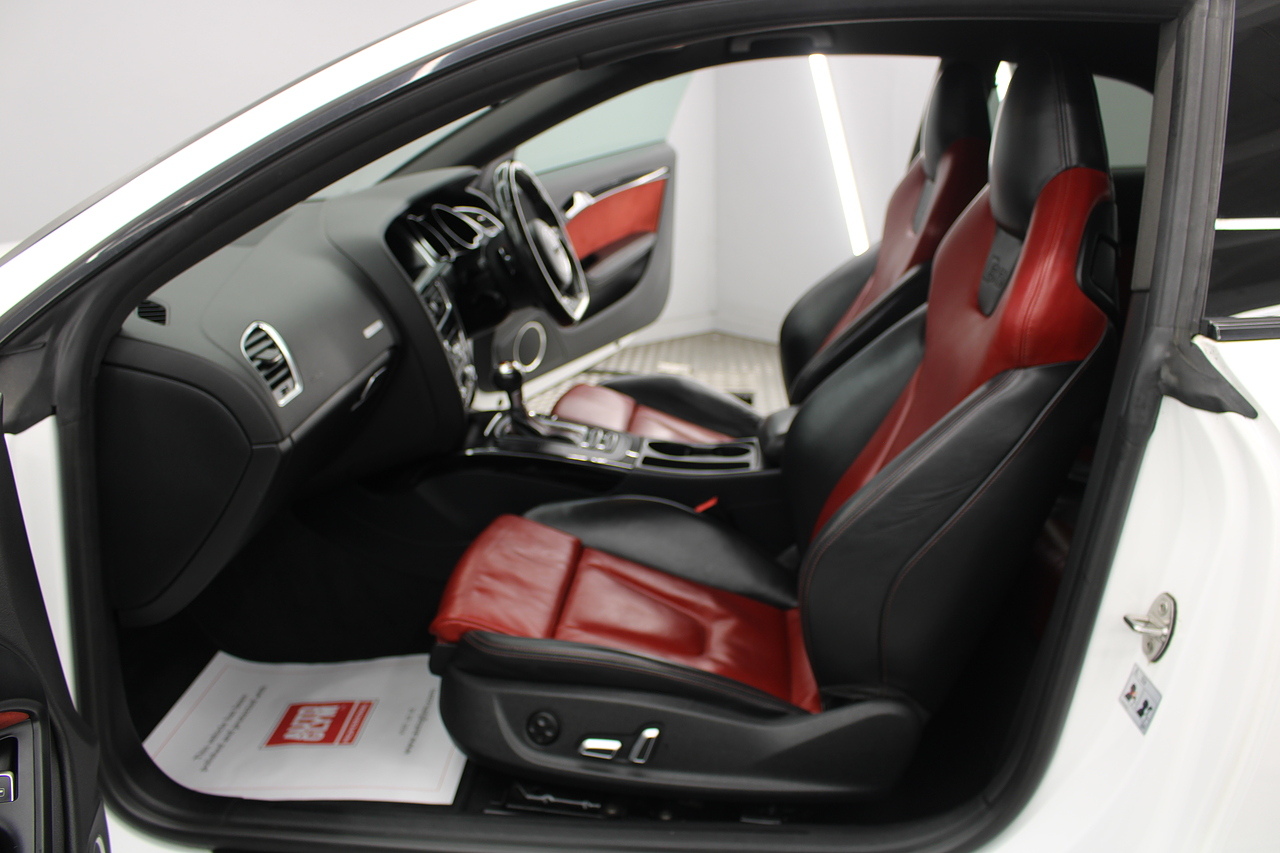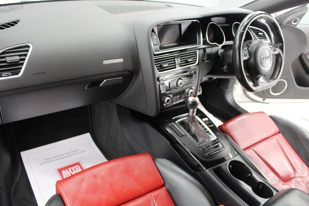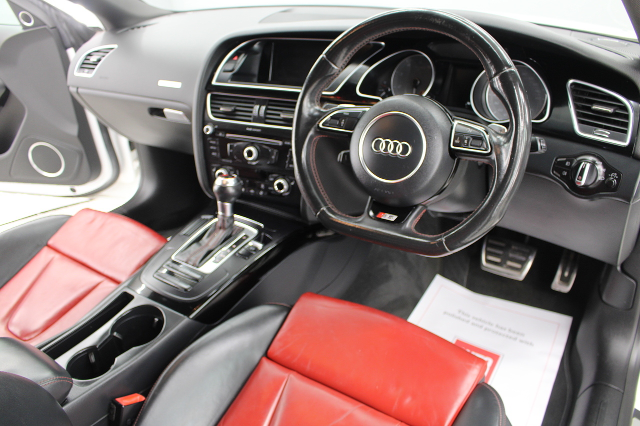 The interior comes trimmed in the black and red nappa leather, plus is loaded with extras, these consist of sports seats with power adjustment along with heated function, climate control, cruise control, Audi MMI system including, satellite navigation, DAB Radio, premium sound system, Bluetooth interface, LED daytime running lights and automatic headlights and automatic rain sensors. The interior is a really nice place to be beautifully finished as ever, The S5 offers all the performance you would need, along with sporty coupe looks, it really is the perfect fantastic sports cruiser.