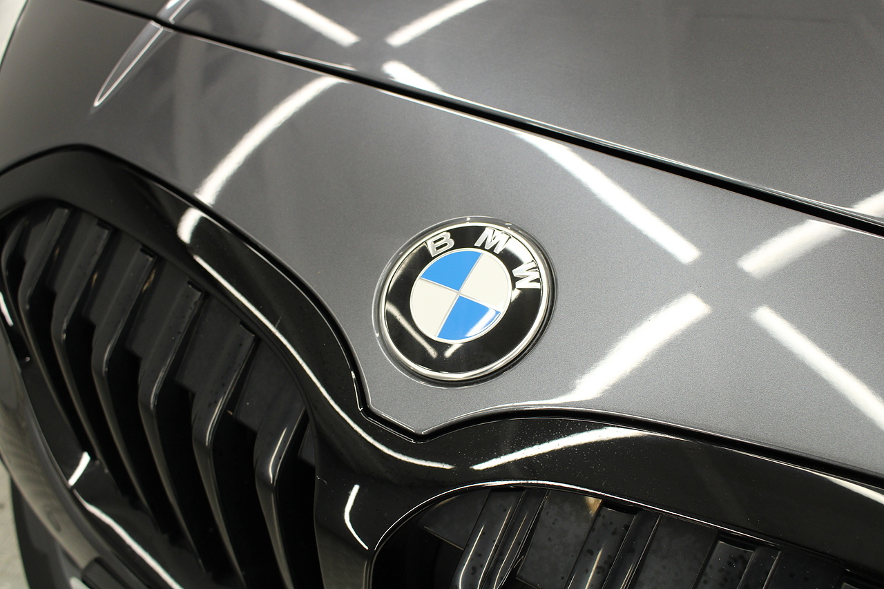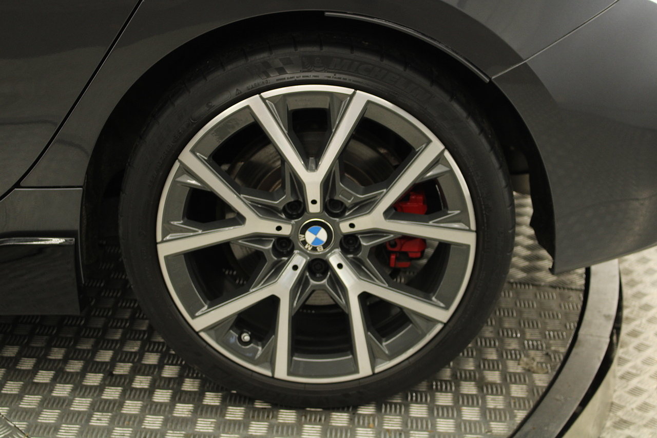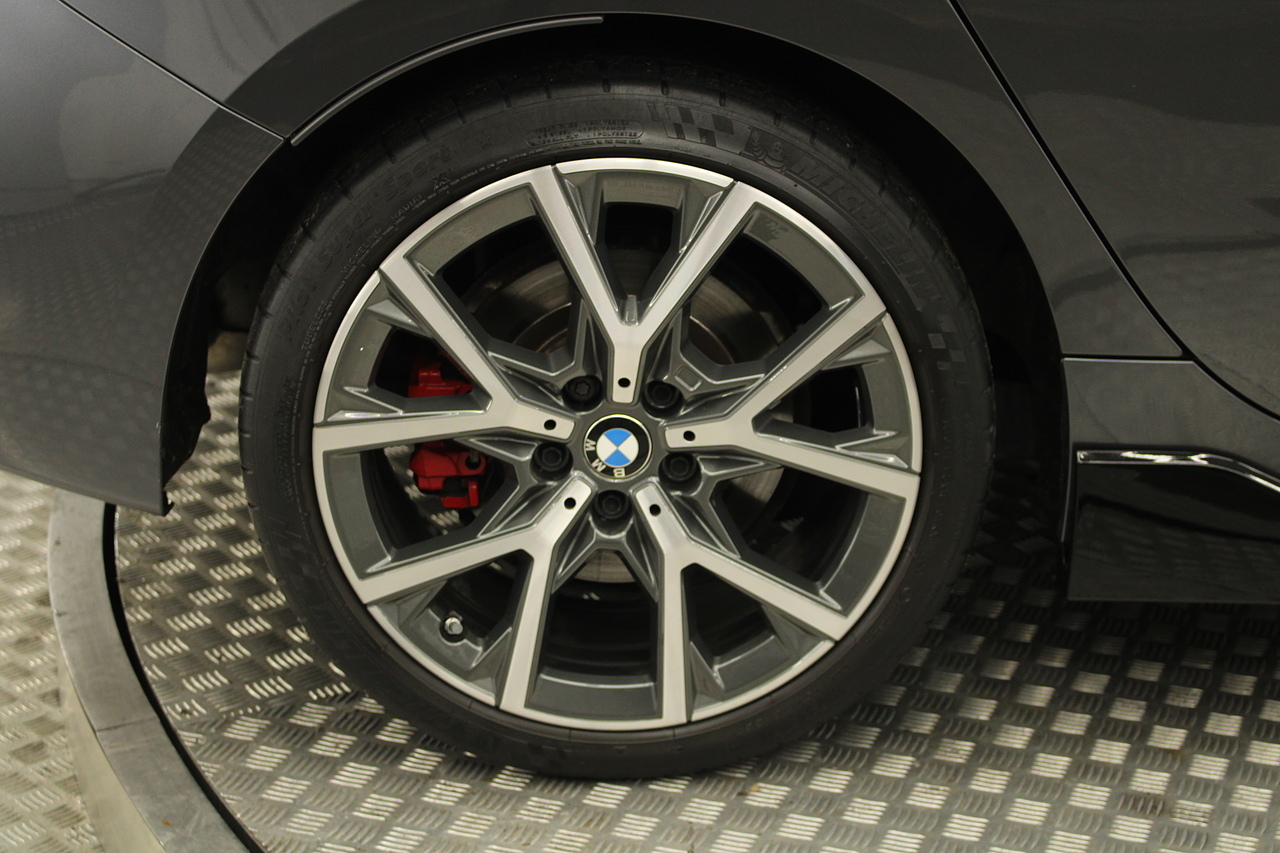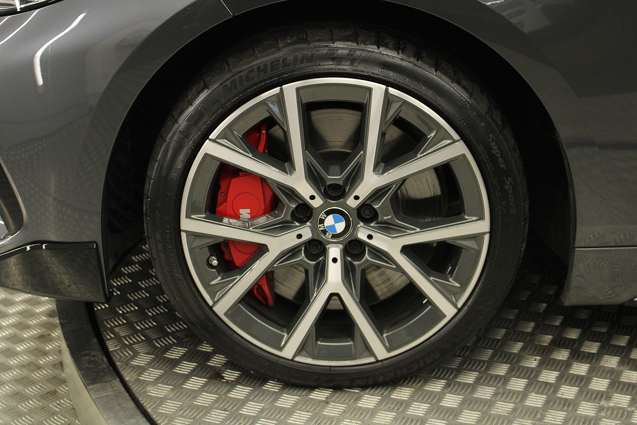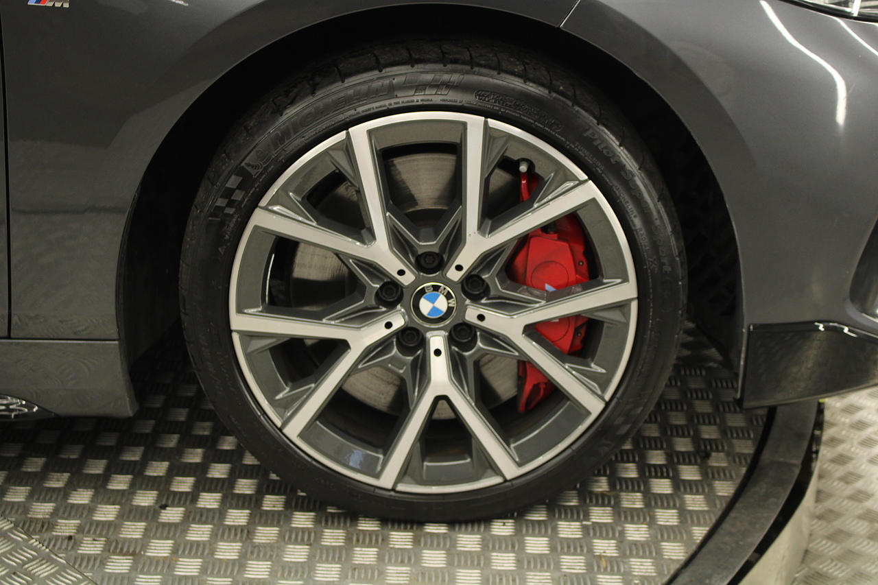 The exterior, finished in mineral grey with additional gloss black styling kit plus equipped with the M-Sport aerodynamic package, with diamond cut m-sport alloy wheels with the M-sport brake calipers behind which really set the car off.