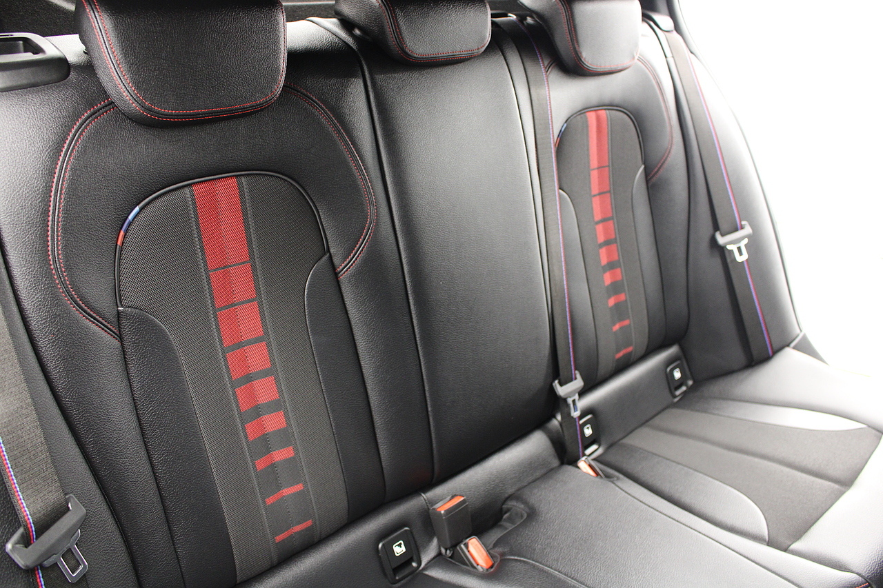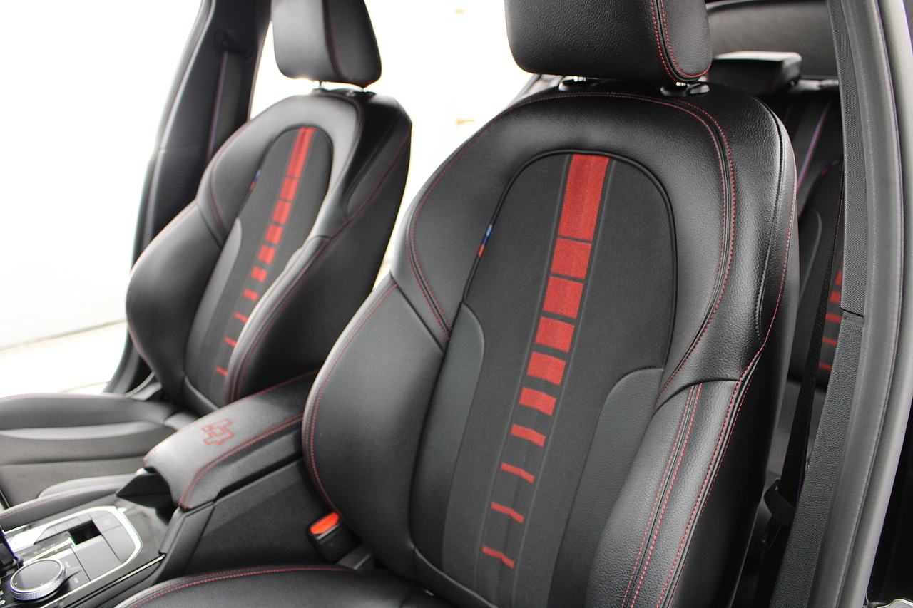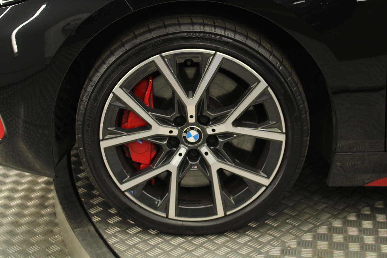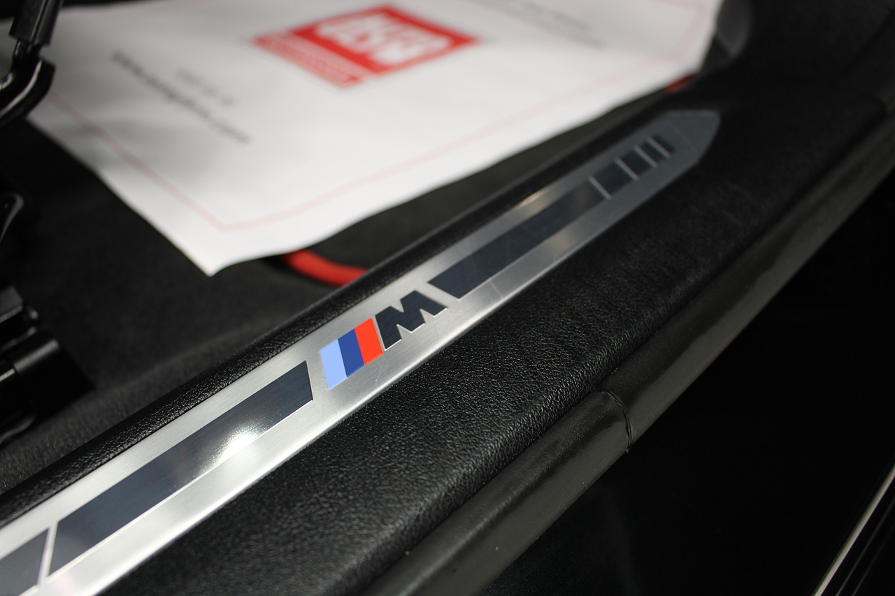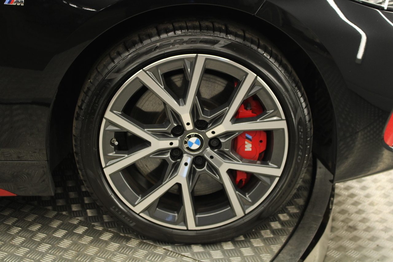 The exterior, finished in black sapphire with the M-Sport aerodynamic package highligthed in red, with diamond cut m-sport v-spoke alloy wheels with the M-sport brake calipers behind which really set the car off.