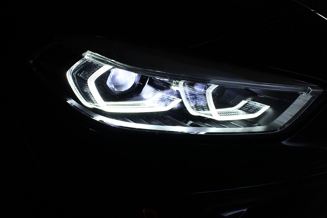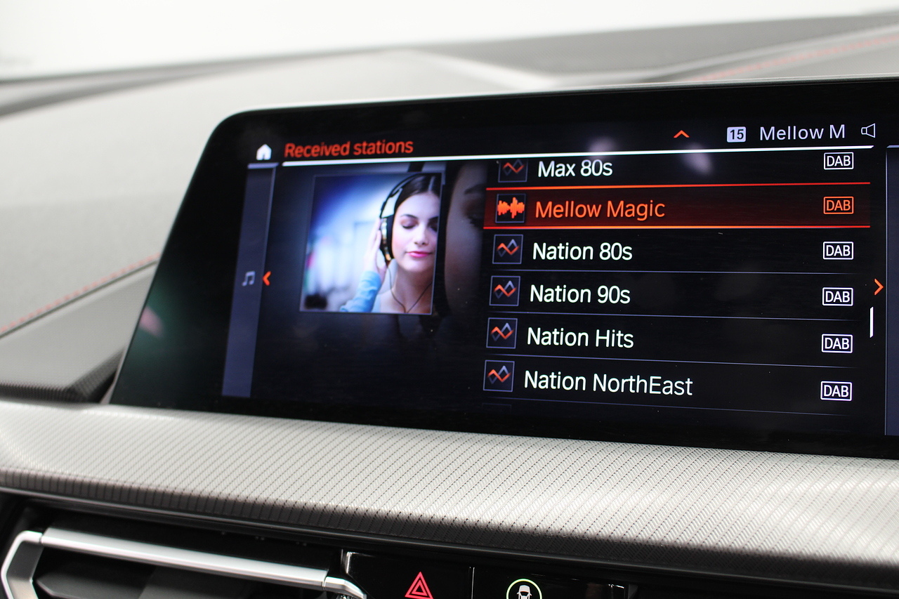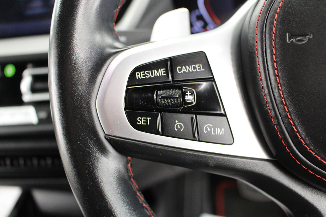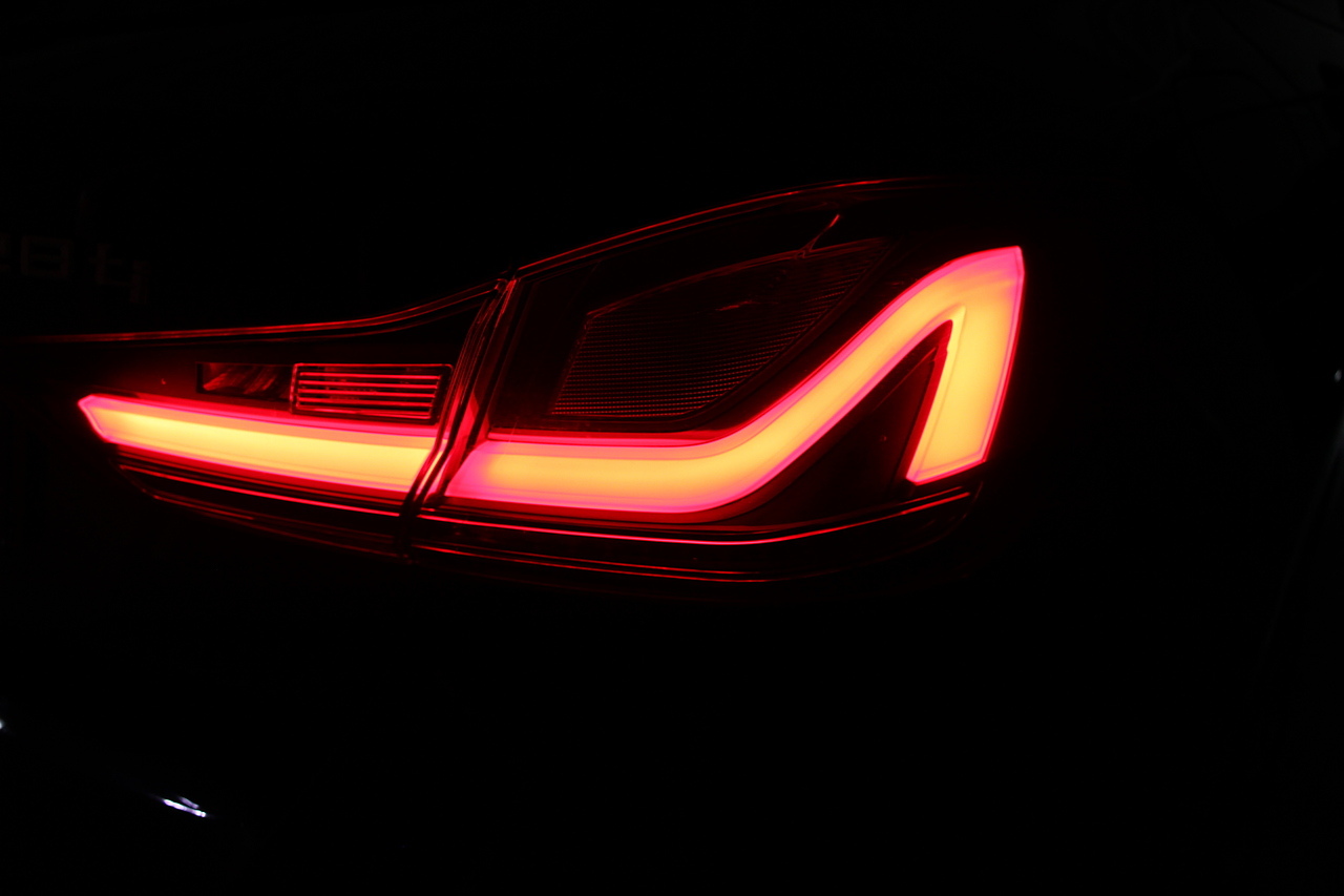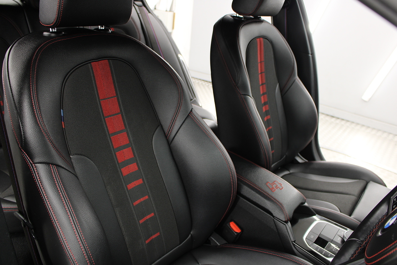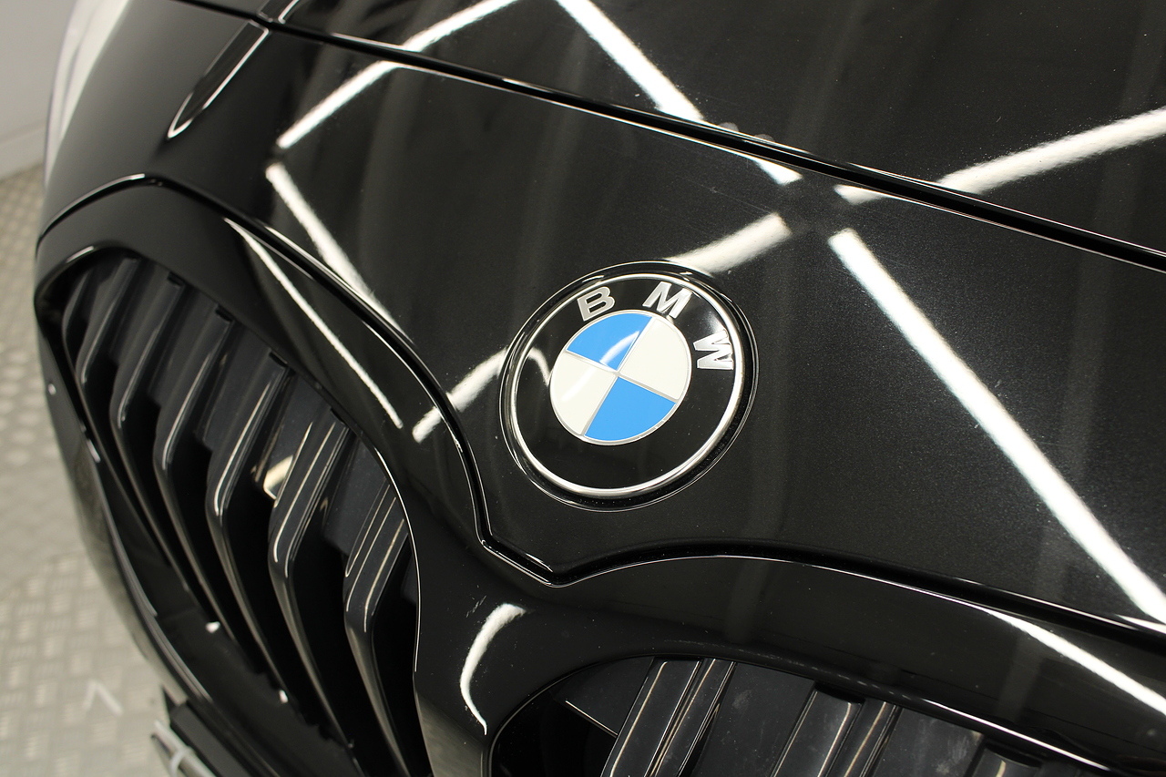 The exterior, finished in black sapphire with the M-Sport aerodynamic package highligthed in red, with diamond cut m-sport v-spoke alloy wheels with the M-sport brake calipers behind which really set the car off.