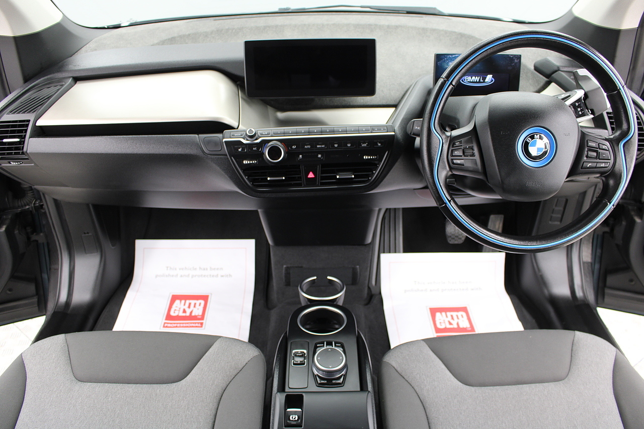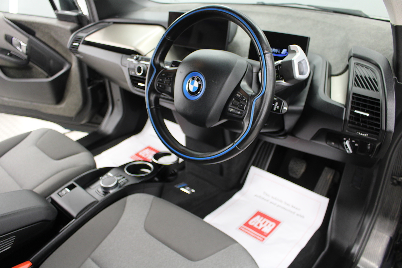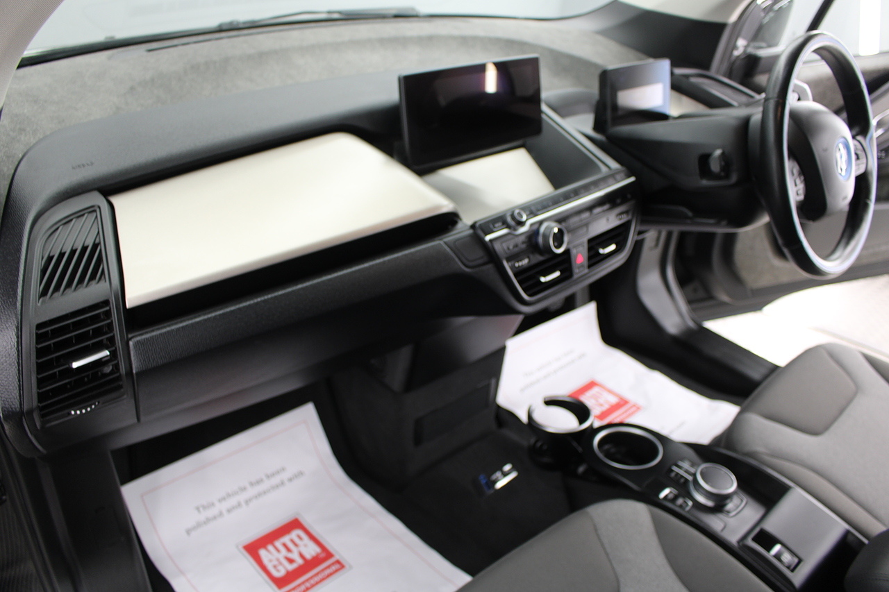 To the interior finished in grey cloth with heated front seats, a large touch screen display and control unit incorporating satellite navigation, DAB radio, bluetooth telephone, climate control and with handy driver aids such as adjustable driving nodes, front and rear parking sensors, cruise control, isofix child seat anchor points. In summary the i3 is a very modern looking practical electric car with cutting edge looks and packed full of up to date technology.