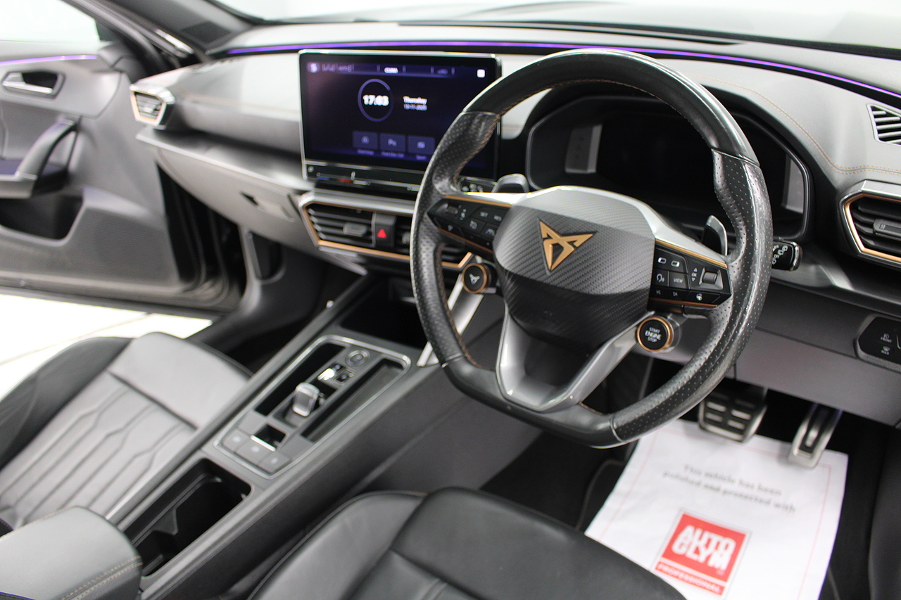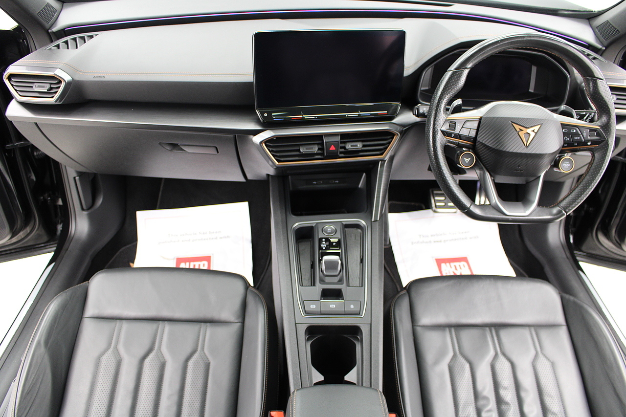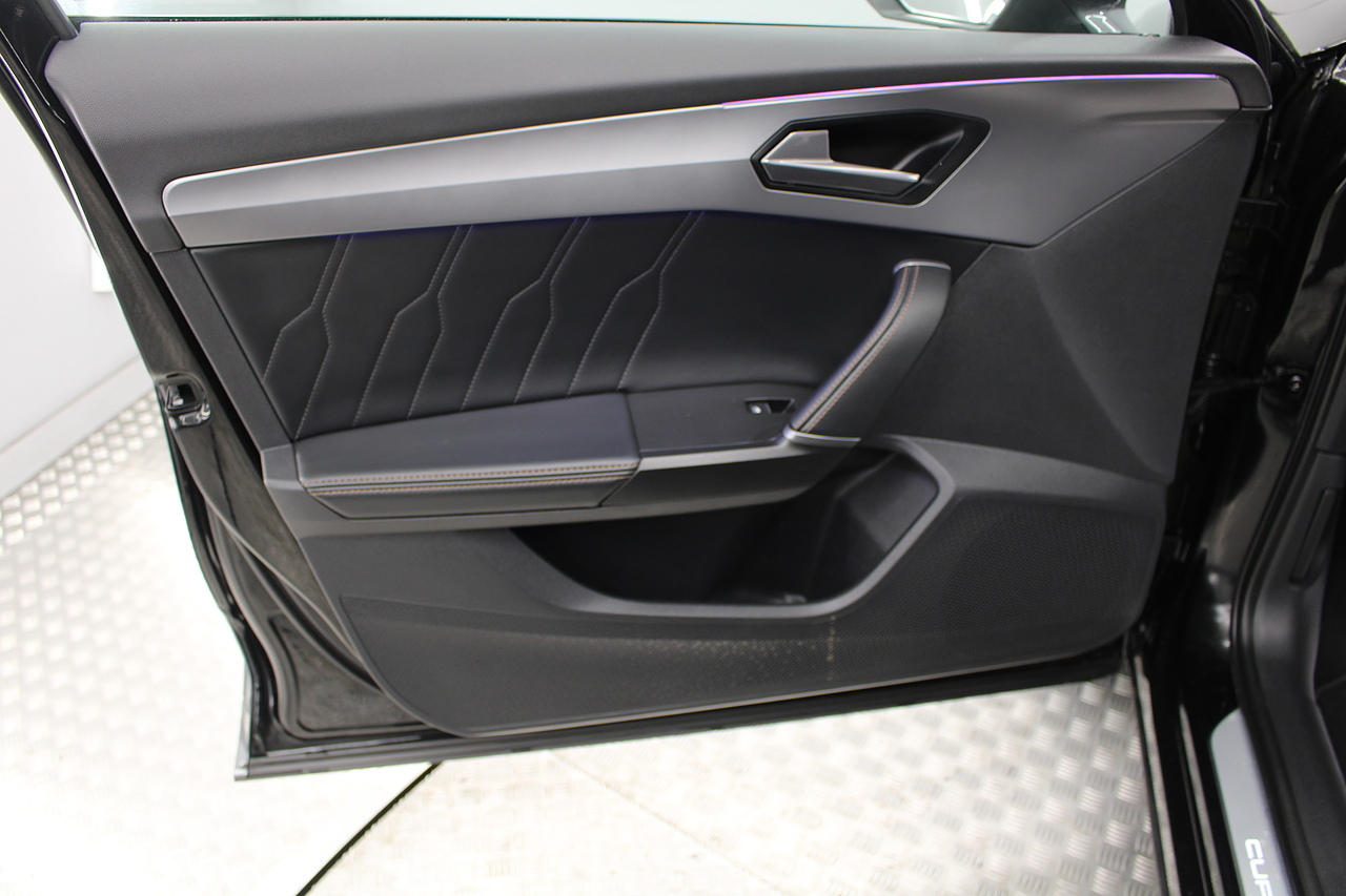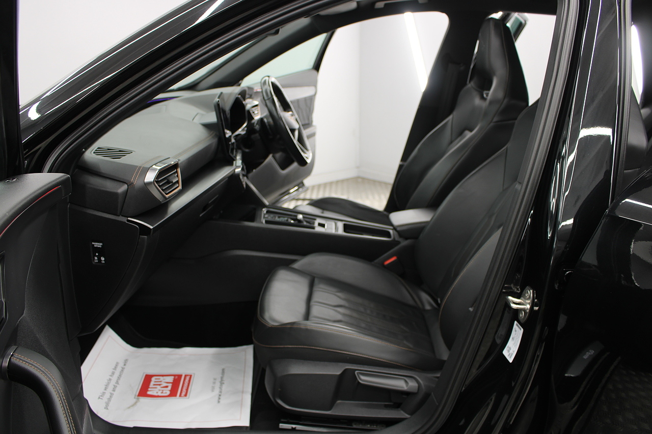 The interior comes with sports Cupra seats trimmed in black leather interior with the seats being power adjustable with memory settings and heated. In addition to full colour screen and premium sound system, DAB Radio, Satellite navigation, Bluetooth, apple car play and android auto, heated steering wheel, virtual cockpit display, handy driver aids such as rear parking camera and adaptive cruise control. And with premium and modern extras such as air conditioning and climate control, DAB radio with MP3 functionality, steering wheel mounted controls, giving it a modern look and feel inside the cabin.
