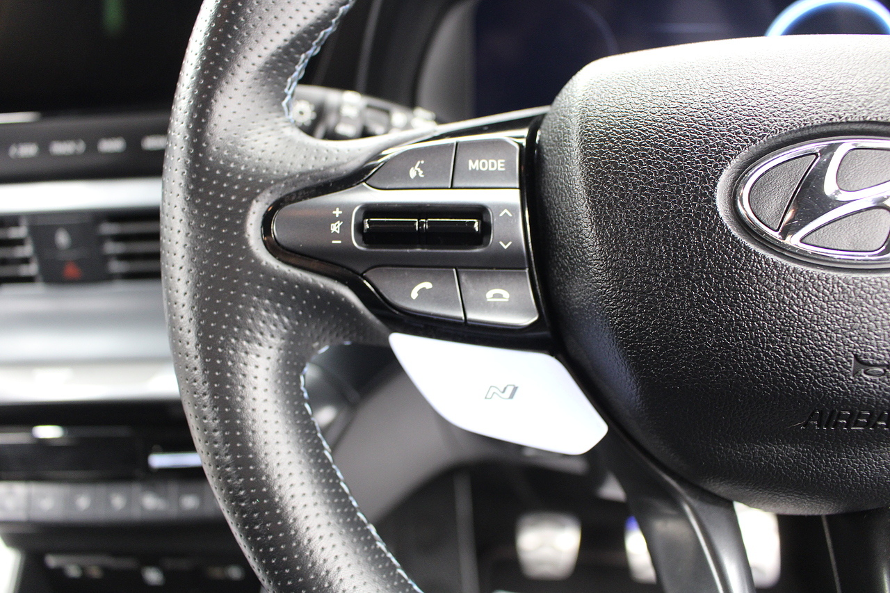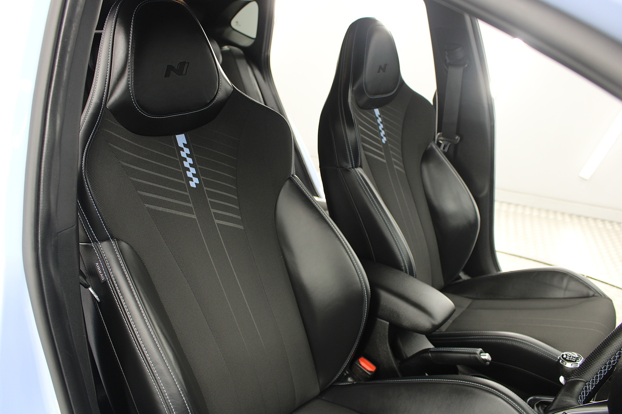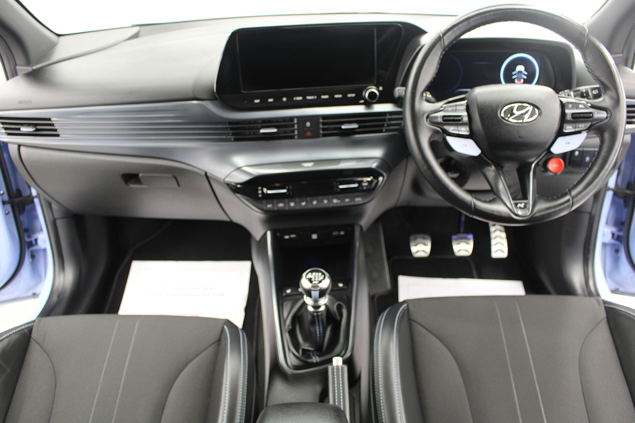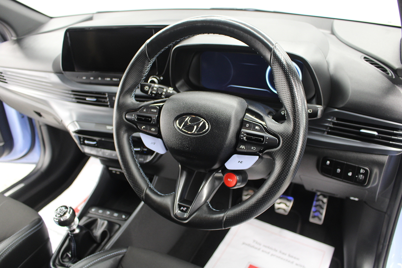 To the interior, you'll see the very comfortable and supportive half leather sports seats which are heated along with the heated steering wheel Bluetooth connectivity, Sat Nav, full colour touch screen with DAB radio with Apple Car Play and Android Auto, as well as also benefitting from front and rear parking sensors and full colour reverse camera heated front seats and of course the adjustable driving modes N-mode and rev matching, The i20N It's also quite a lot faster on the road than offerings from other manufacturers plus offers a lot more spec and tech for the price.
