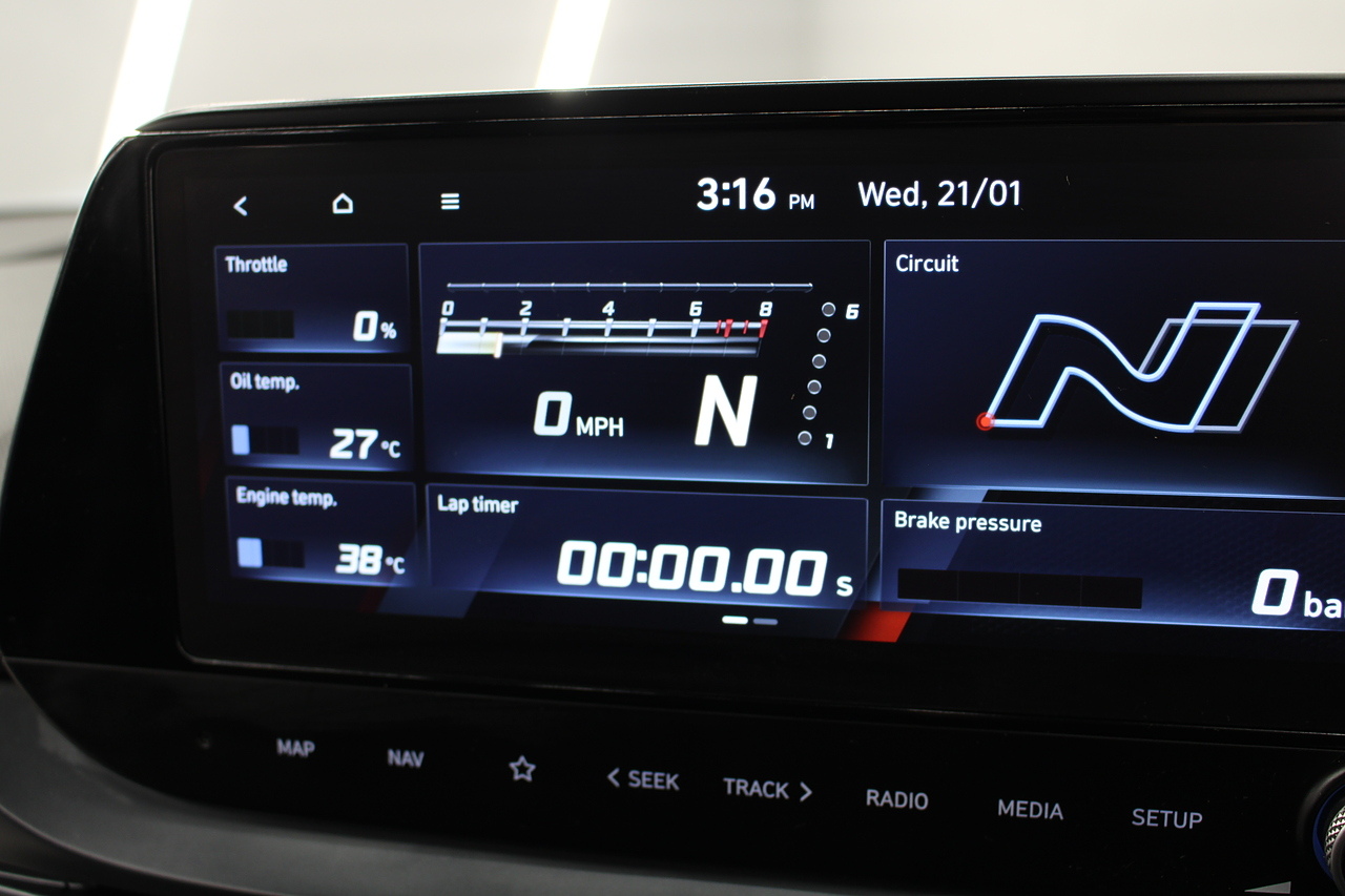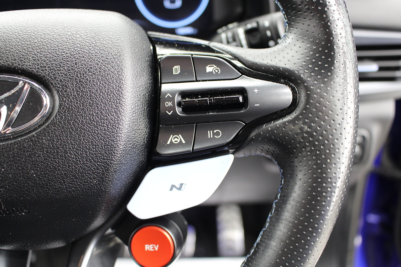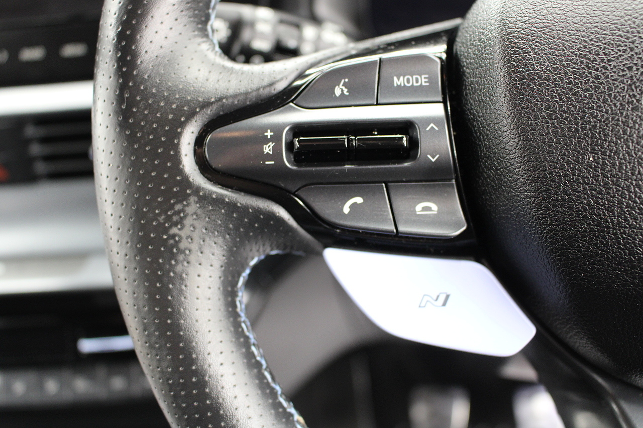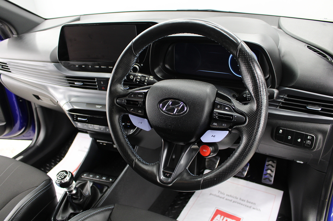 To the interior, you'll see the very comfortable and supportive half leather sports seats which are heated along with the heated steering wheel Bluetooth connectivity, Sat Nav, full colour touch screen with DAB radio with Apple Car Play and Android Auto, as well as also benefitting from front and rear parking sensors and full colour reverse camera heated front seats and of course the adjustable driving modes N-mode and rev matching, The i20N It's also quite a lot faster on the road than offerings from other manufacturers plus offers a lot more spec and tech for the price.