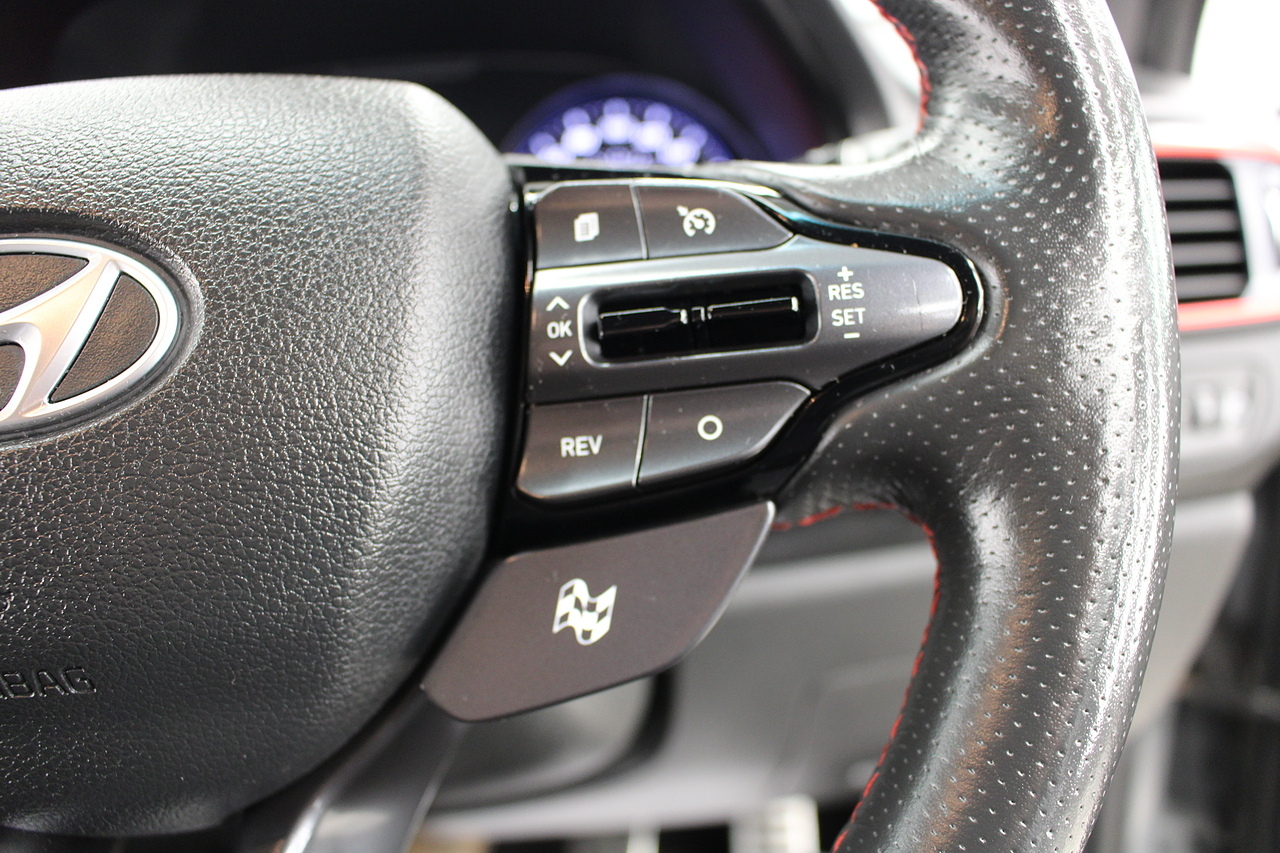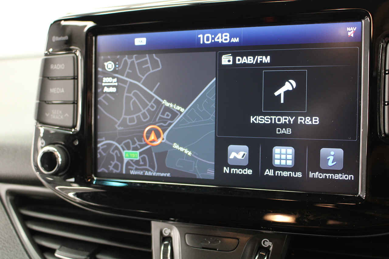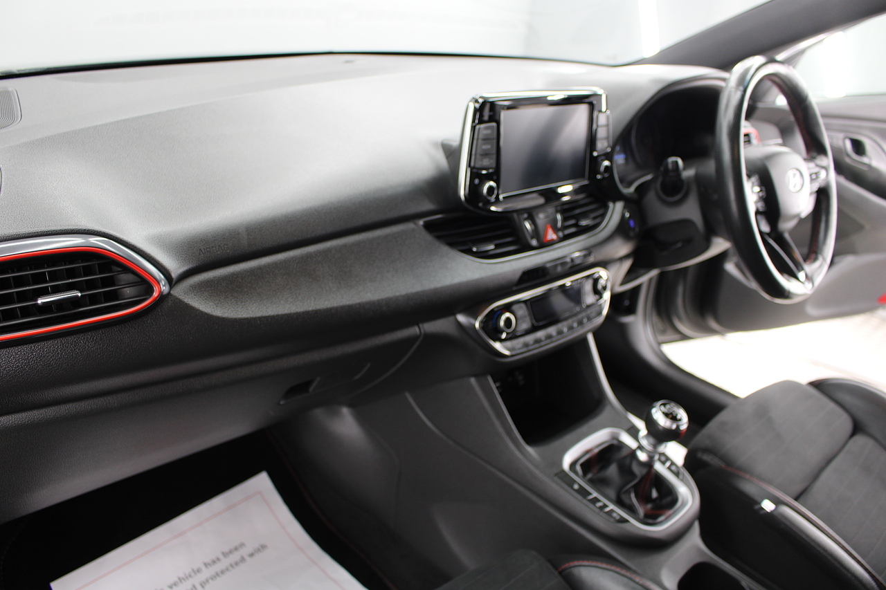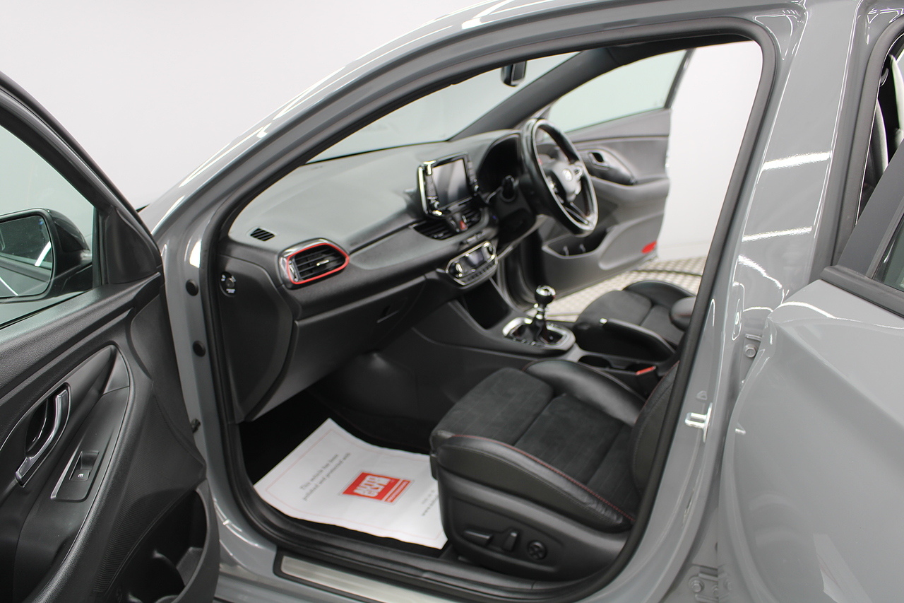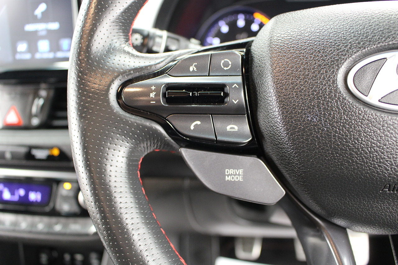 To the interior, you'll see the very comfortable and supportive sport styled half leather and alcantara seats which are power adjustable with memory settings, heated seats and steering wheel, beautiful touches of piano black across the centre console, Bluetooth connectivity, Sat Nav, full colour touch screen with DAB radio with Apple Car Play and Android Auto, as well as also benefitting from front and rear parking sensors and full colour reverse camera and of course the adjustable driving modes where everything from throttle response, rev matching, the LSD and exhaust note all can be set up the way you like it, it is a real clever bit of kit! The i30 N Performance. It's also quite a lot faster on the road than offerings such as the Ford Focus ST, and comfier and more accessible than all of the above plus offers a lot more spec and tech for the money.