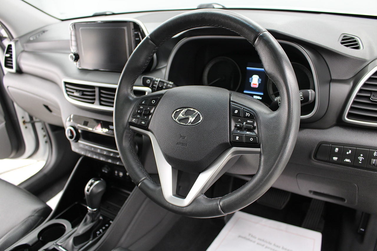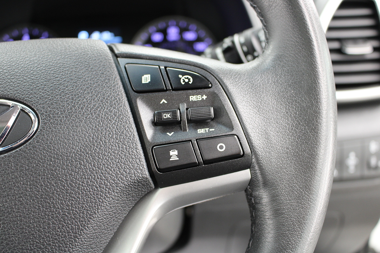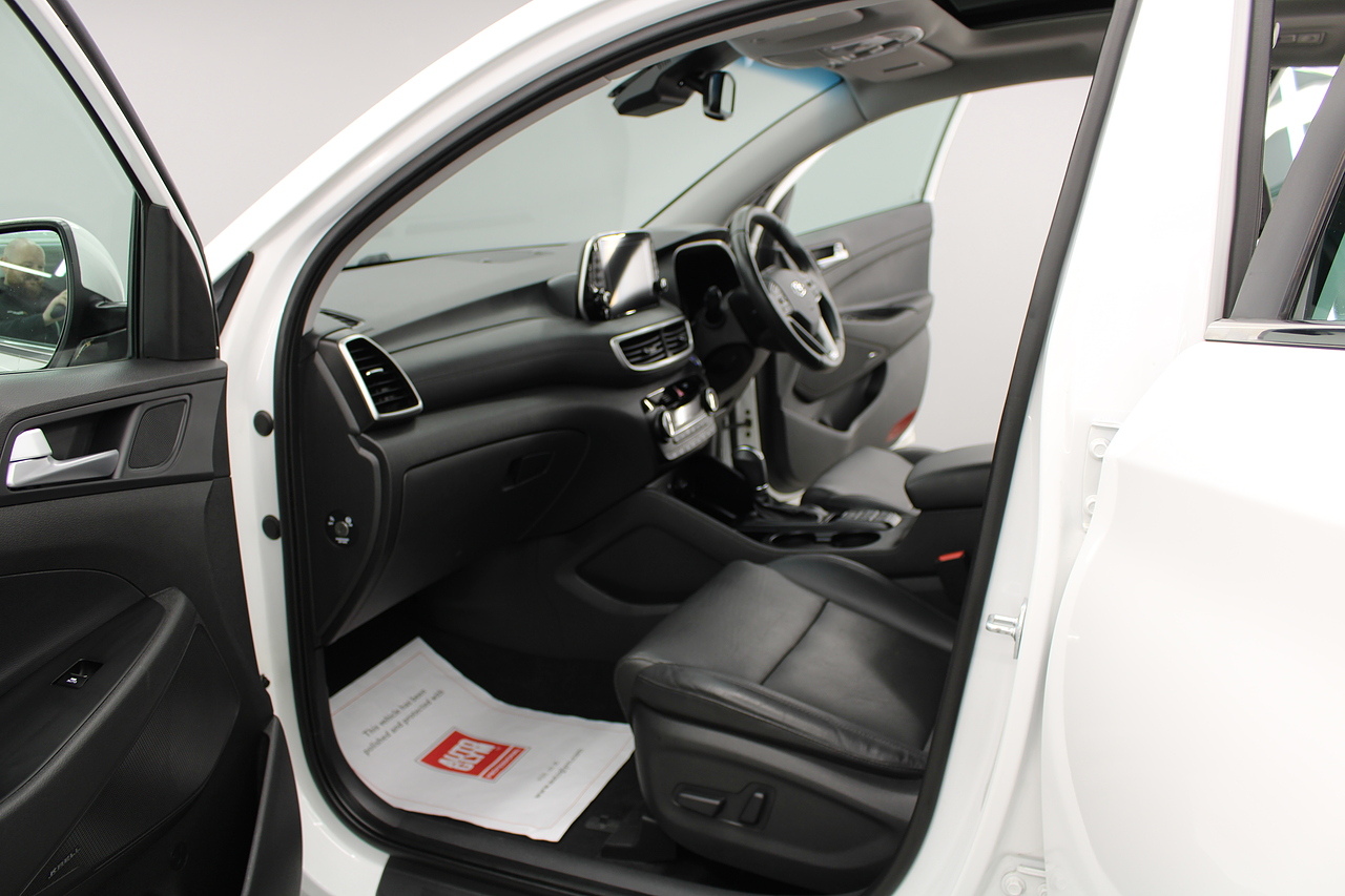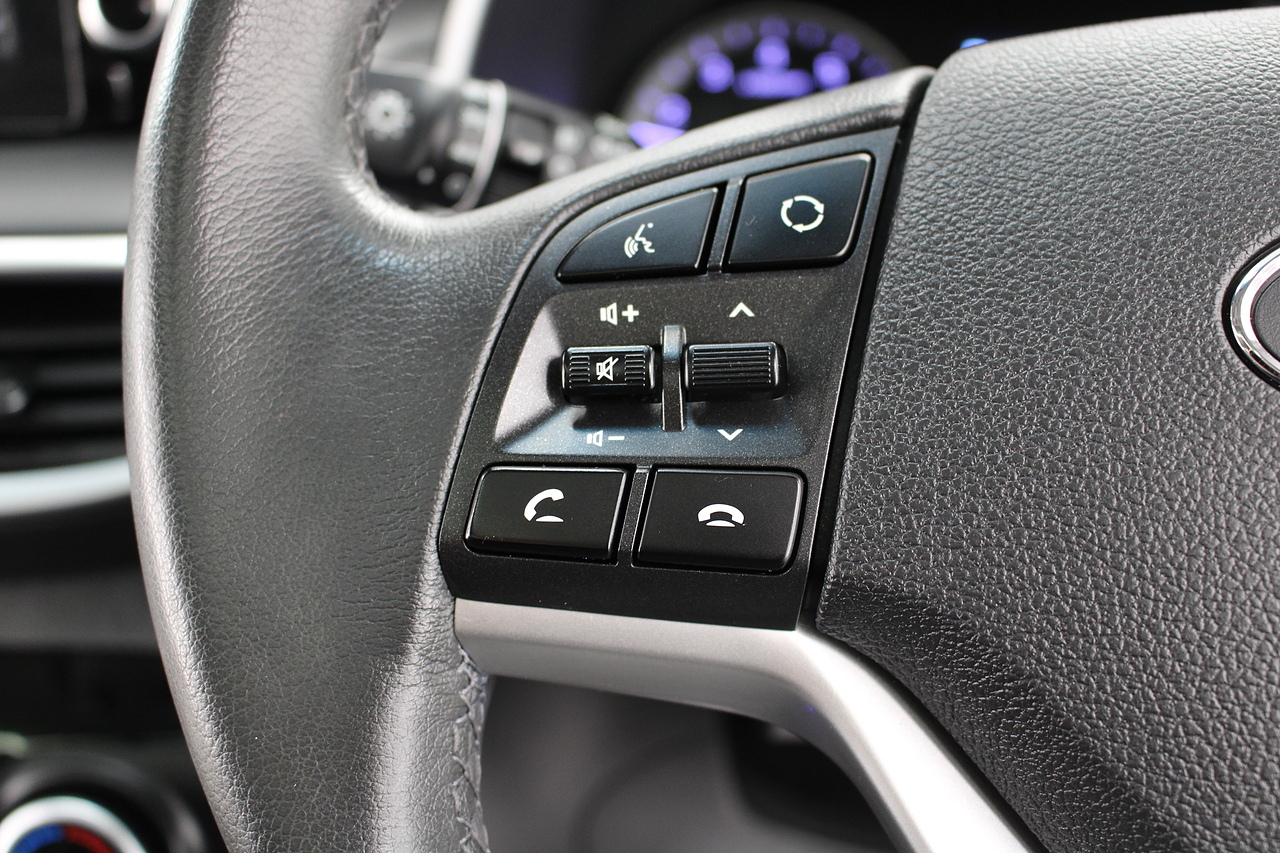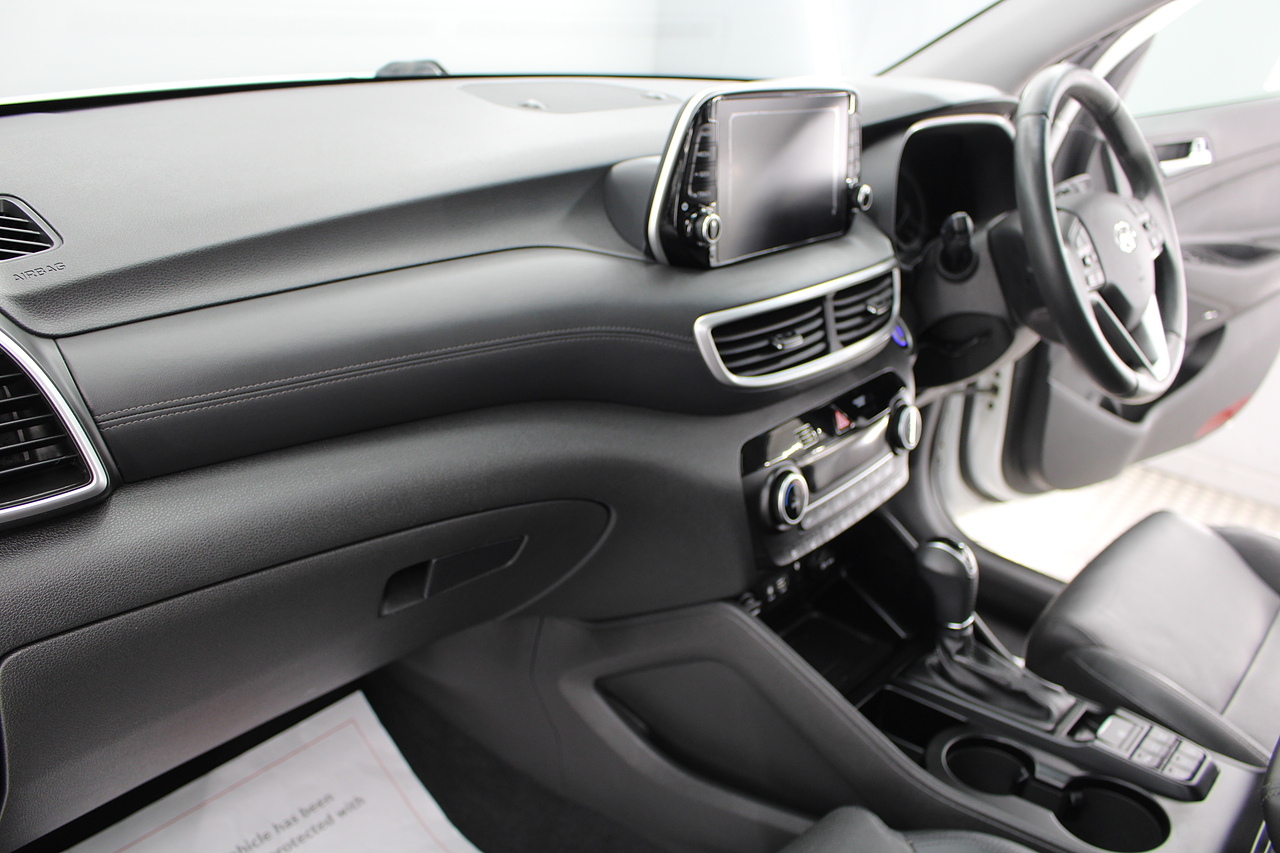 The specifications of this car do include black leather interior trim with heated and cooling front seats along with heated rear seats, climate control, cruise control, front and rear electric windows, a large touch screen unit with Satellite navigation, DAB radio, Bluetooth telephone connectivity, apple car play, android auto, roof rails, steering wheel mounted audio controls, with handy driver aids such as cruise control, hill descent, lane departure warning, parking sensors with rear camera and top view camera and child ISOFIX anchorage points. The Hyundai Tucson may effectively be the bigger brother for the IX35, but it is also much more than that. It represents a huge leap forward for Hyundai in terms of interior quality, exterior design and refinement. Elements such as the distinctive grille and modern cabin design which made their debut in the ix35 and it leads the way in terms of economy and emissions too with impressively efficient and cheap to run engines.