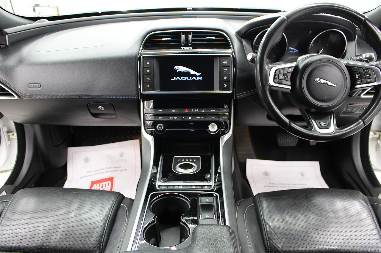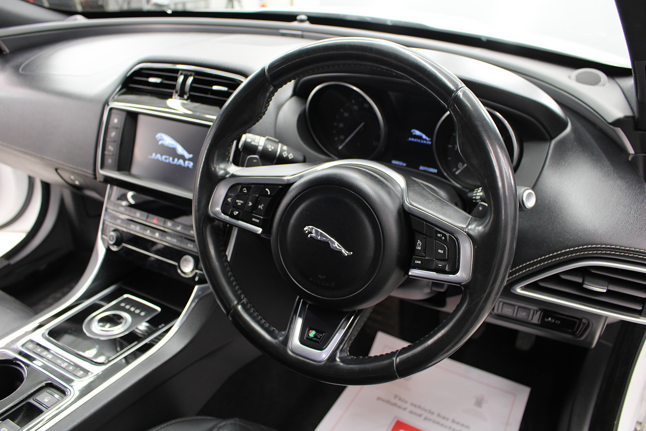 The interior is trimmed in black heated leather with power adjustable seats, heated steering wheel, dual zone climate control, cruise control, CD DAB radio, heated and electric door mirrors, reverse parking aid, satellite navigation, Bluetooth connectivity, steering wheel mounted controls and ISOFIX anchorage points. A mid-life facelift has certainly bolstered the Jaguar's appeal to the customer. The new dashboard in particular is a massive upgrade, while the simplified and generous engine line-up should help win buyers over, or at least cement the few that the XE already has.