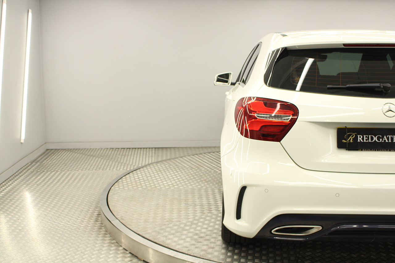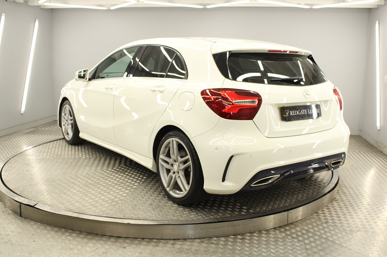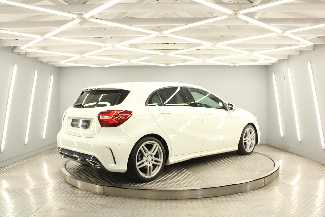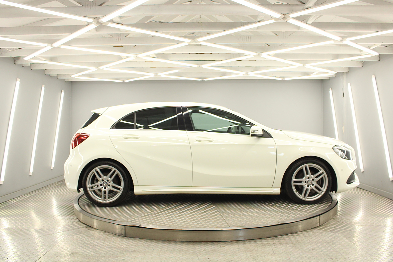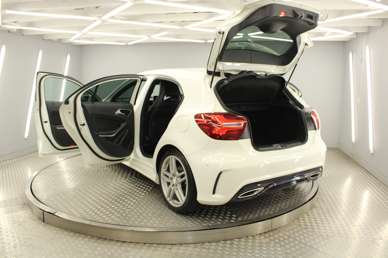 To the inside premium materials are used as you'd expect, with supportive and seats trimmed in black artico leather and alcantara with heated seats, the centre of the dash houses a large full colour screen located in the middle of the dash with satellite navigation, reverse parking camera display, FM radio, Bluetooth connectivity with audio streaming, and also cruise control, this generation of the Mercedes Benz A Class is sleeker and longer, with styling that could turn the heads of traditional Volkswagen Golf buyers.