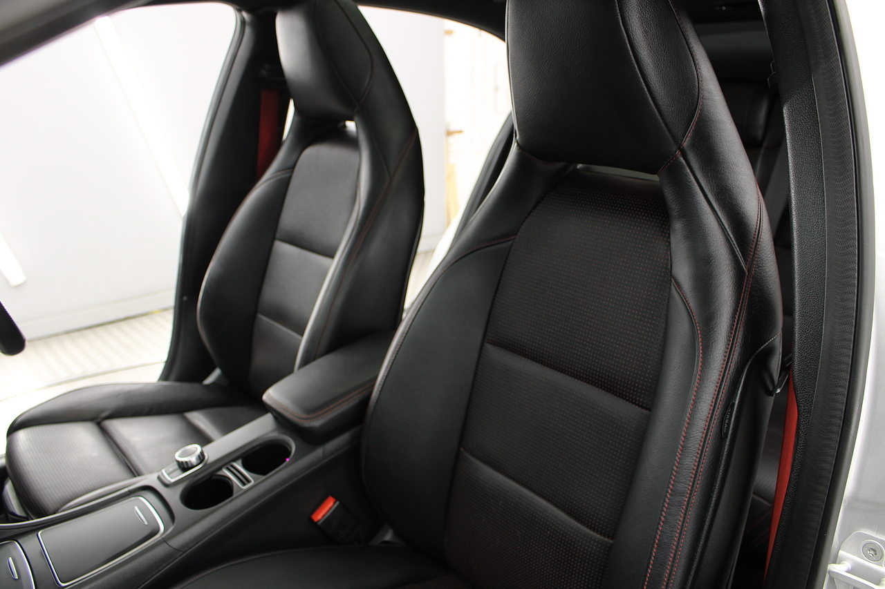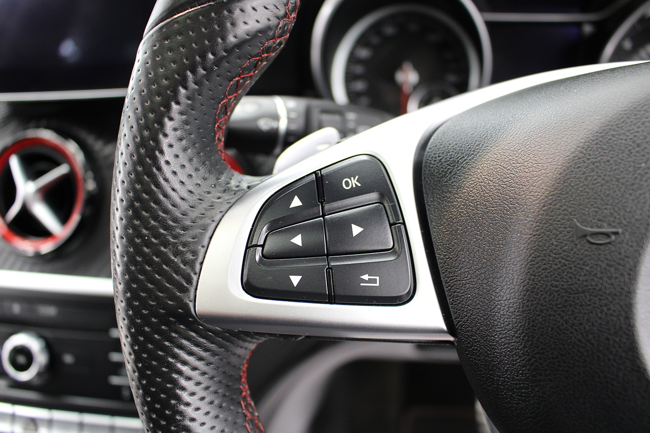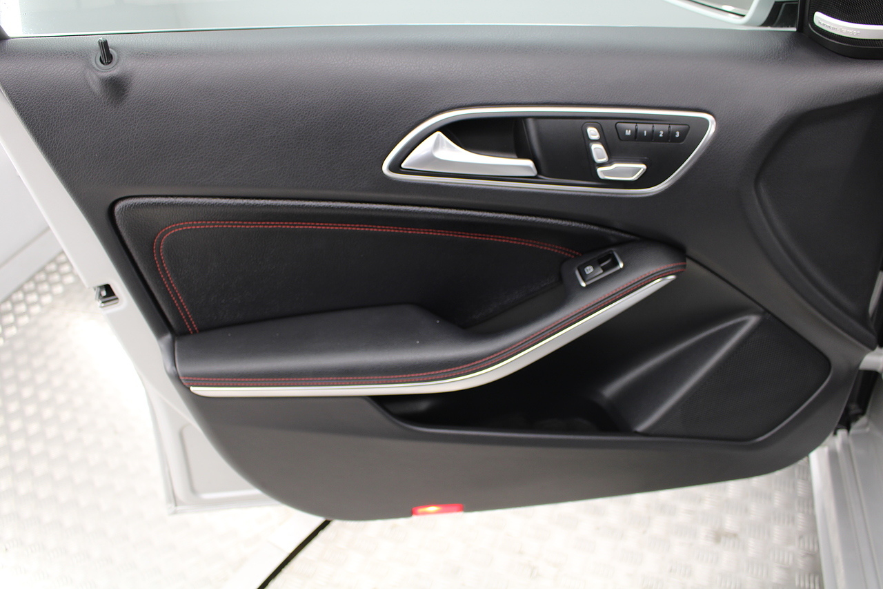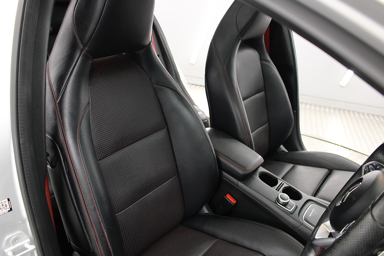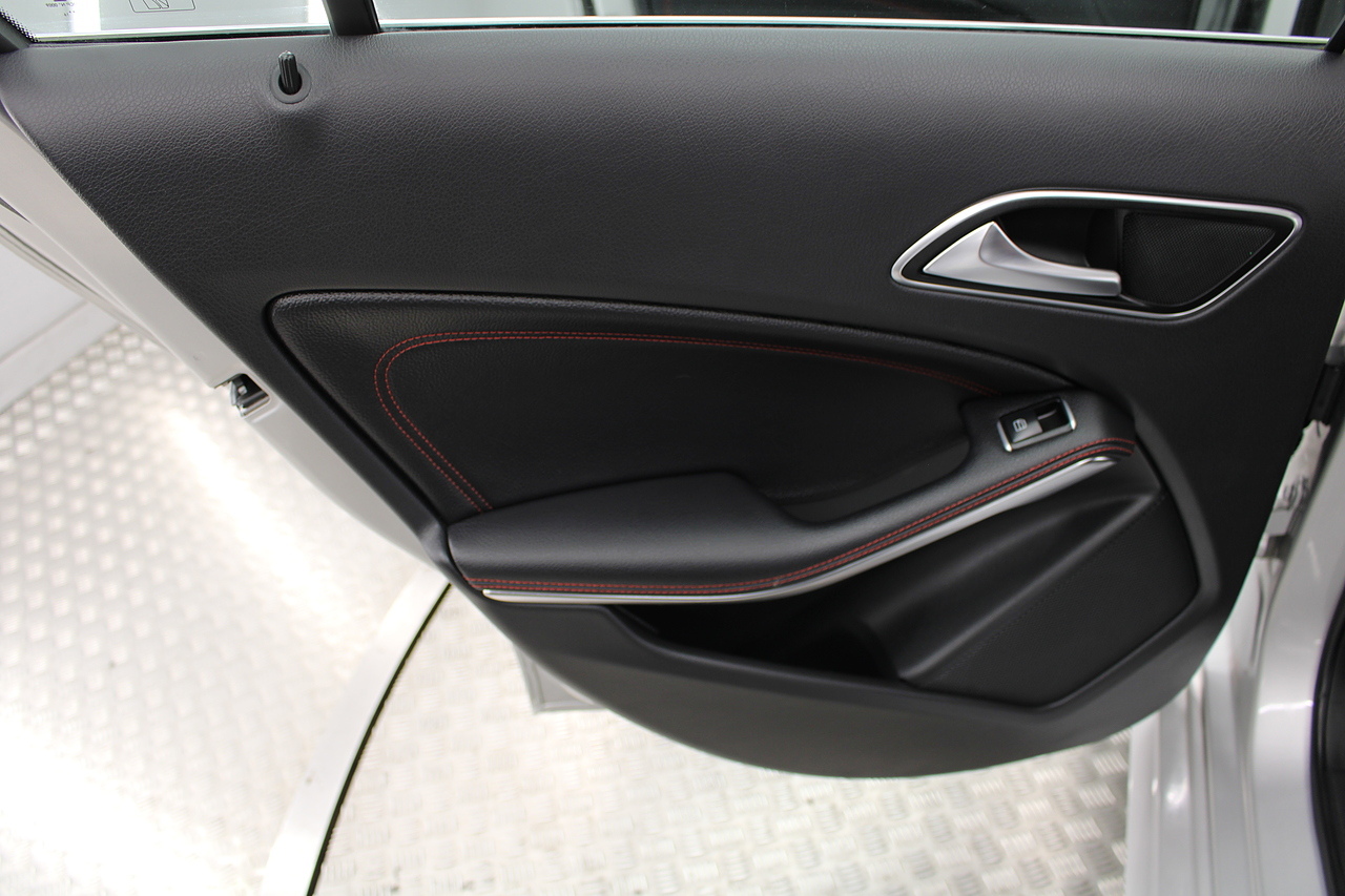 To the inside premium materials are used as you'd expect, with supportive and seats trimmed in the upgraded black leather with red perforations, with the front seats being heated, the centre of the dash houses a large full colour screen located in the middle of the dash with satellite navigation, reverse parking camera display, FM radio, Bluetooth connectivity with audio streaming, and also cruise control, this generation of the Mercedes Benz A Class is sleeker and longer, with styling that could turn the heads of traditional Volkswagen Golf buyers.