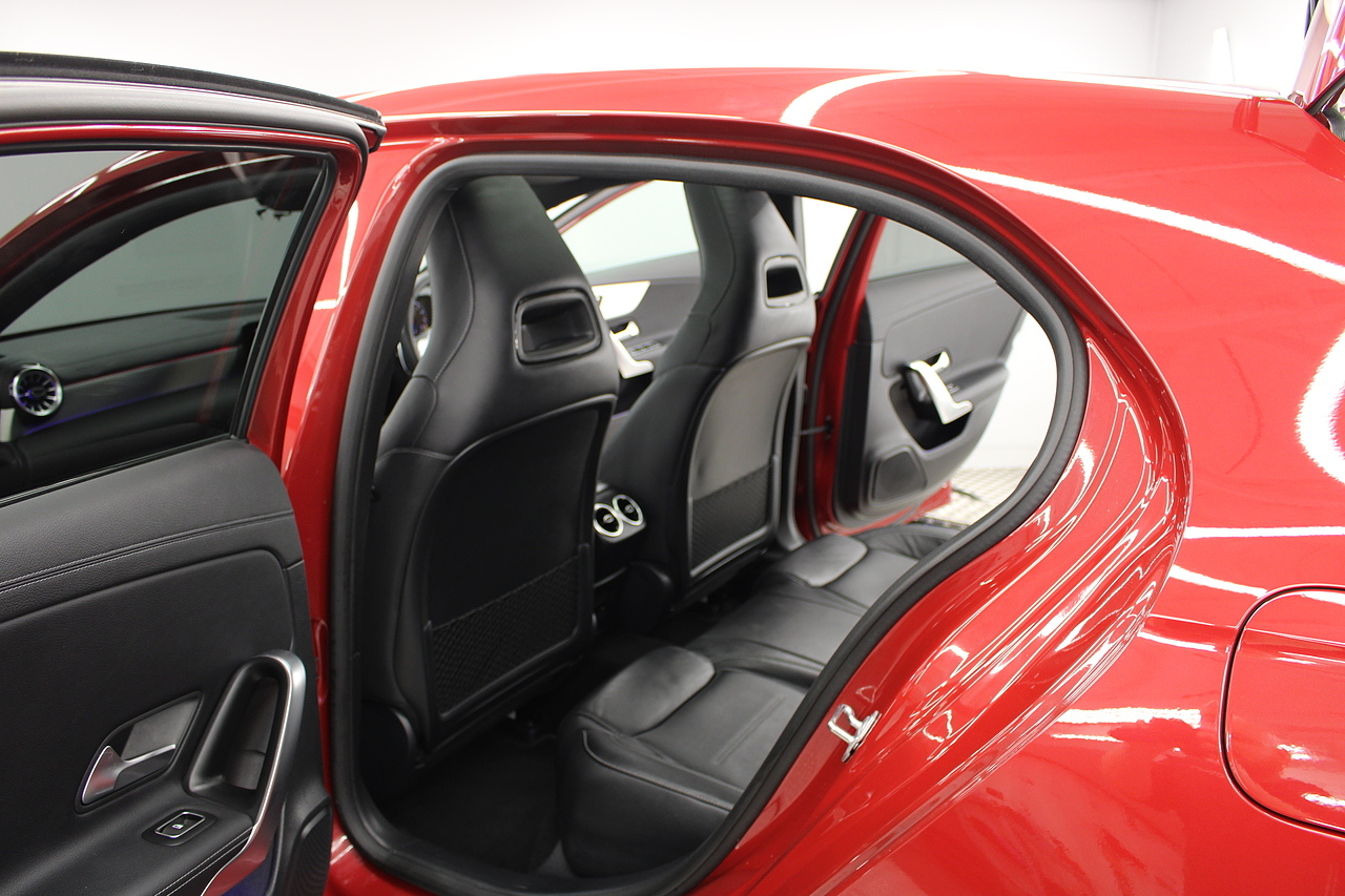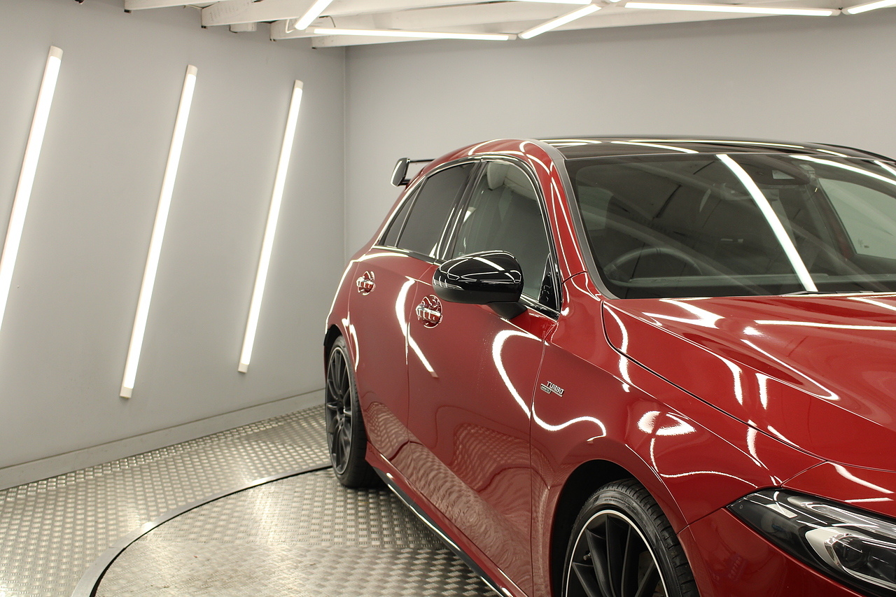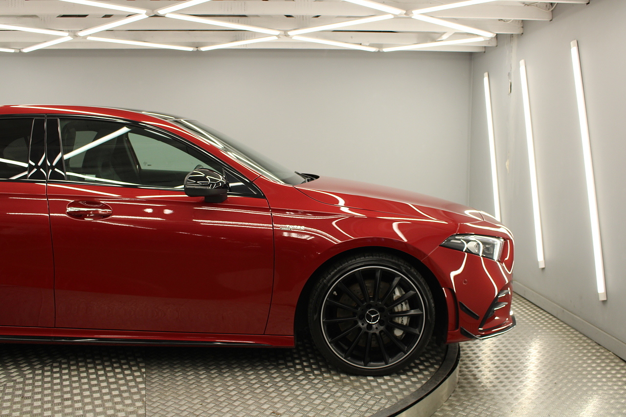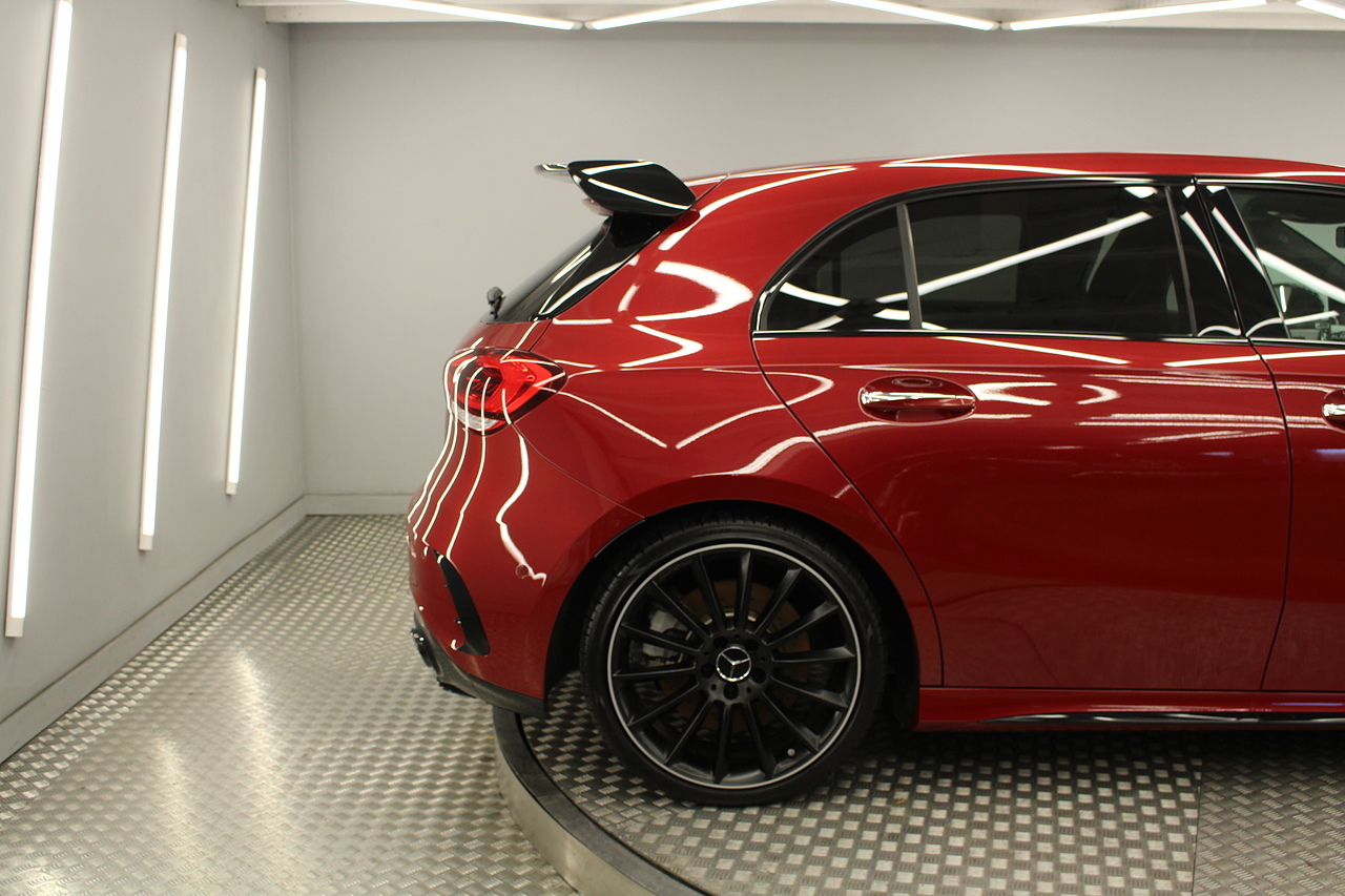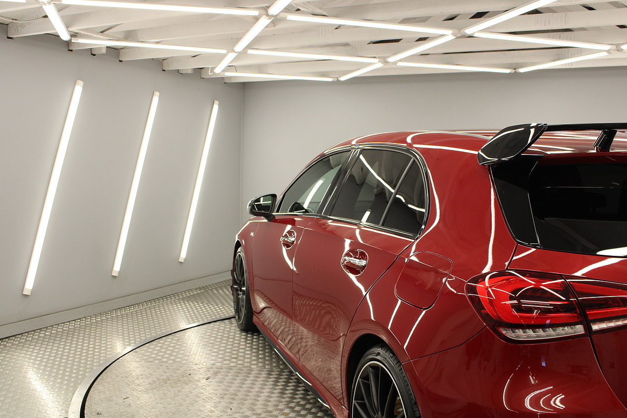Finished in the stunning Patagonia red with the AMG styling plus the aero package 19'' wheels, panoramic sunroof and privacy glass all give the AMG a menacing look, it looks every bit the hot hatch that it is.