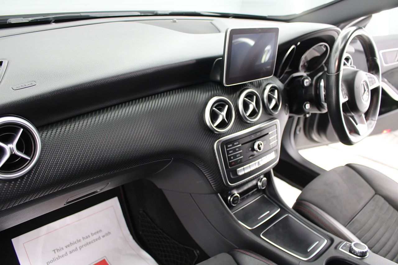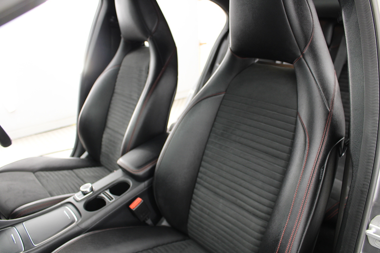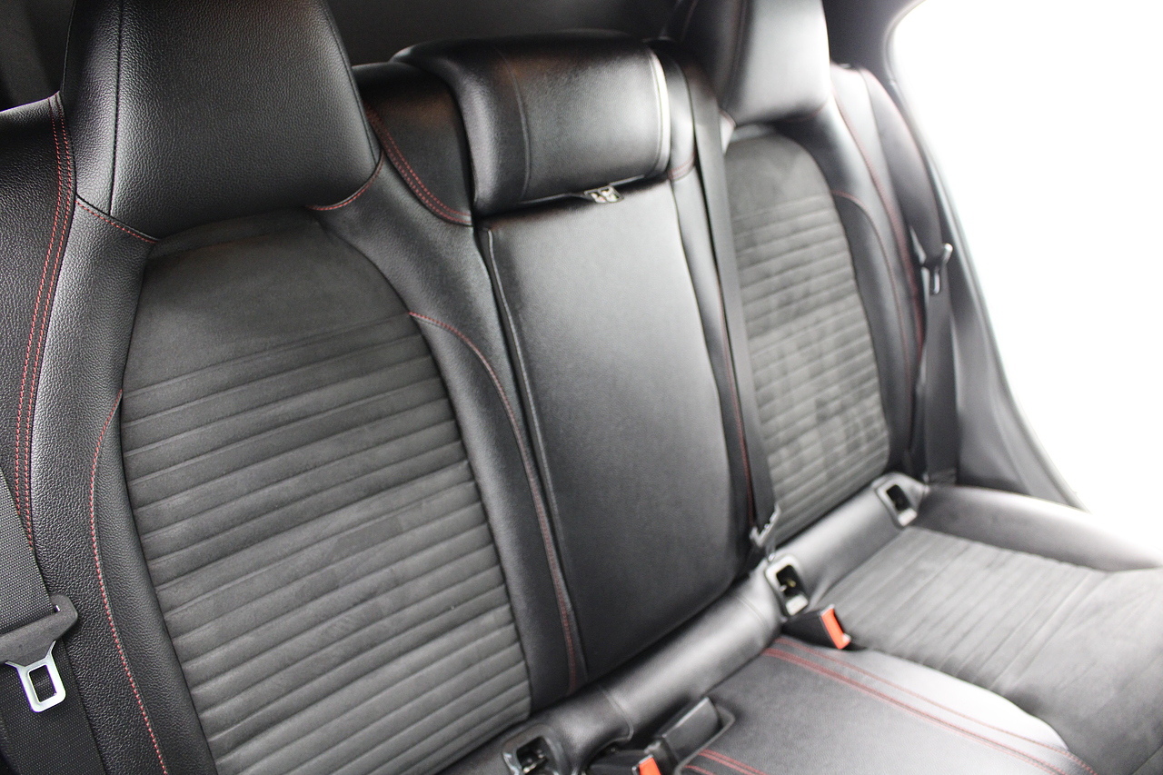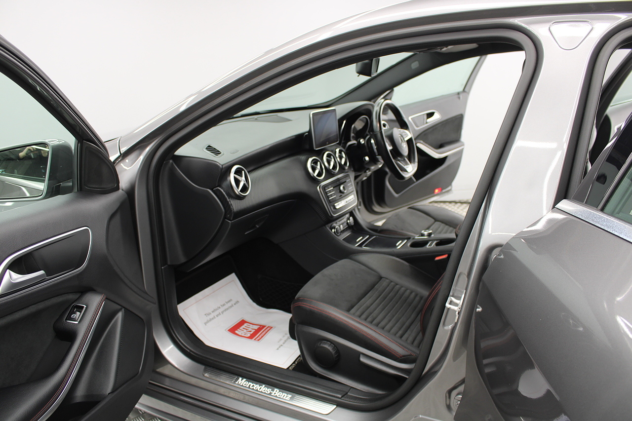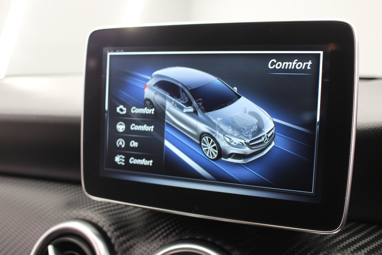 To the inside premium materials are used as you'd expect, with supportive and seats trimmed in black artico leather and with dark grey alcantara centres, with the front seats being both power adjustable and with memory function setting and heated, the centre of the dash houses a large full colour screen located in the middle of the dash with satellite navigation, reverse parking camera display, FM radio, Bluetooth connectivity with audio streaming, and also cruise control, this generation of the Mercedes Benz A Class is sleeker and longer, with styling that could turn the heads of traditional Volkswagen Golf buyers.