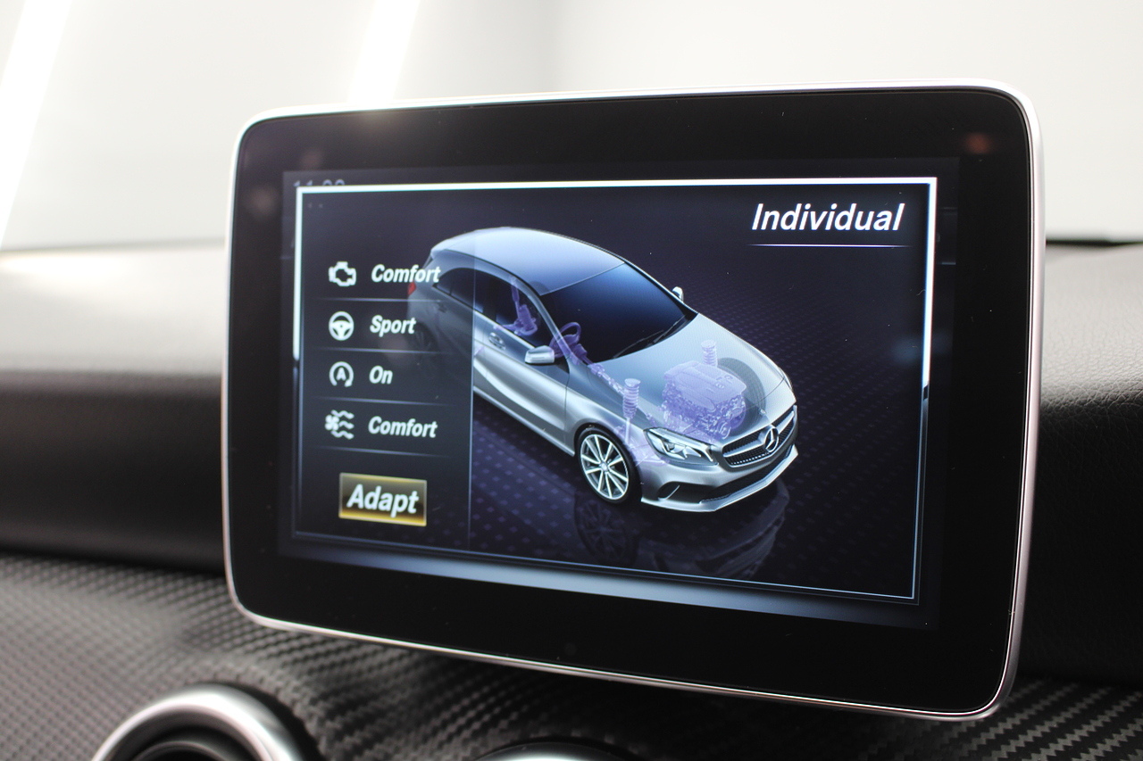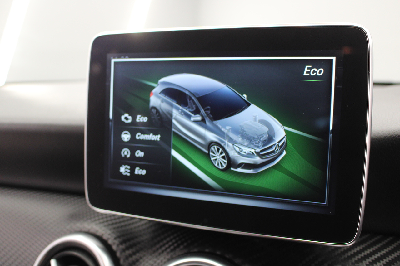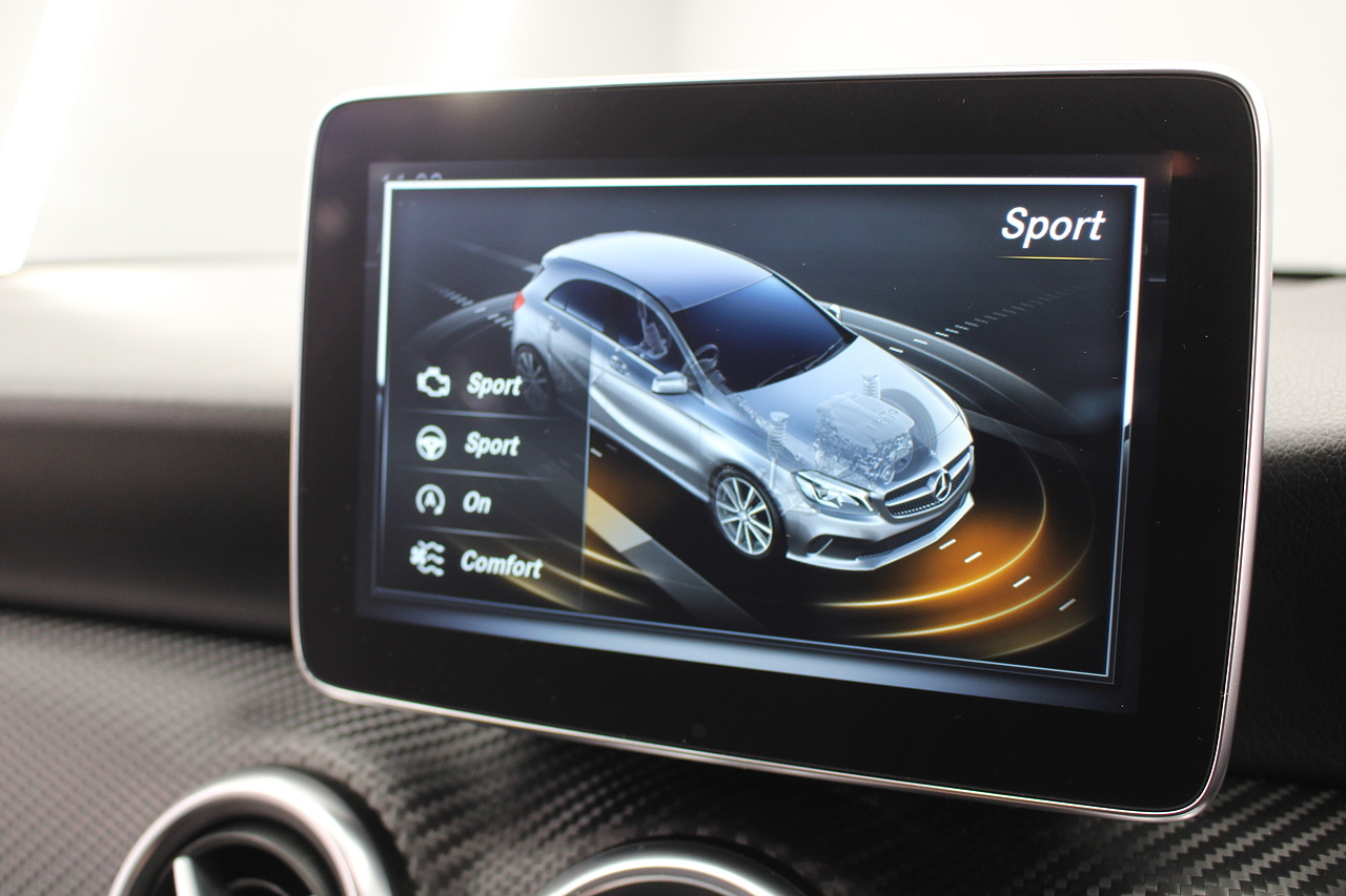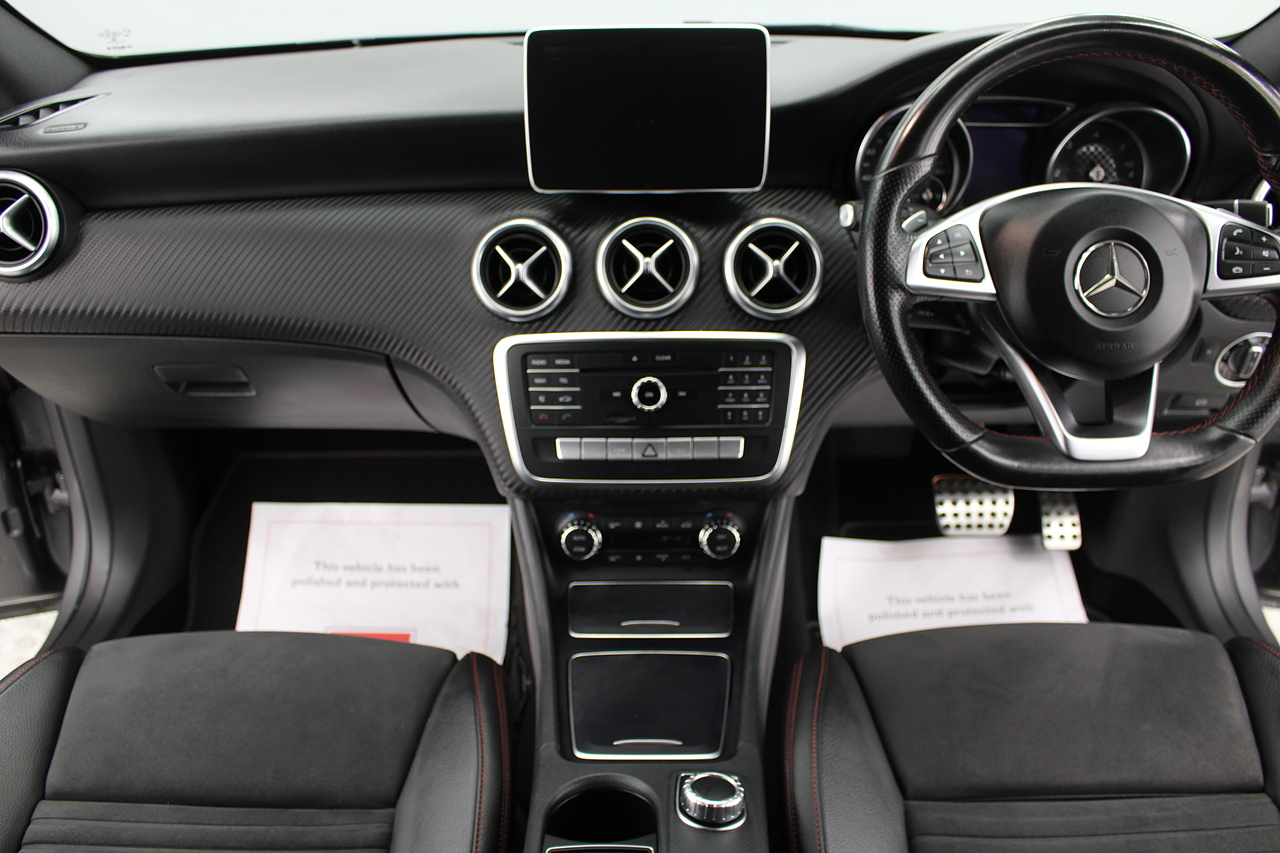 To the inside premium materials are used as you'd expect, with supportive and seats trimmed in black artico leather and with dark grey alcantara centres, with the front seats being both power adjustable and with memory function setting and heated, the centre of the dash houses a large full colour screen located in the middle of the dash with satellite navigation, reverse parking camera display, FM radio, Bluetooth connectivity with audio streaming, and also cruise control, this generation of the Mercedes Benz A Class is sleeker and longer, with styling that could turn the heads of traditional Volkswagen Golf buyers.