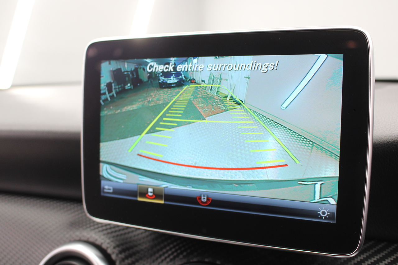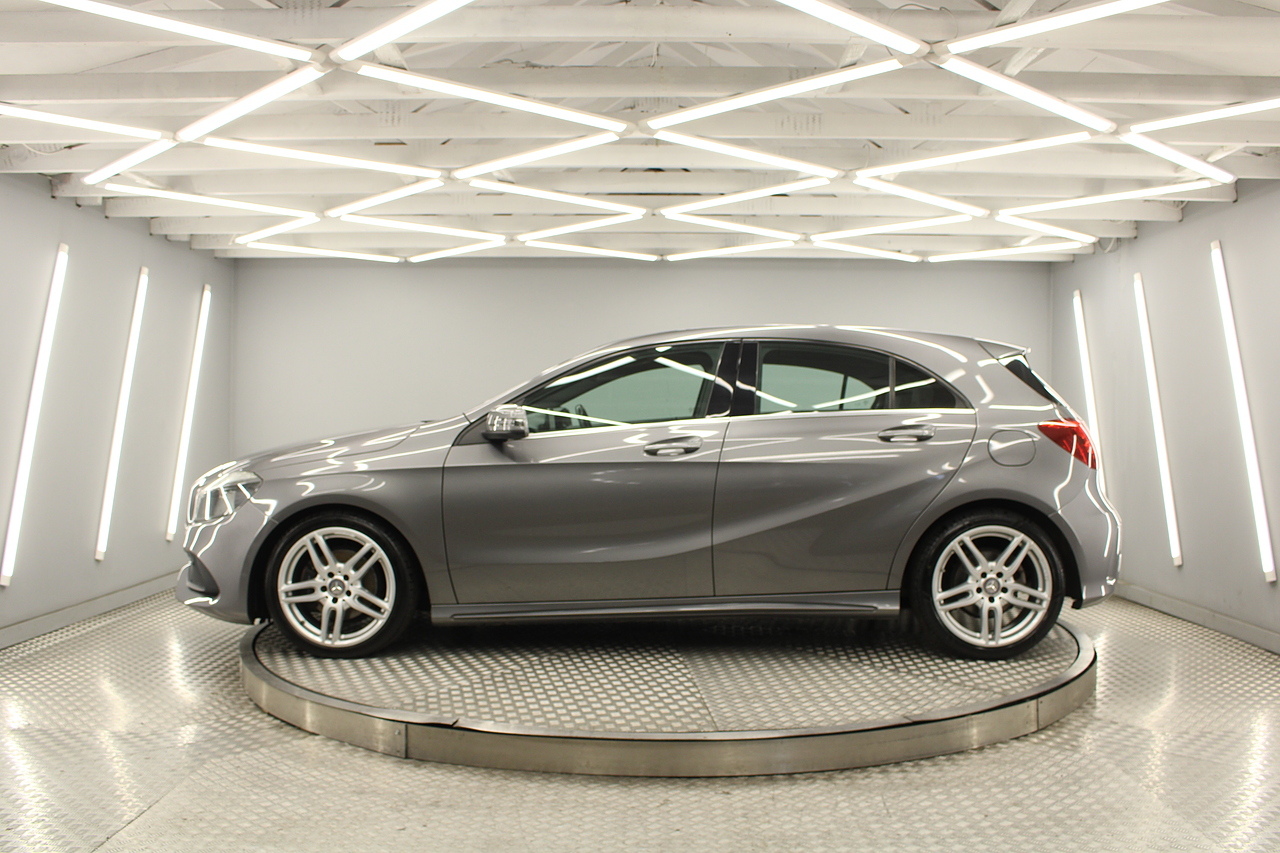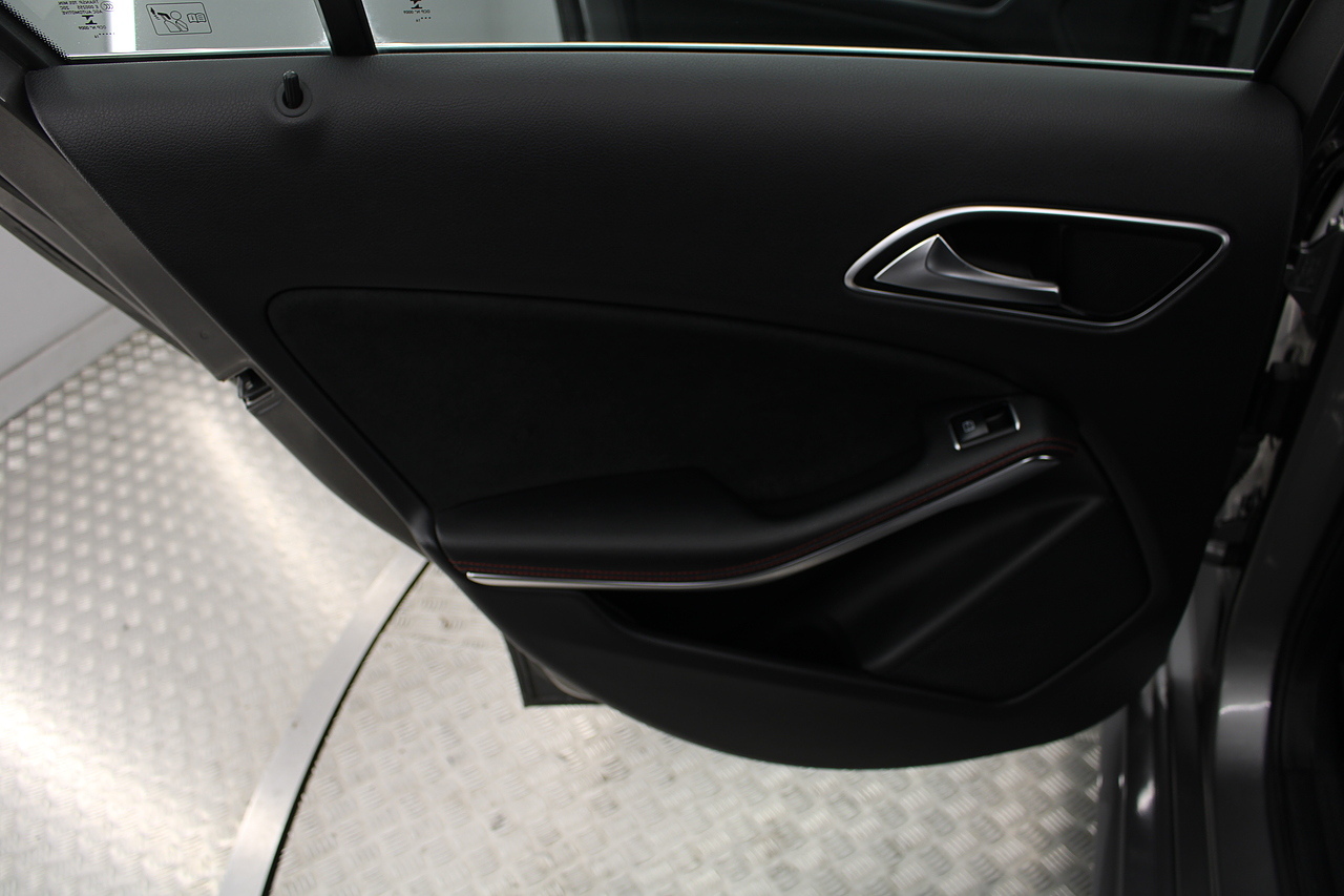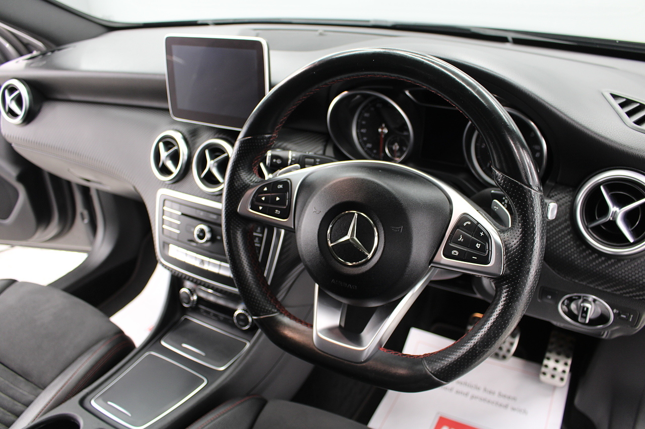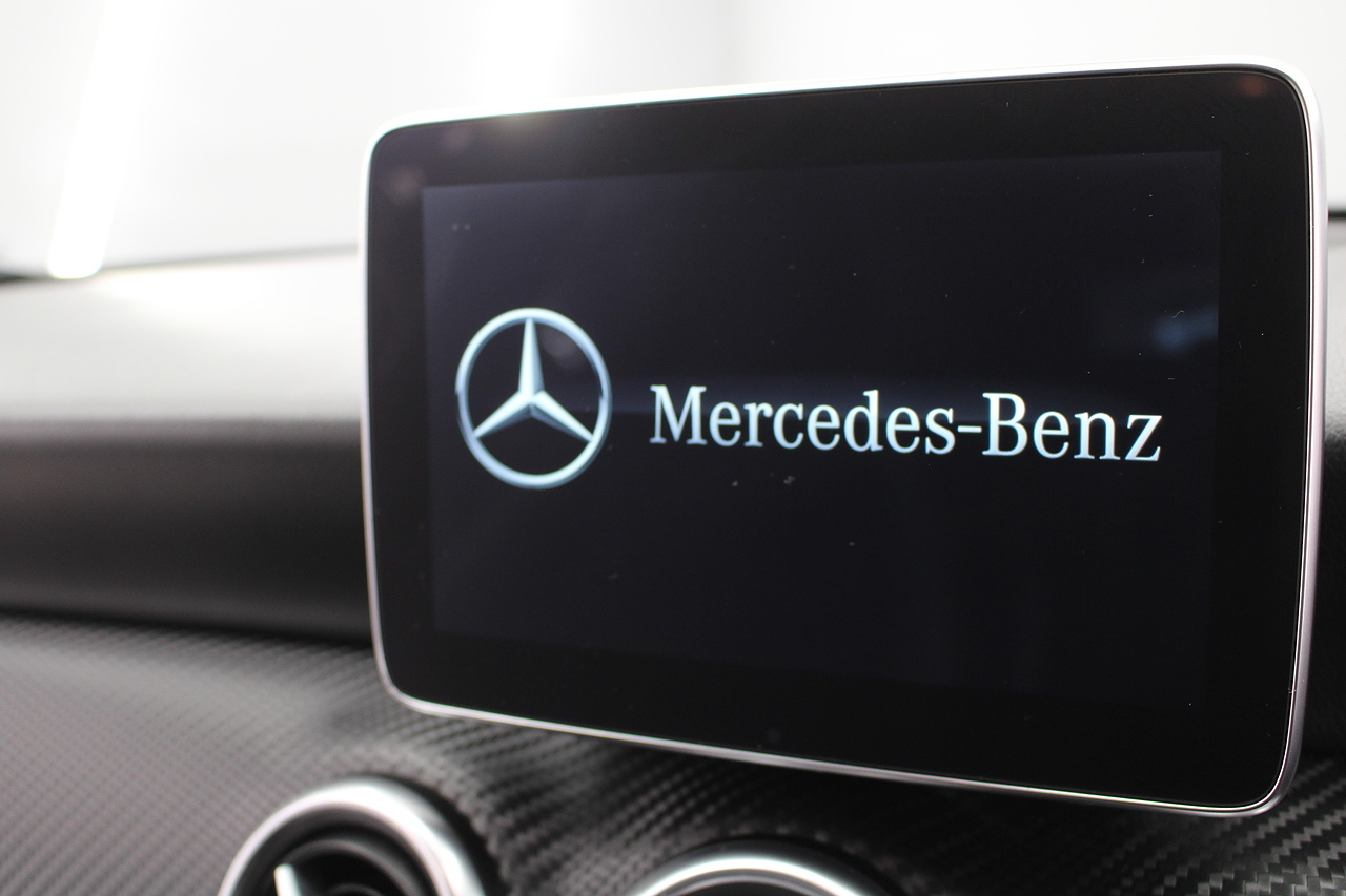 To the inside premium materials are used as you'd expect, with supportive and seats trimmed in black artico leather and with dark grey alcantara centres, with the front seats being both power adjustable and with memory function setting and heated, the centre of the dash houses a large full colour screen located in the middle of the dash with satellite navigation, reverse parking camera display, FM radio, Bluetooth connectivity with audio streaming, and also cruise control, this generation of the Mercedes Benz A Class is sleeker and longer, with styling that could turn the heads of traditional Volkswagen Golf buyers.