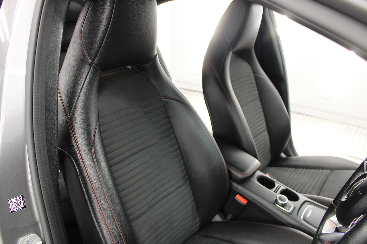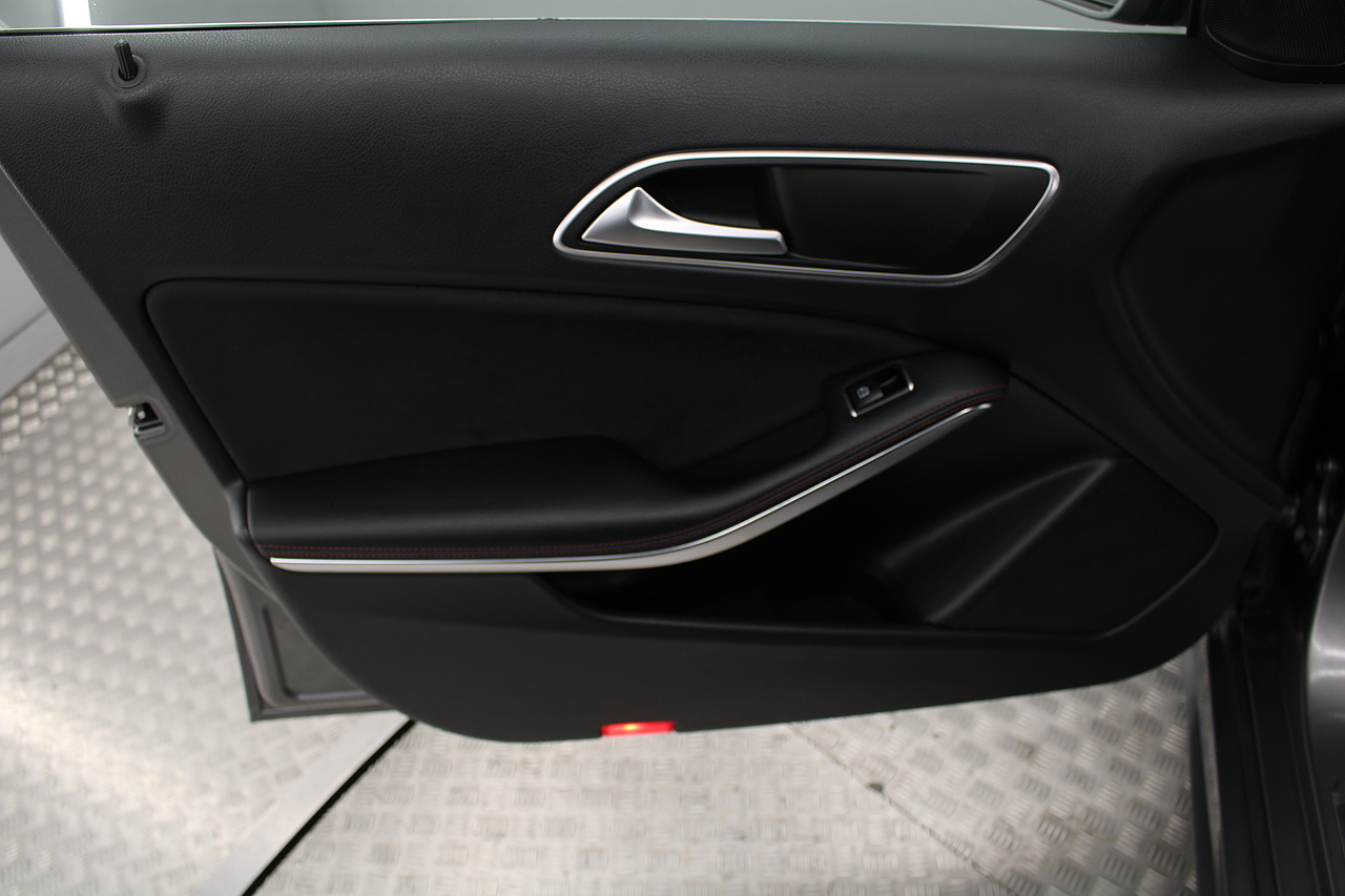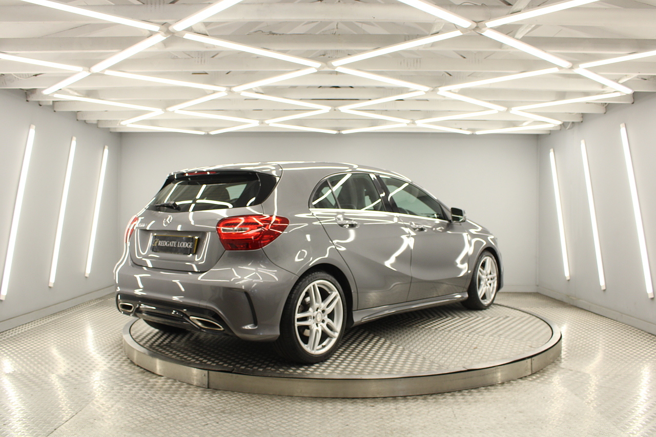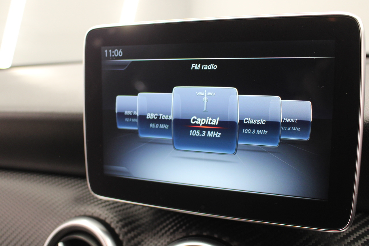 To the inside premium materials are used as you'd expect, with supportive and seats trimmed in black artico leather and with dark grey alcantara centres, with the front seats being both power adjustable and with memory function setting and heated, the centre of the dash houses a large full colour screen located in the middle of the dash with satellite navigation, reverse parking camera display, FM radio, Bluetooth connectivity with audio streaming, and also cruise control, this generation of the Mercedes Benz A Class is sleeker and longer, with styling that could turn the heads of traditional Volkswagen Golf buyers.