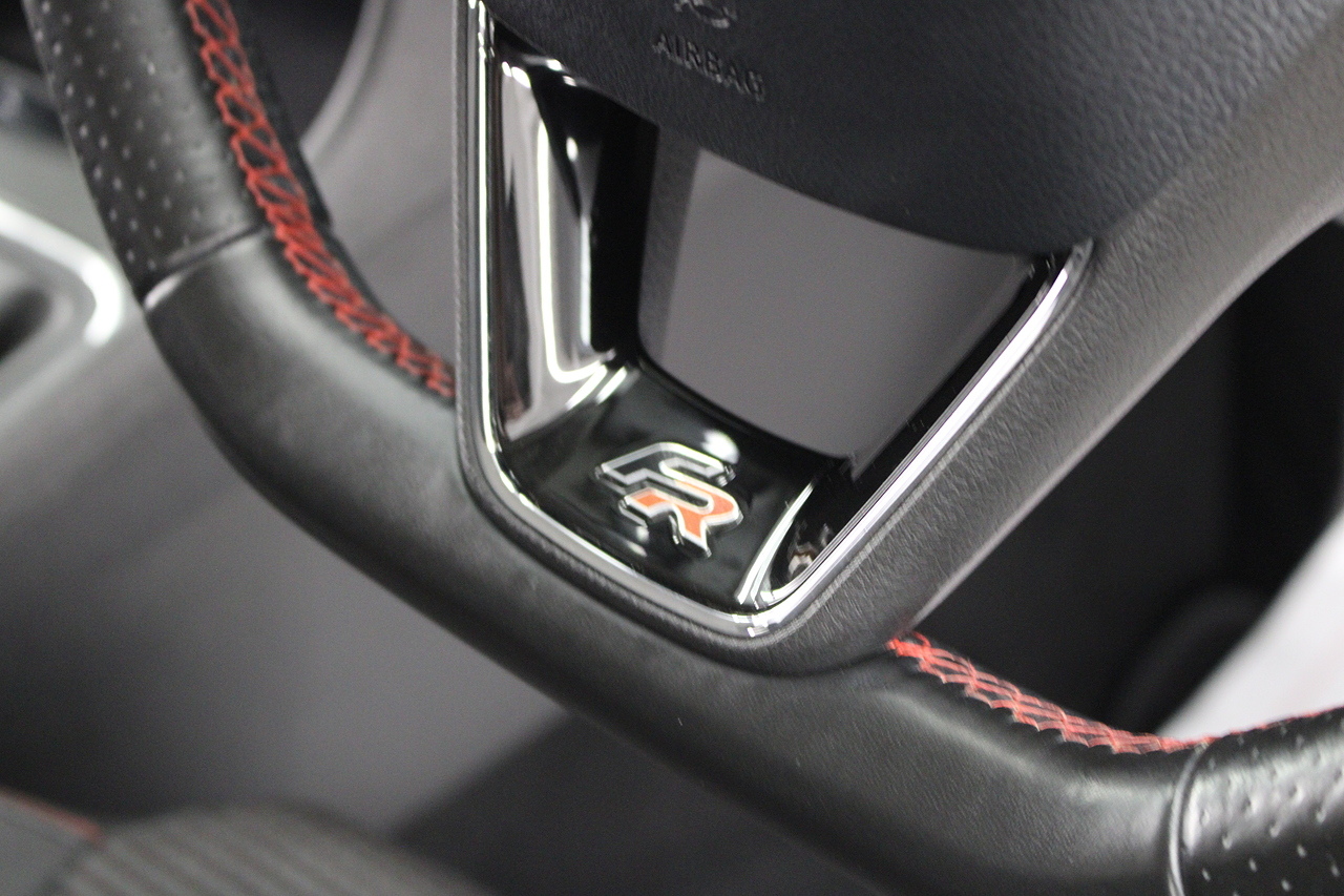 • Steering Wheel - Flat-Bottomed Perforated Leather with Red Stitching and FR Logo