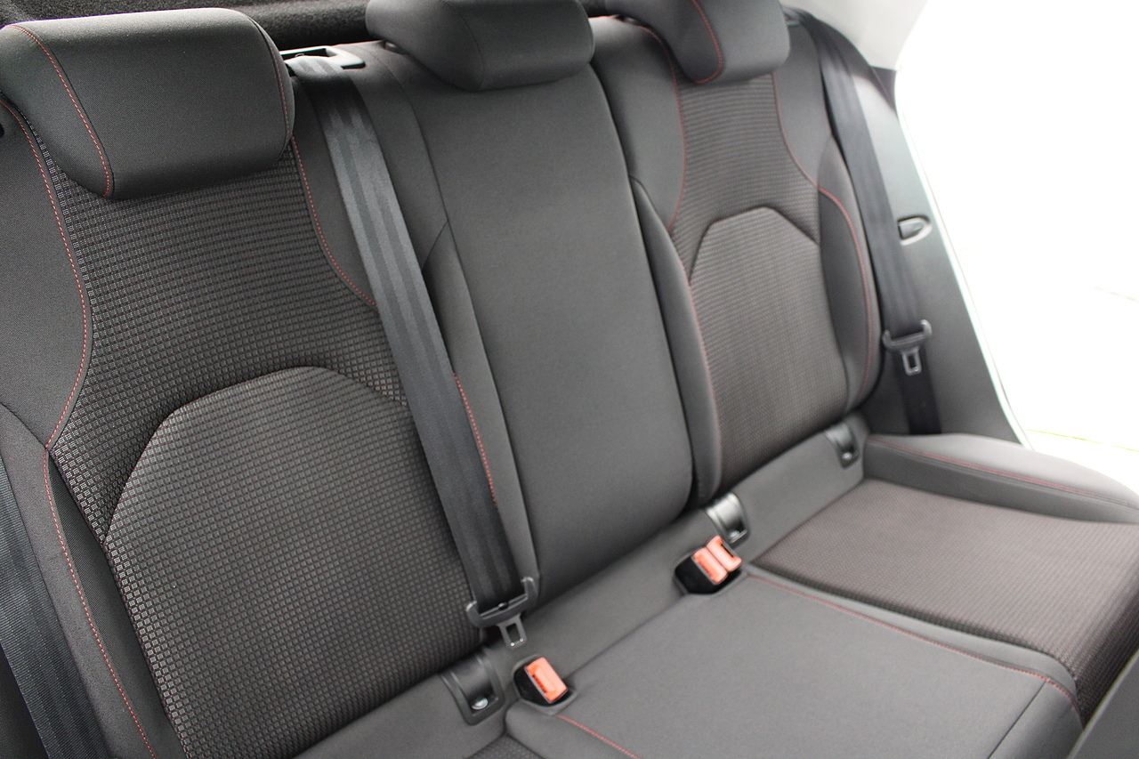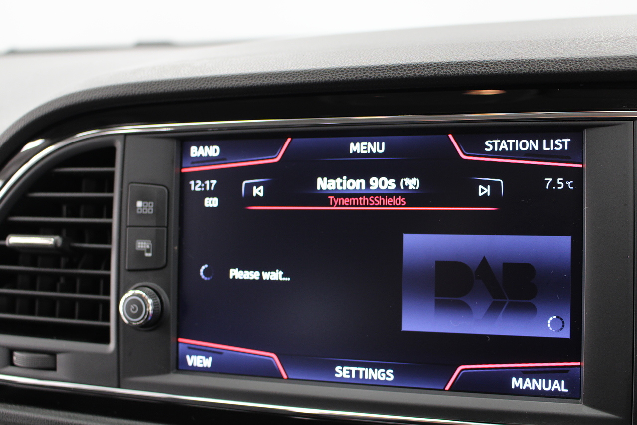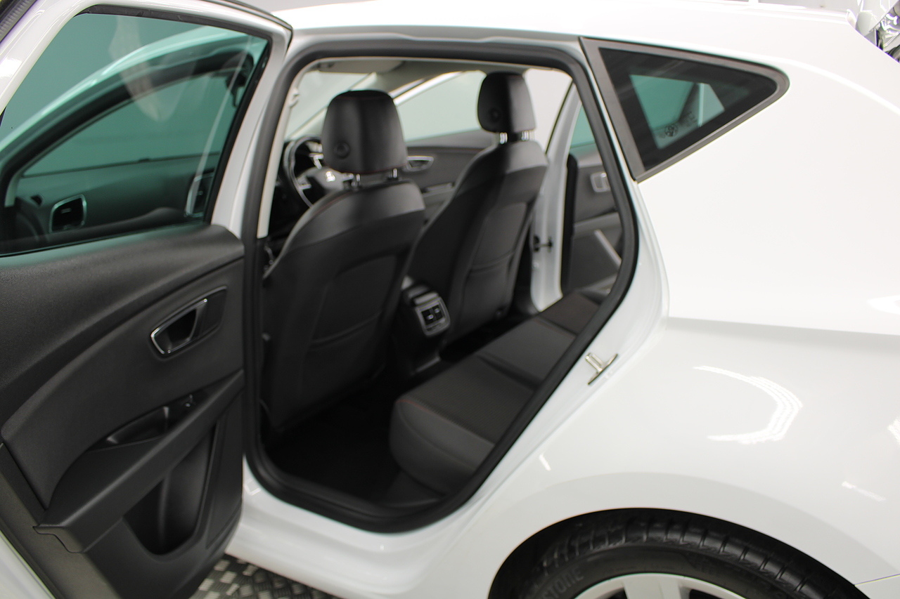 To the interior, you'll see the very comfortable and supportive sports seats trimmed in the dark cloth trim with leather edging, beautiful touches of piano black across the centre console, Bluetooth connectivity, full colour touch screen with DAB radio in addition to apple car play and Android Auto, as well as also benefitting from rear parking sensors. The Seat Leon FR. It's also quite a lot faster on the road than offerings such as the Ford Focus, and comfier and more accessible than all of the above.