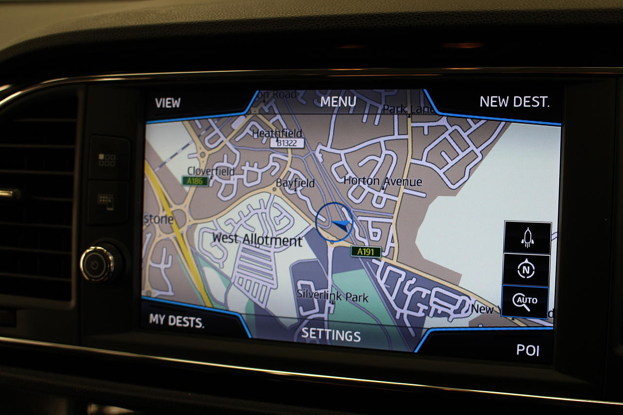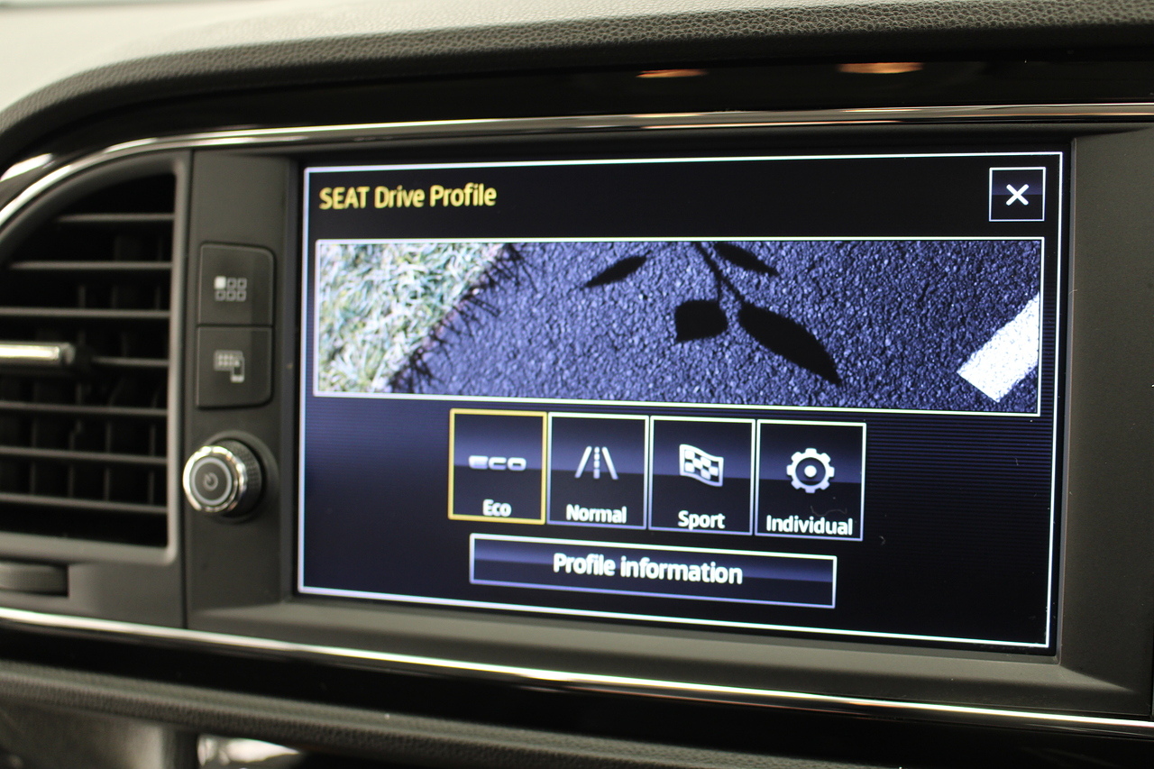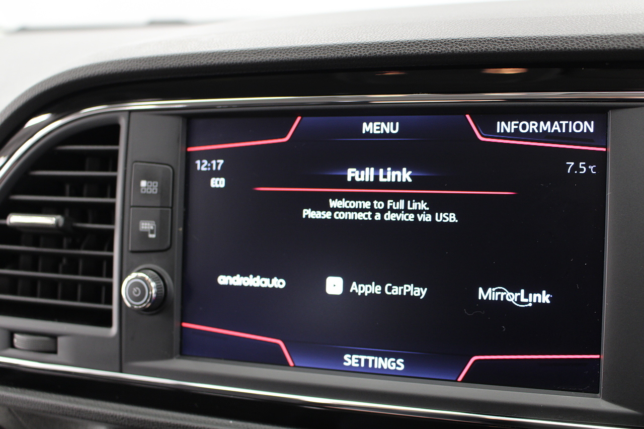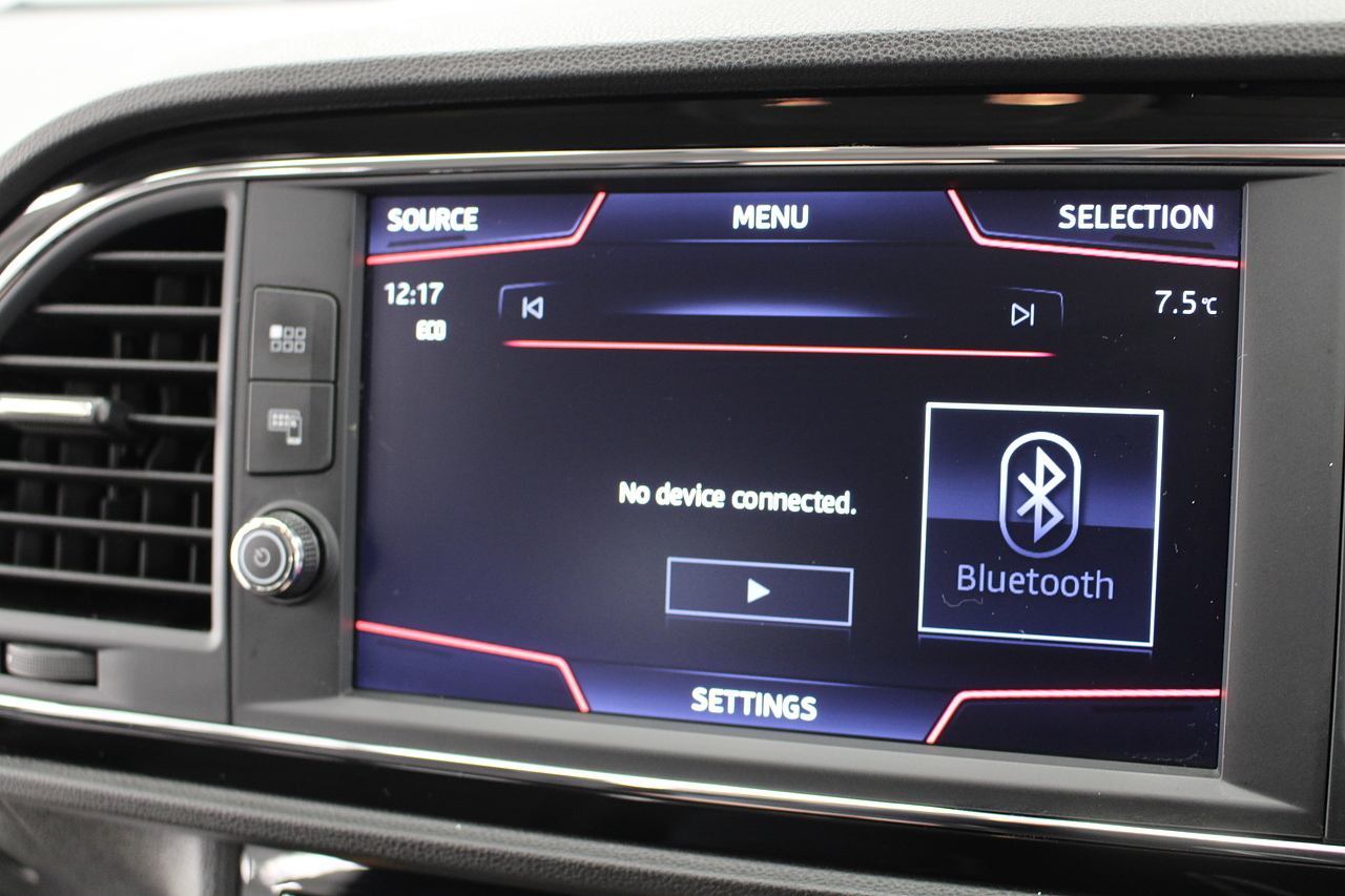 To the interior, you'll see the very comfortable and supportive sports seats trimmed in the dark cloth trim with leather edging, beautiful touches of piano black across the centre console, Bluetooth connectivity, full colour touch screen with DAB radio in addition to apple car play and Android Auto, as well as also benefitting from rear parking sensors. The Seat Leon FR. It's also quite a lot faster on the road than offerings such as the Ford Focus, and comfier and more accessible than all of the above.