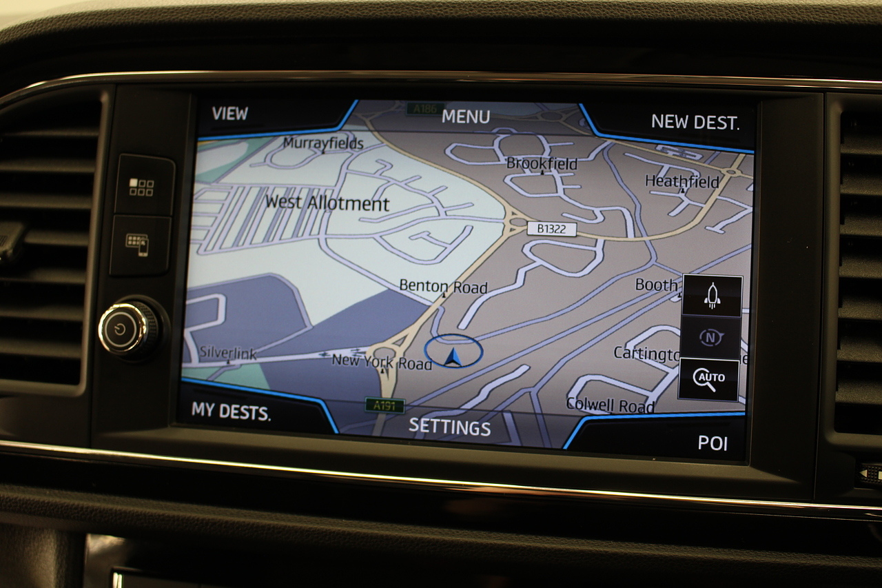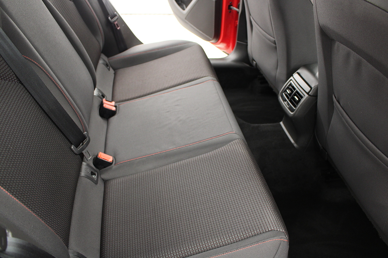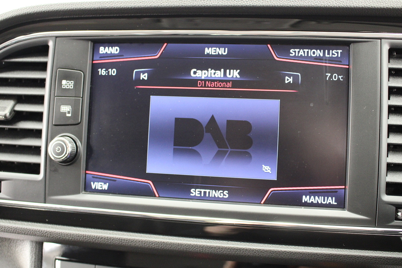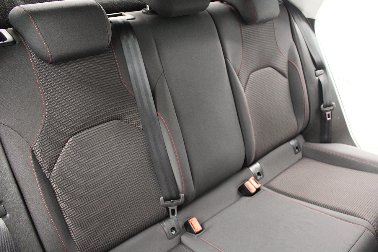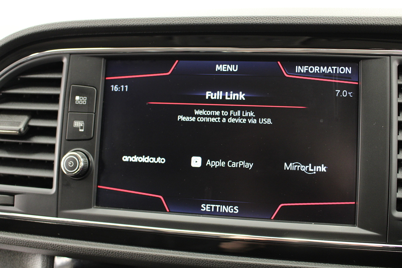 To the interior, you'll see the very comfortable and supportive sports seats trimmed in the dark cloth trim with leather edging, beautiful touches of piano black across the centre console, Bluetooth connectivity, full colour touch screen with DAB radio in addition to apple car play and Android Auto, as well as also benefitting from rear parking sensors. The Seat Leon FR. It's also quite a lot faster on the road than offerings such as the Ford Focus, and comfier and more accessible than all of the above.