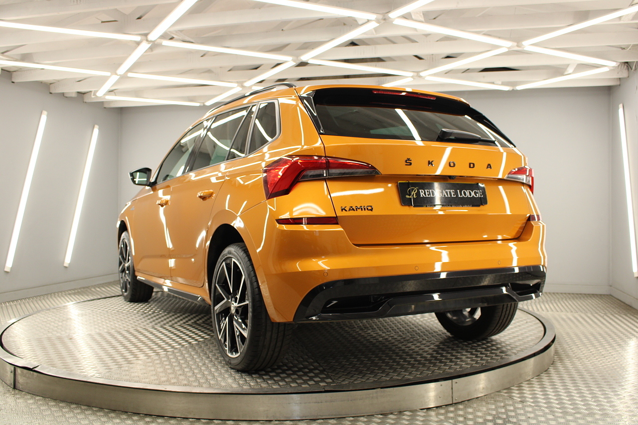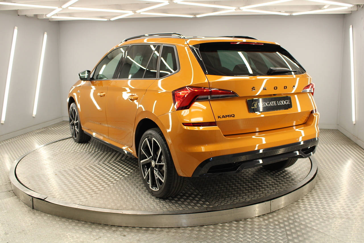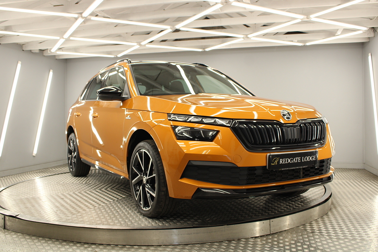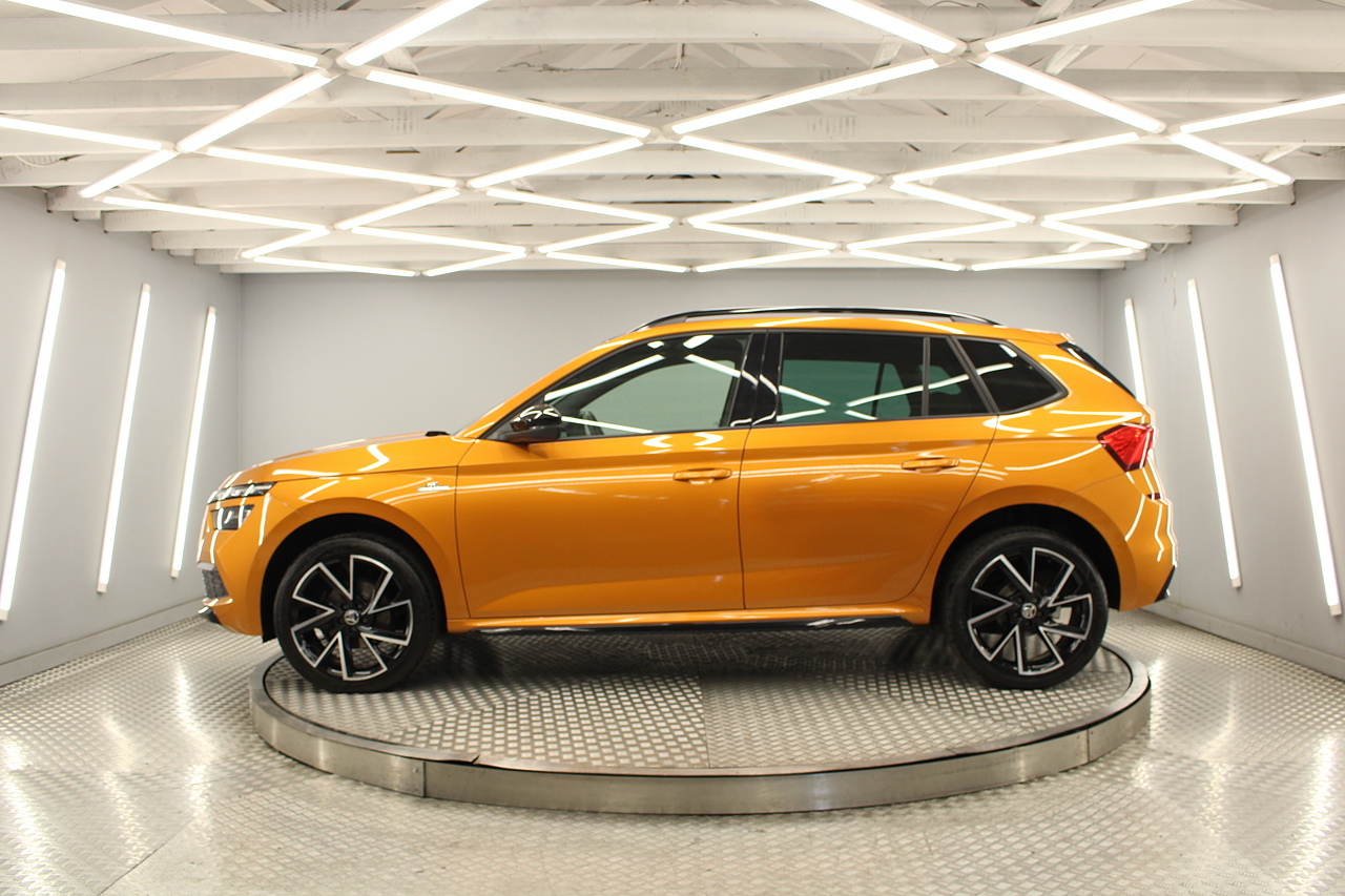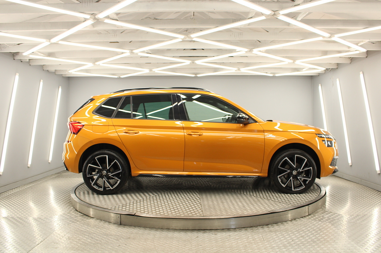 This is our beautiful 2022 Skoda Kamiq Monte Carlo. This particular model is the 1.5 TFSI, which produces 149 BHP, enough power to move this along comfortably, yet still manages an impressive average MPG of 47 for a car of this size and performance is excellent.