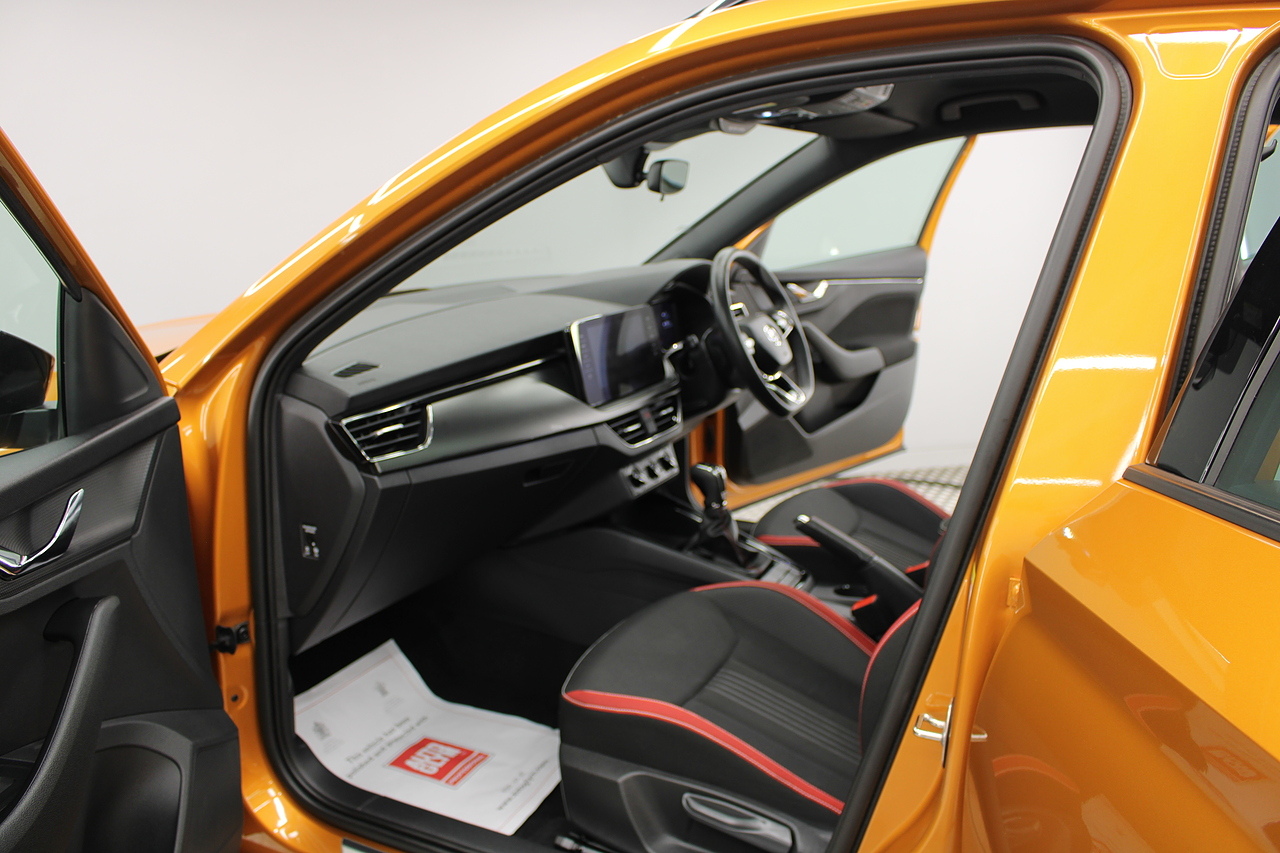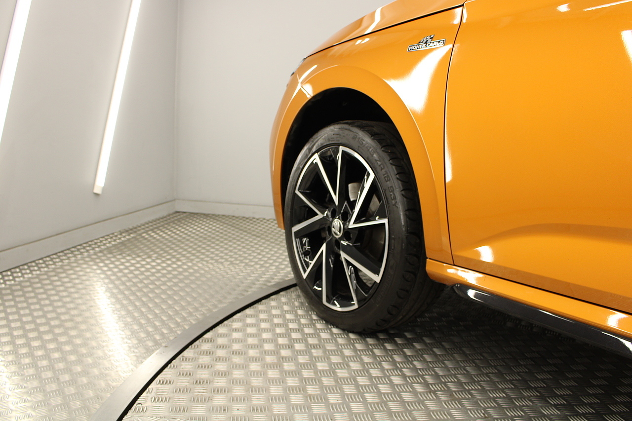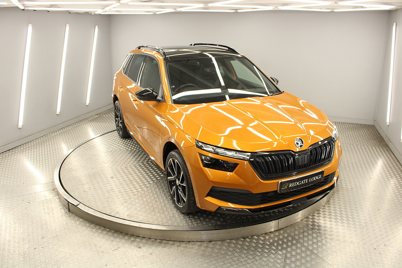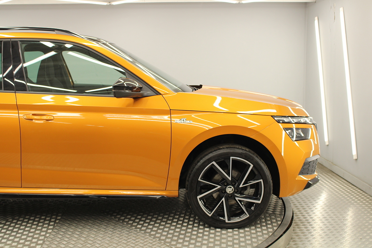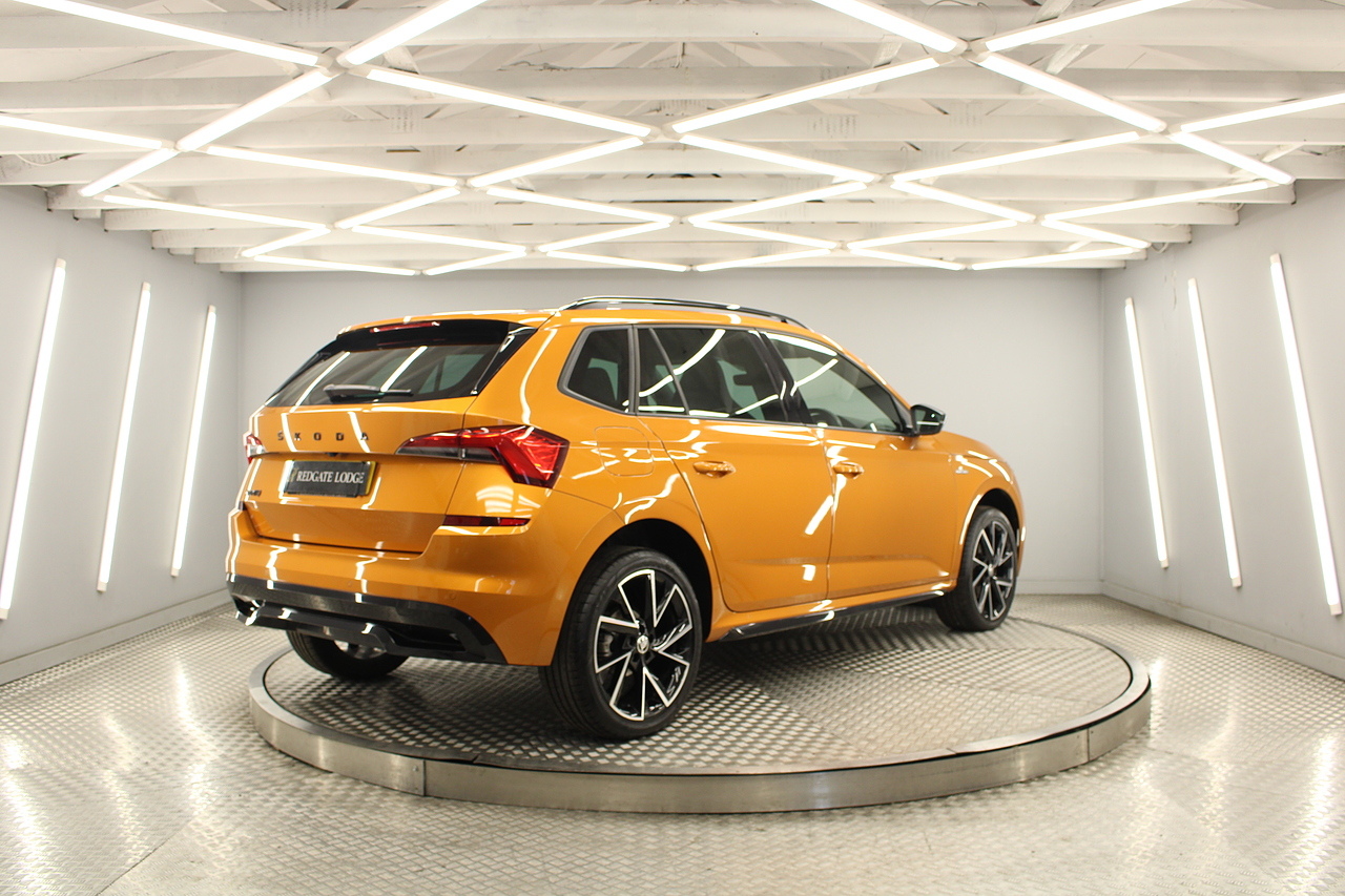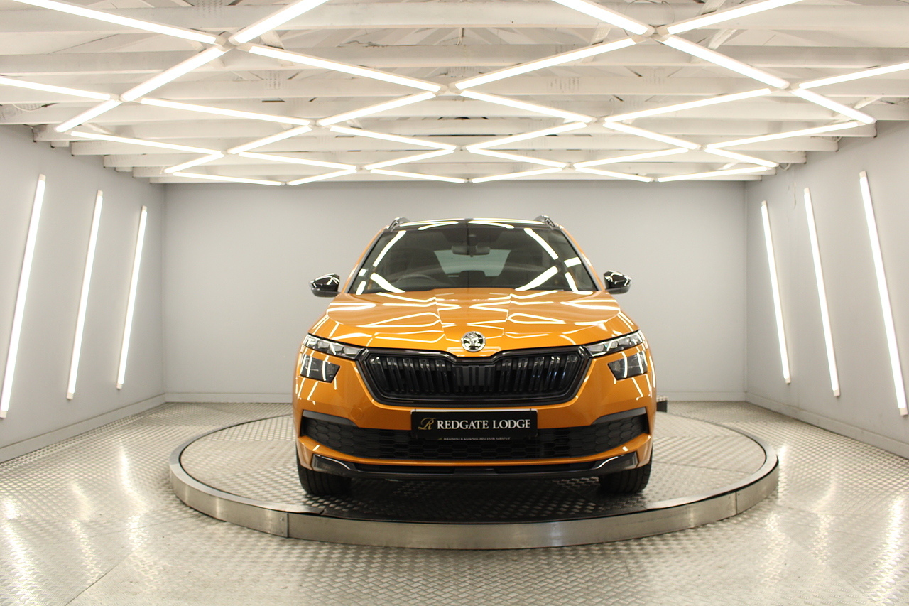 This is our beautiful 2022 Skoda Kamiq Monte Carlo. This particular model is the 1.5 TFSI, which produces 149 BHP, enough power to move this along comfortably, yet still manages an impressive average MPG of 47 for a car of this size and performance is excellent.