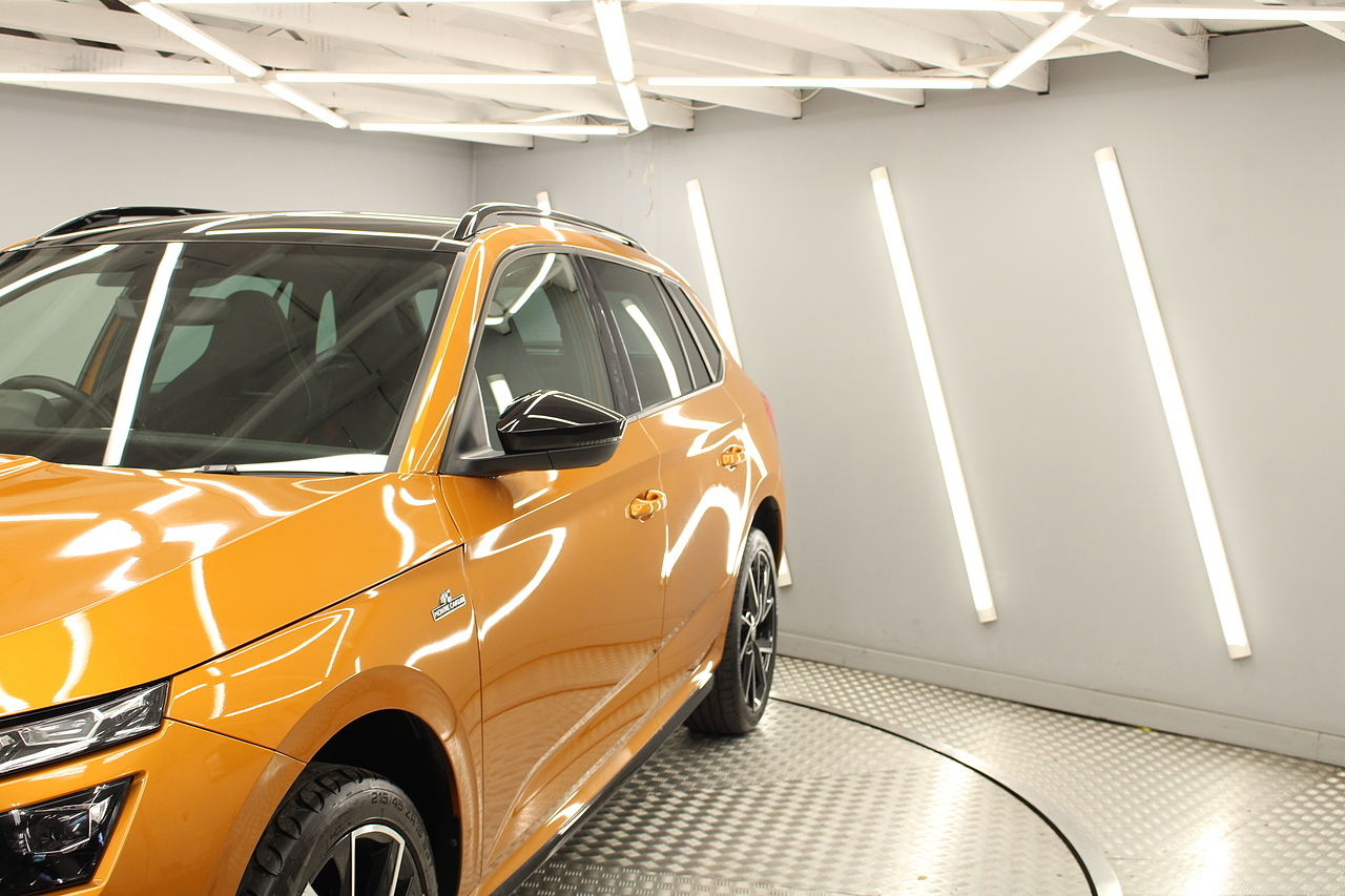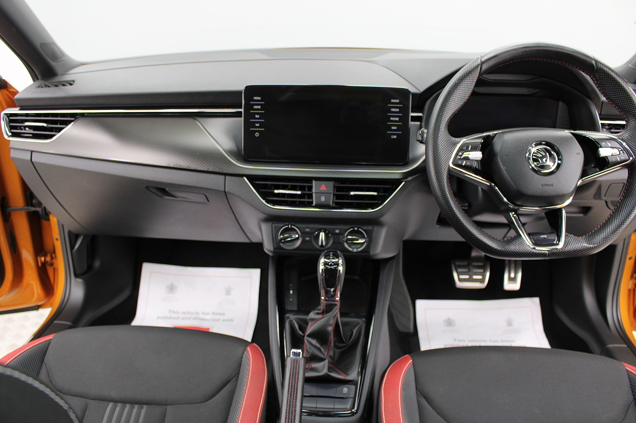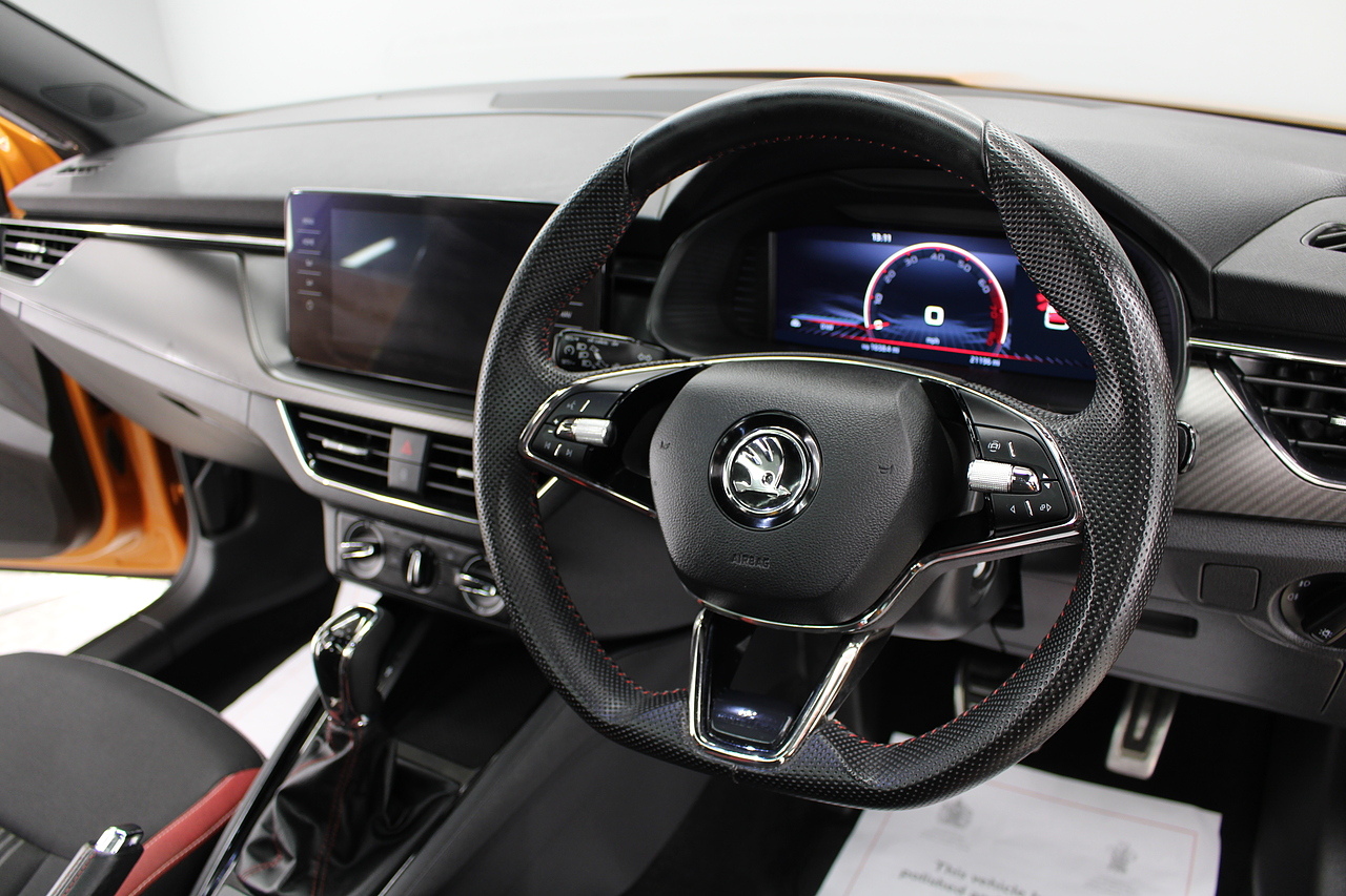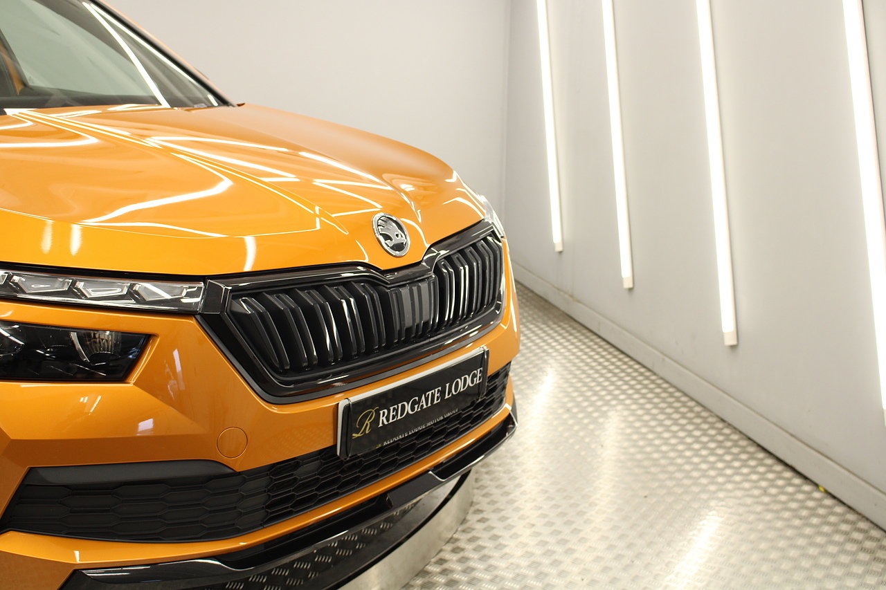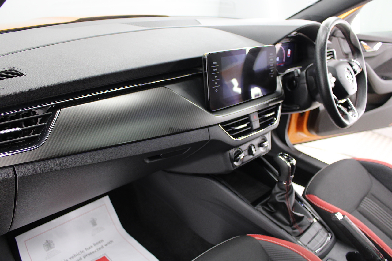 This is our beautiful 2022 Skoda Kamiq Monte Carlo. This particular model is the 1.5 TFSI, which produces 149 BHP, enough power to move this along comfortably, yet still manages an impressive average MPG of 47 for a car of this size and performance is excellent.