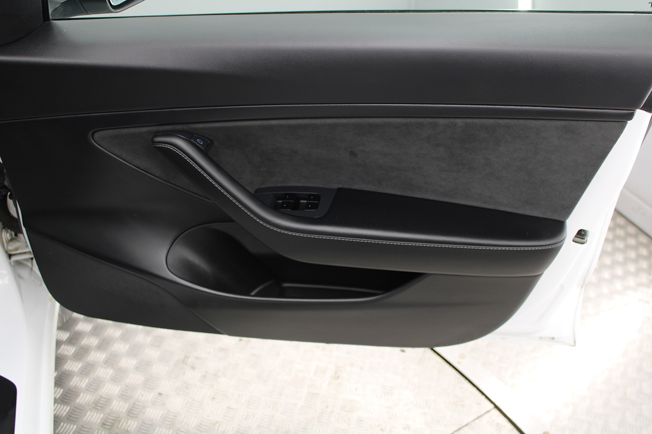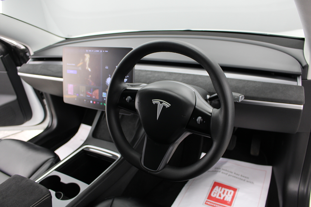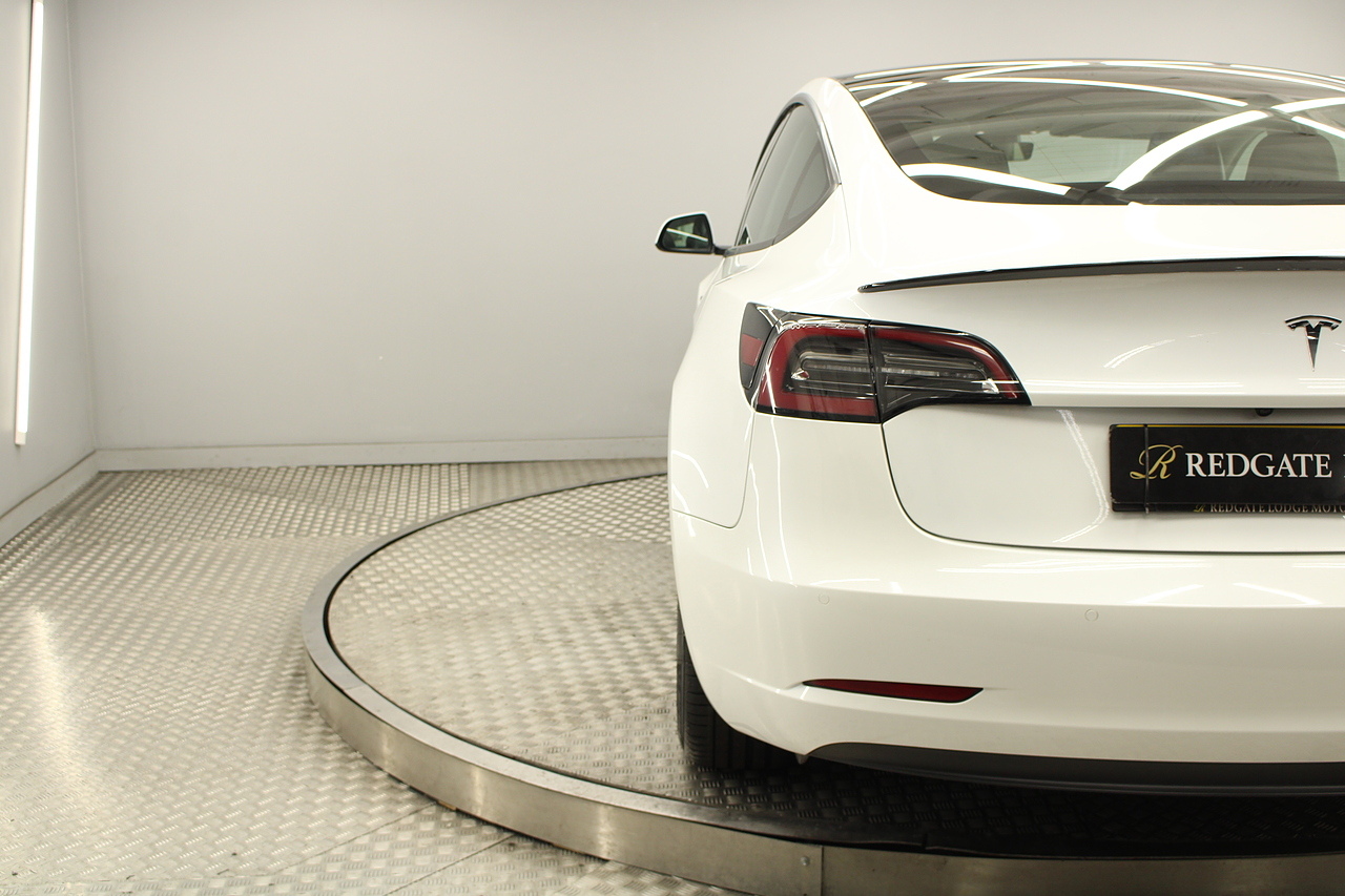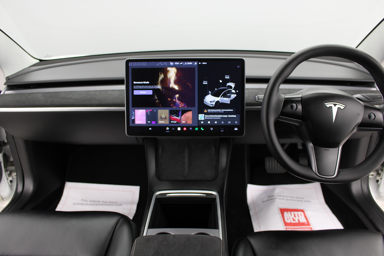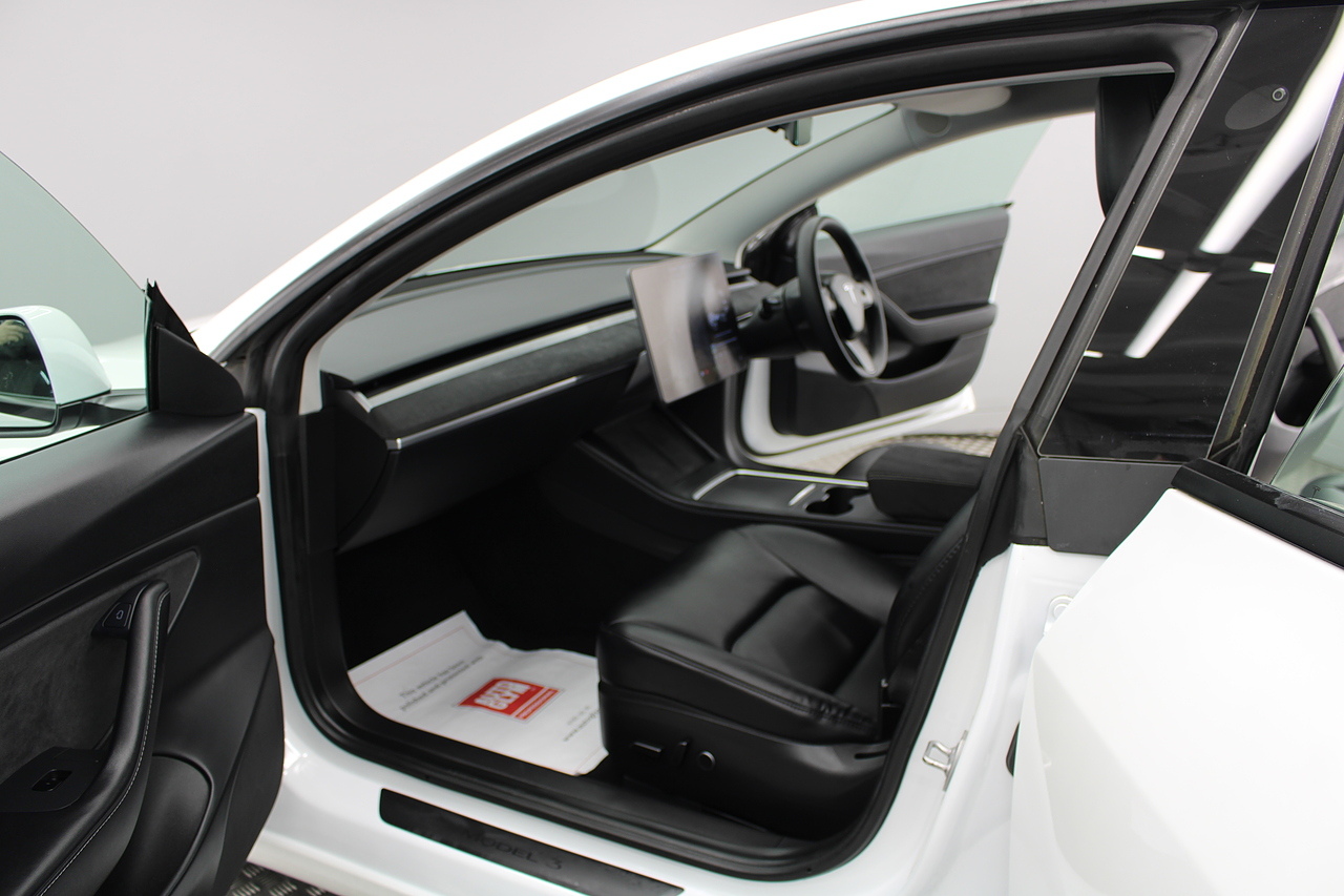 The interior is very well laid out and uncomplicated with a superb central control unit which controls everything from the climate control, heated seats both front and rear along with the heated steering wheel, 360 camera system, satellite navigation, parking assist features all around the car and an array of applications, plus fun apps such as the light show, romance setting and games, there are also handy driver aids such as cruise control with auto braking, power tailgate the parking cameras all round with sentry mode to keep an eye on your car whilst you are not in it, All of this can also be controlled by an app and set the internal temperature remotely before you get into the car, meaning no more freezing mornings or red hot uncomfortable summers getting into the car. The seats are trimmed in black premium engineered material, with power adjustment and heated function with smart light wood panels across the dashboard. This Model 3 is a superb all round car than can do every thing you would need from a family car.