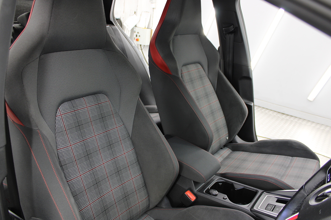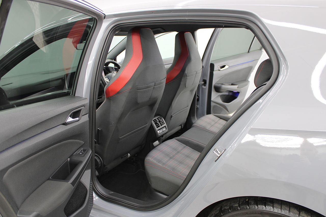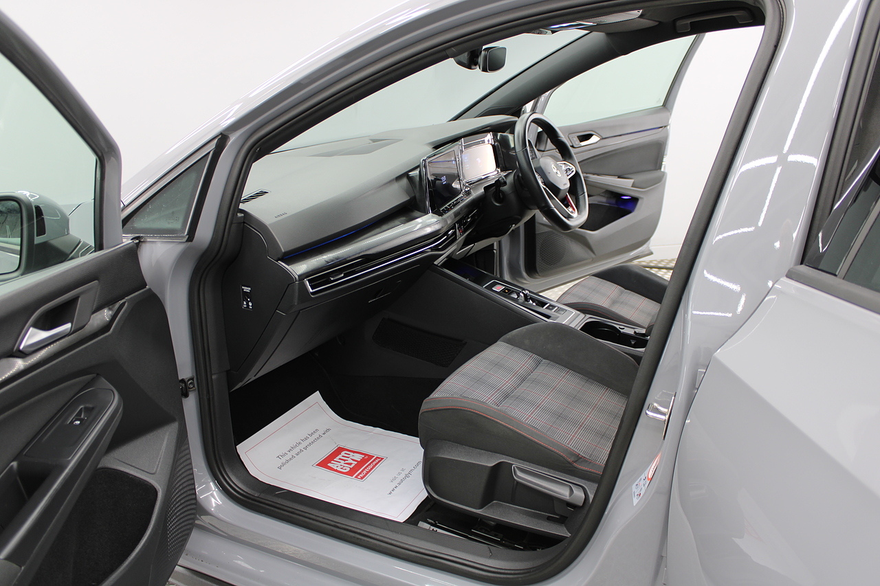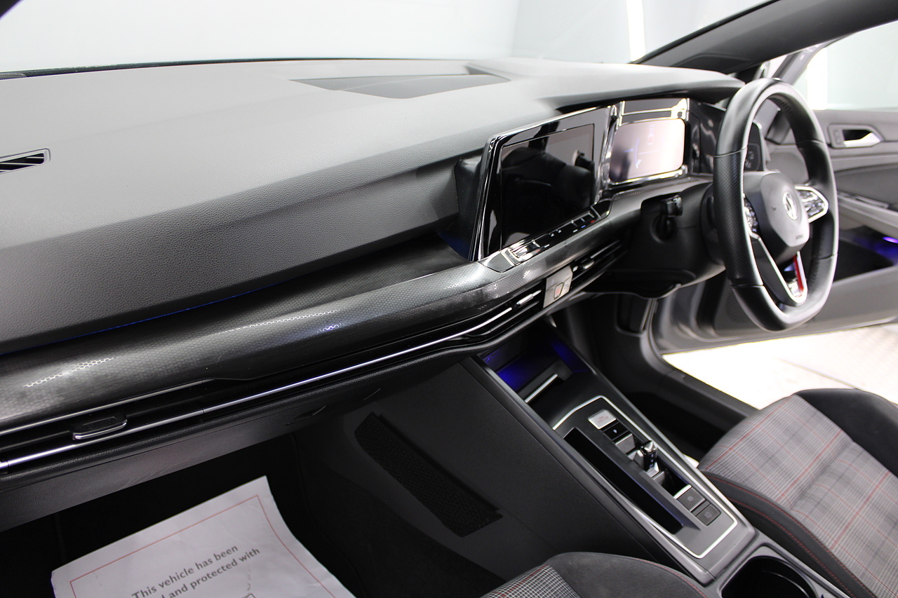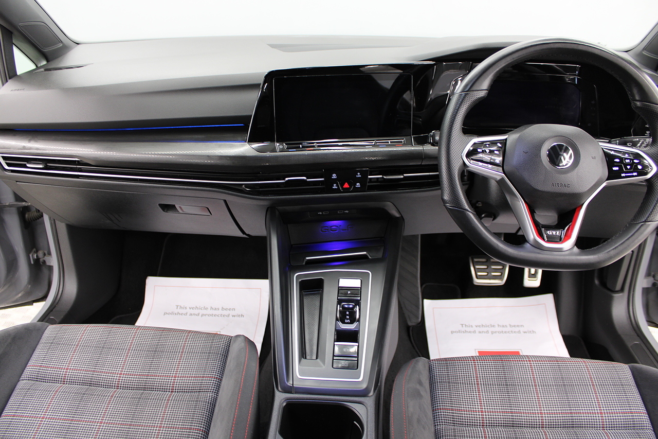 This particular model the 2021 GTI, comes with trimmed with patterned cloth interior recognisable from GTI's through the ages. In addition to full colour screen and premium sound system, DAB Radio, Satellite navigation, Bluetooth, apple car play and android auto, heated steering wheel, virtual cockpit display, handy driver aids such as rear parking sensors with rear camera and adaptive cruise control. This car really does pay homage to the MK1 GTI of the 80s, with premium and modern extras such as air conditioning and climate control, DAB radio with MP3 functionality, steering wheel mounted controls, giving it a modern look and feel inside the cabin.