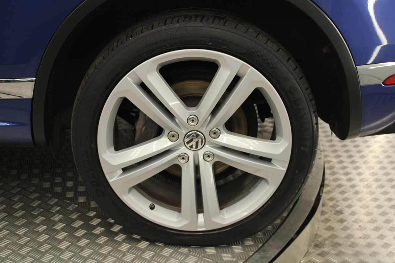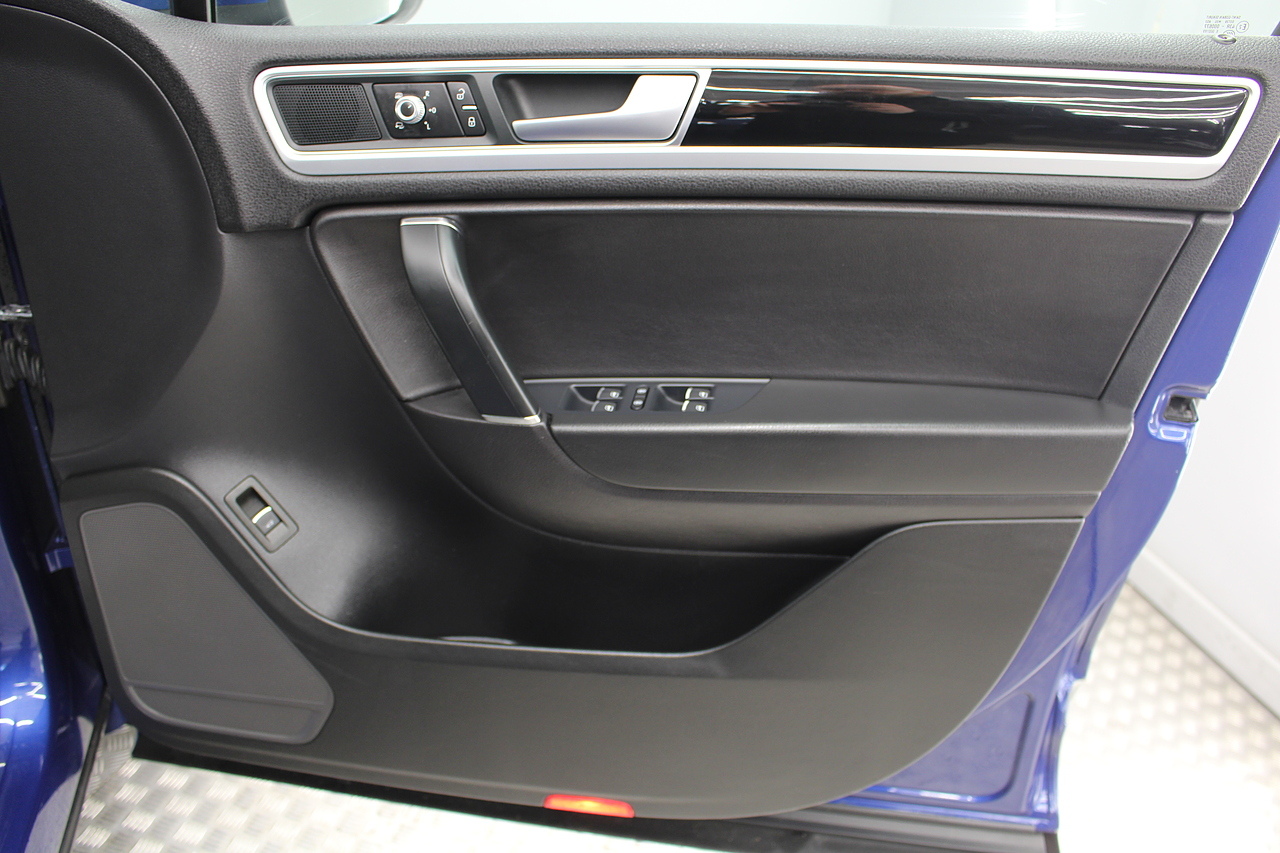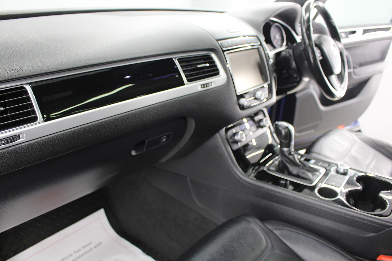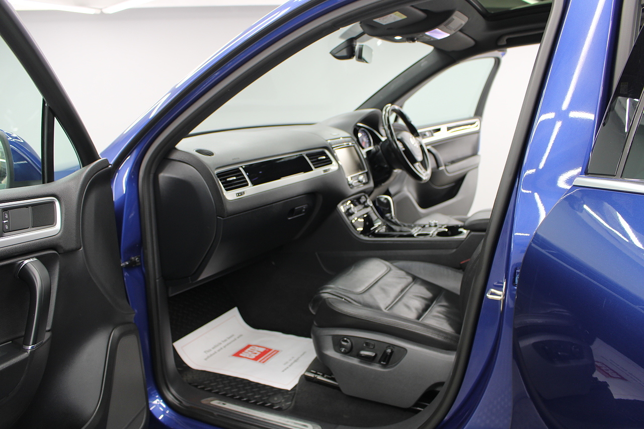 To the inside we have the full black leather interior with heated front seats, heated steering wheel, panoramic sunroof, satellite navigation, Bluetooth connectivity, front and rear parking sensors with rear camera, power operated tailgate, CD DAB radio with full colour touch screen and dark tinted rear windows. It should come as no surprise the Volkswagen Touareg is good to drive when you consider how closely related it is to the Porsche Cayenne.